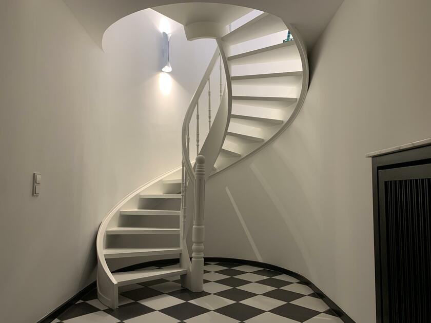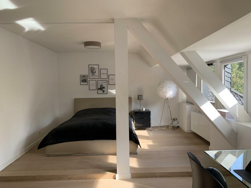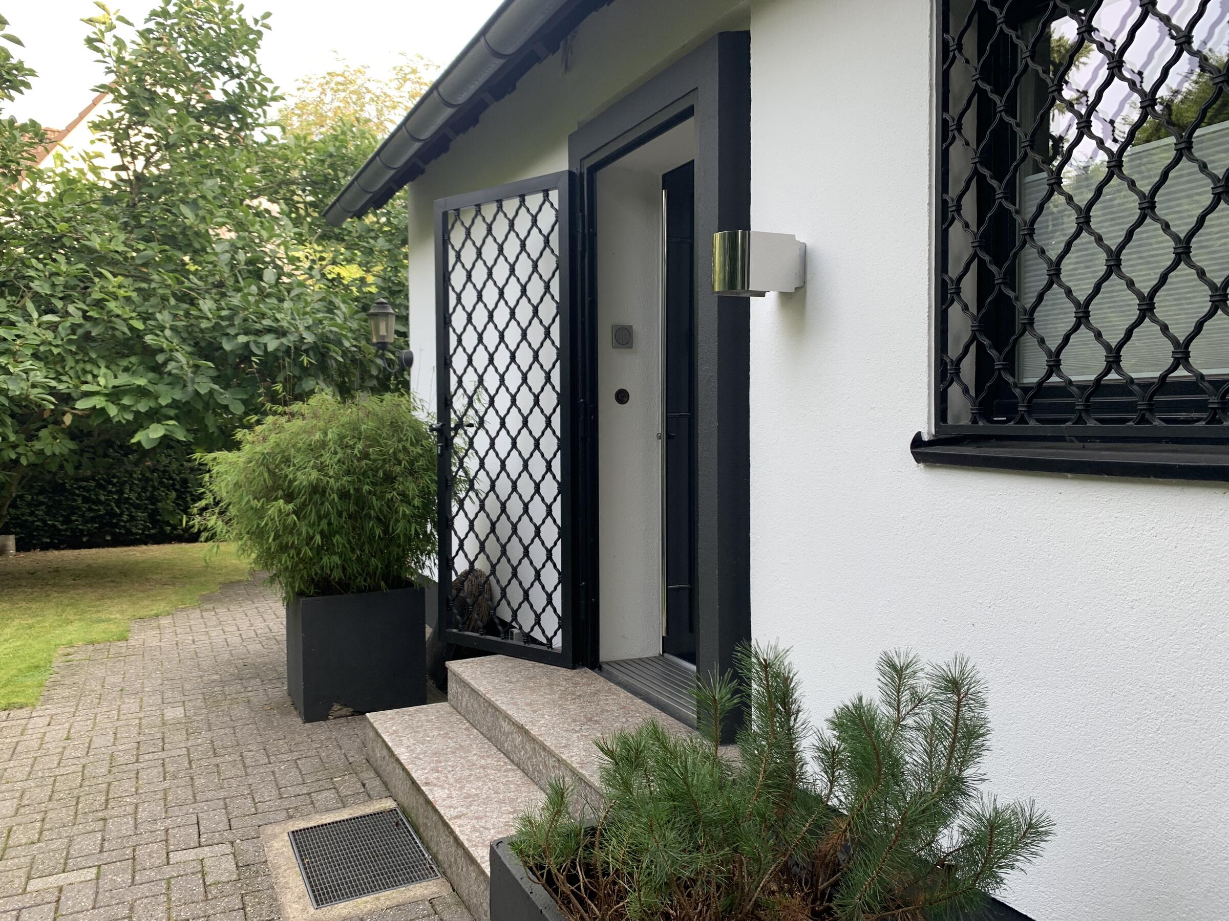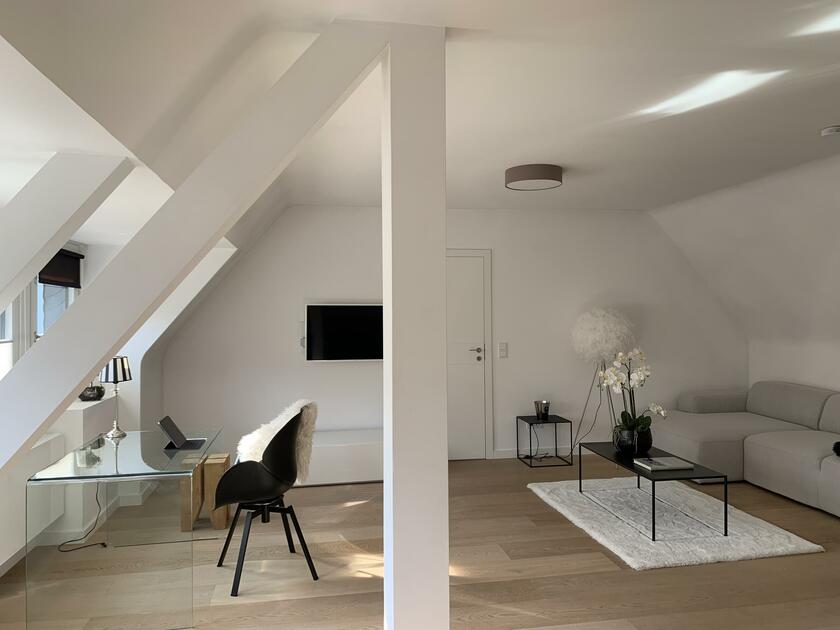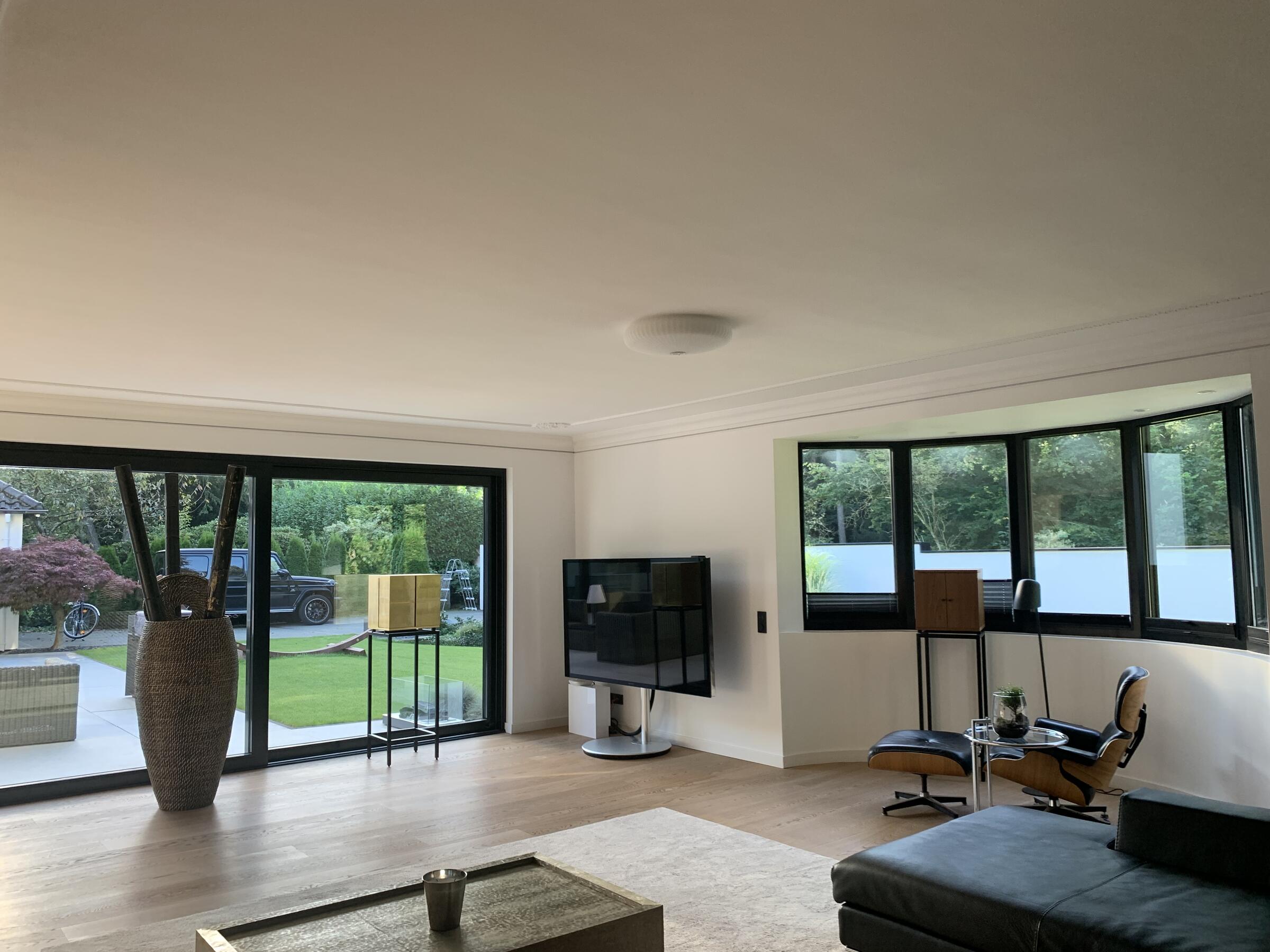 Die Villa befindet sich in Ratingen Hösel, in unmittelbarer Nähe zum Autobahnanschluss in Richtung Düsseldorf und Essen. 350 m² Wohnfläche erstrecken sich auf drei Ebenen, die durchgängig mit hellen Eichendielen verlegt sind. In den vier Bädern befinden sich raumhohe, großformatige Fliesen. Erdige Töne sowie eine klare schwarz- weiß Farbgebung in Kombination mit modernem Design bestimmen den Stil des Hauses und geben ihm Wohlfühlcharakter. Ein großer Fitnessbereich inklusive Sauna, Dusche und WC im Untergeschoss sind von außen zugängig und können neben zwei weiteren Räumen als Maske und Garderobe genutzt werden.