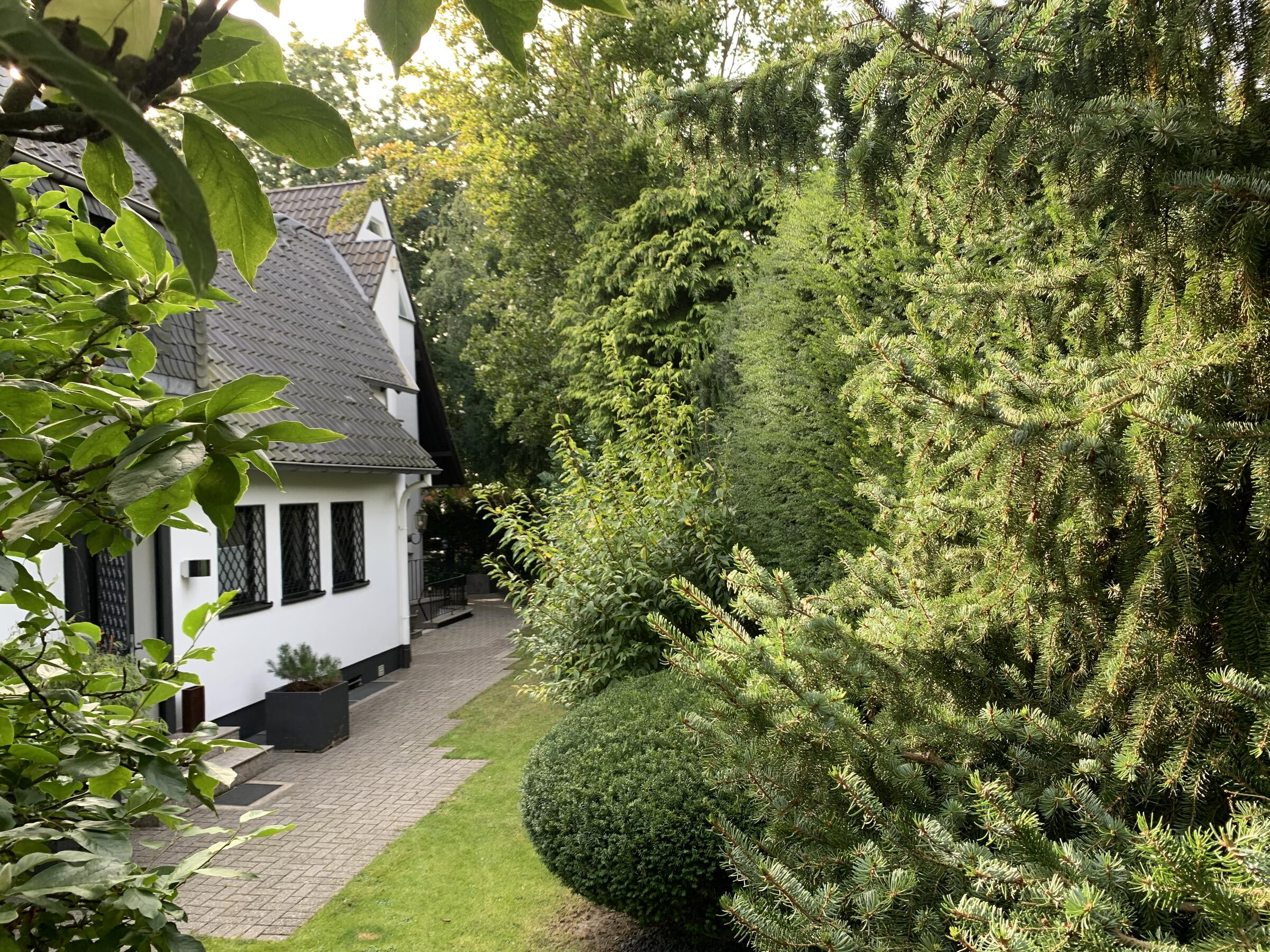 Die Grundstücksfläche beträgt 1000 m² und ist von altem Baumbestand sowie einer 30 m langen, an den Wald grenzenden Mauer umgeben. Im Bereich der großen Terrasse und des Gartens scheint die Sonne von früh bis spät. Parkplätze stehen in einer Vielzahl auf sowie unmittelbar vor dem Grundstück zur Verfügung.