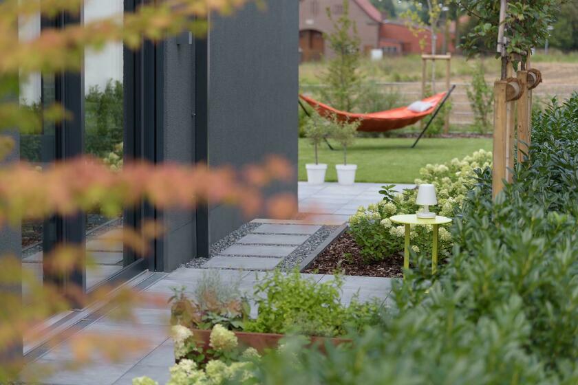 Die Außenfassade des Hauses ist auffällig in Anthrazit verputzt sowie mit Holz abgesetzt und von einem großen Garten umgeben. Das Haus bietet auch eine Dachterrasse, eine Haupt- und eine Nebenterrasse. Über die Garage, in der ein Starkstromanschluss vorhanden ist, erhält man direkten Zugang ins Haus und in den Garten. Parkmöglichkeiten für Pkw gibt es auf der hauseigenen Einfahrt sowie auf den öffentlichen Parkplätzen direkt vor dem Haus. Größere Fahrzeuge können am nahen Feldrand geparkt werden. Die Immobilie ist sehr gut an die Autobahn und Deutsche Bahn angebunden.