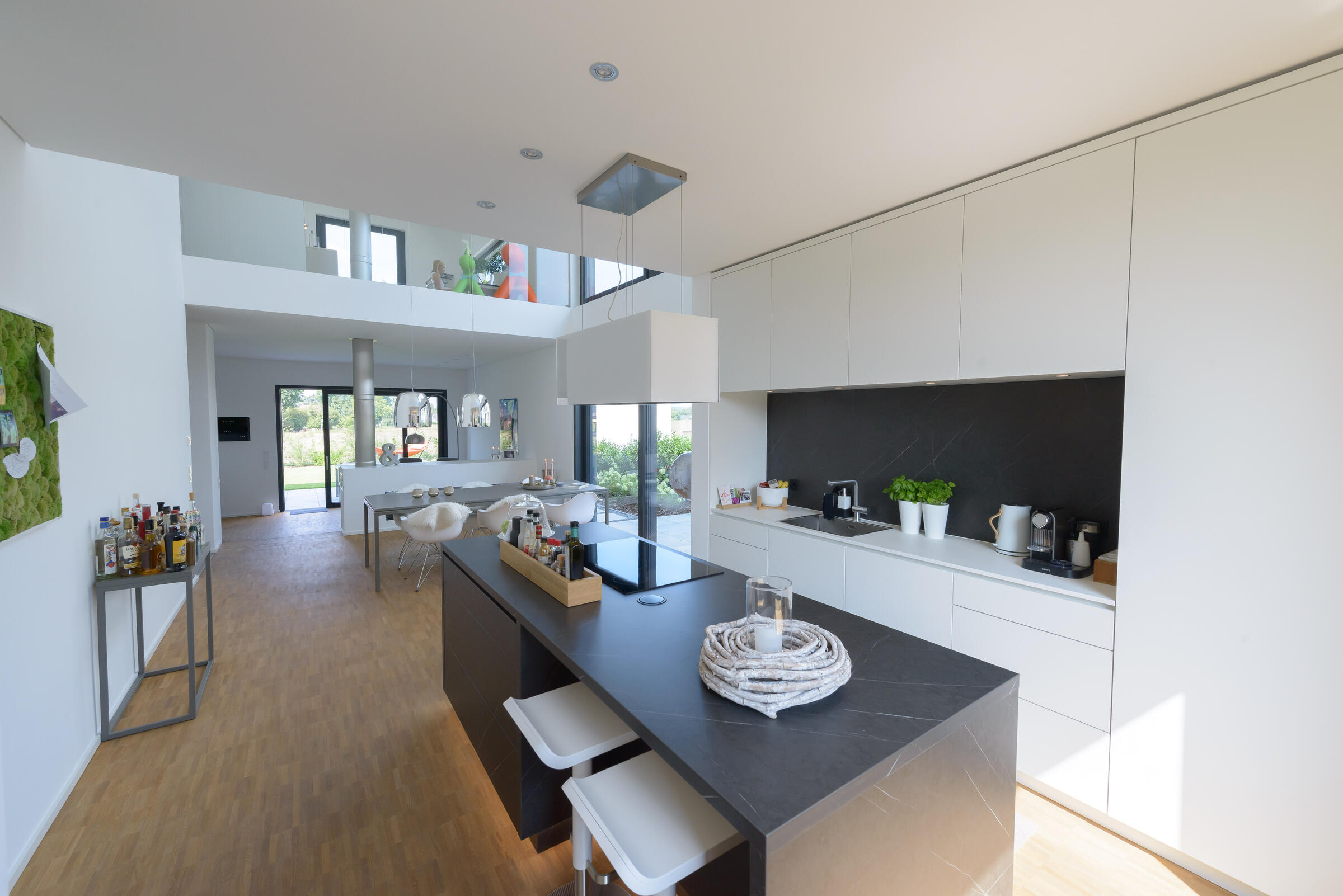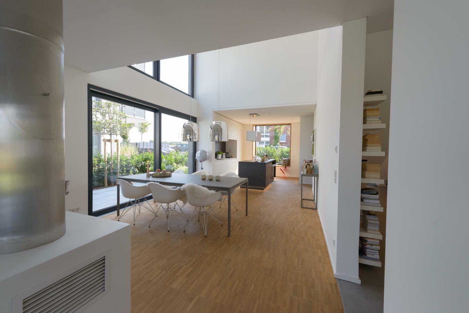 Das charakterstarke, großzügige und moderne Einfamilienhaus im Bauhausdesign mit Lage im Ruhrgebiet zeichnet sich durch einen gehobenen und modernen Bau- und Einrichtungsstil aus. Die Wände der lichtdurchfluteten Räume sind weiß und glatt verputzt. Die Oberböden sind mit Spachtel-Esstrich und Parkett ausgelegt. Das Erdgeschoss ist von einem großzügigen und offen gestaltetem Wohn- und Essbereich geprägt, der durch einen Luftraum besticht und zudem über einen großen Kamin verfügt. Im 1. Geschoss sowie im Obergeschoss stehen separate Aufenthaltsräume für Team, Maske und Garderobe zur Verfügung. Es befindet sich ein Bad bzw. Gäste-Bad auf jeder Ebene.