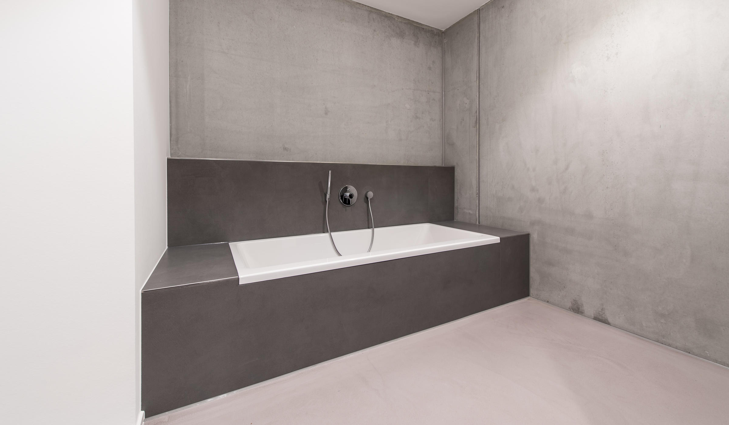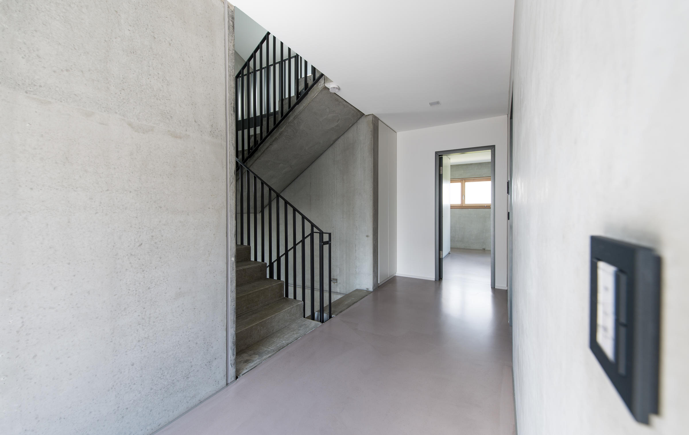 Der Boden besteht aus Holzböden oder glattgestrichenem Estrich, die Wände zeigen sich weitgehend unverputzt. Die Haustechnik sowie Armaturen entsprechen dem hochwertigen Standard des Hauses.