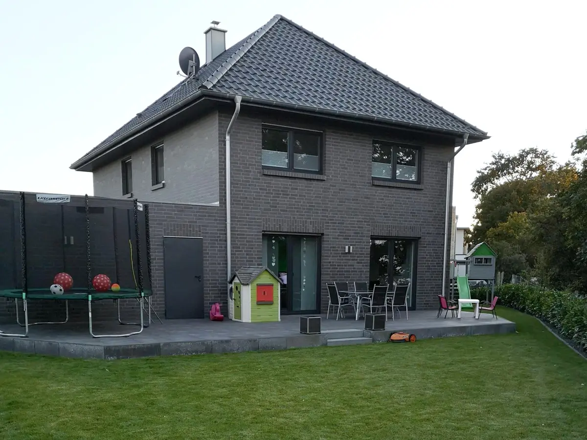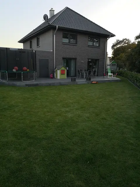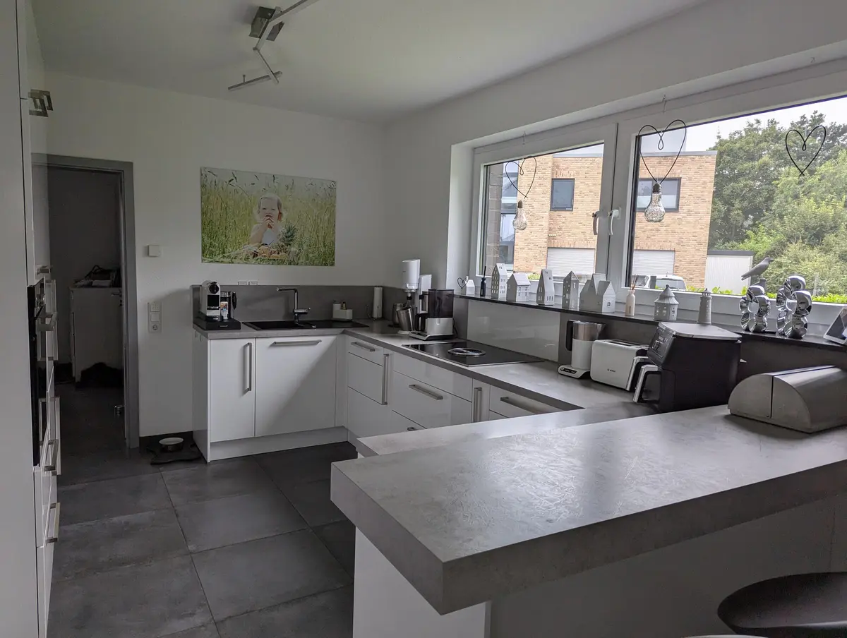 Im familienfreundlichen Neubaugebiet von Rheinberg-Budberg finden Sie unser großzügig gebautes Einfamilienhaus mit großen Garten. Im modernen Stil und voll gefliest, bietet unser Haus das perfekte Umfeld zur Darstellung aktueller, stilbewusster Familien. Der großzügige Eingangsbereich mit gefliester Betontreppe und Ambientebeleuchtung lädt sofort zum Verbleiben ein - hier kann beispielsweise auch diverses Equipment abgelegt werden, ohne die Kulisse verwenden zu müssen. Von dort erreicht man die Küche und den Wohn-Essbereich, die miteinander verbunden sind. Der Wohn-Essbereich ist L-förmig gestaltet, sodass aus dem einen Teilbereich in den anderen gefilmt oder fotografiert werden kann, da größere Abstände problemlos erreicht werden können. Die ca. 15 m² große Küche besitzt keine Hängeschränke, sondern über dem Kochbereich ein über 2 m breites Fenster, aus dem man in den Garten, z.B. auf das Klettergerüst schauen kann. Zum einen ist sie hell, zum anderen besteht die Möglichkeit, sich am Ende der Küche am aufgesetzten Tisch zu platzieren und somit Abstände herzustellen.