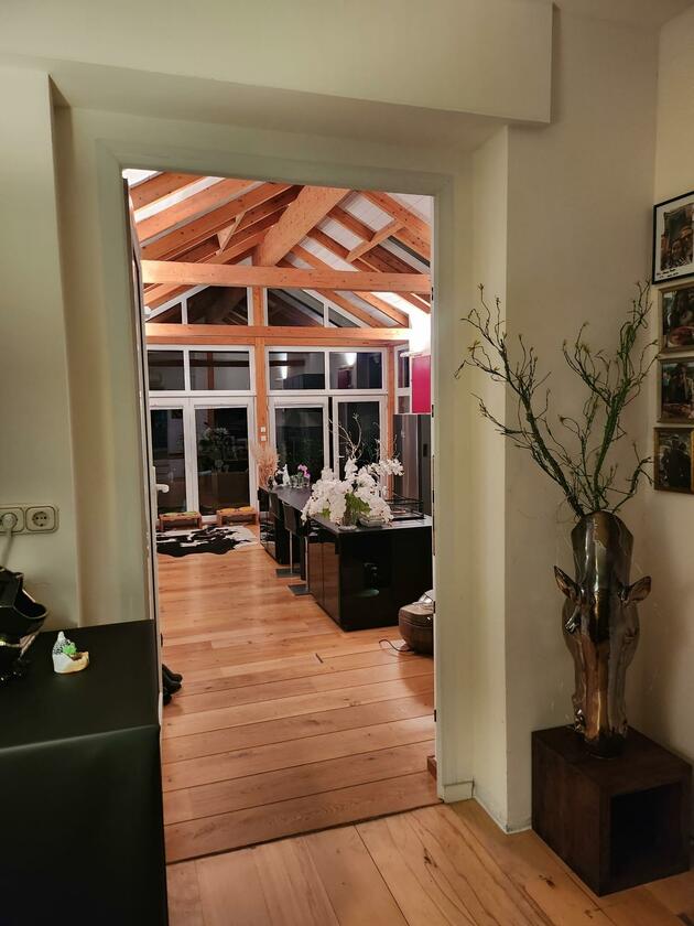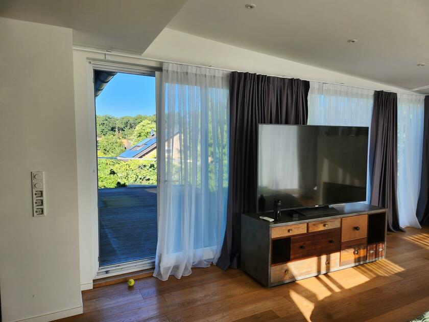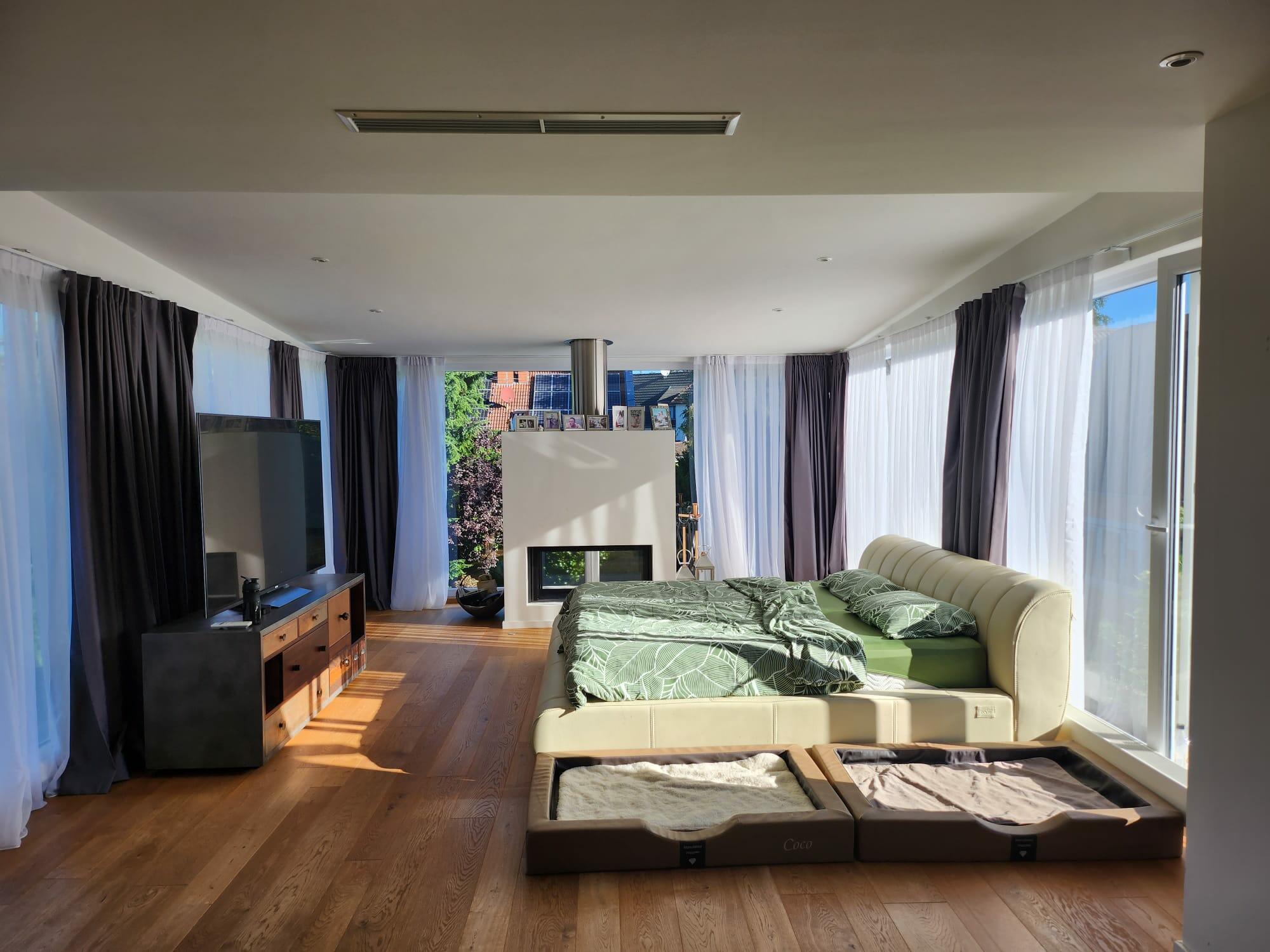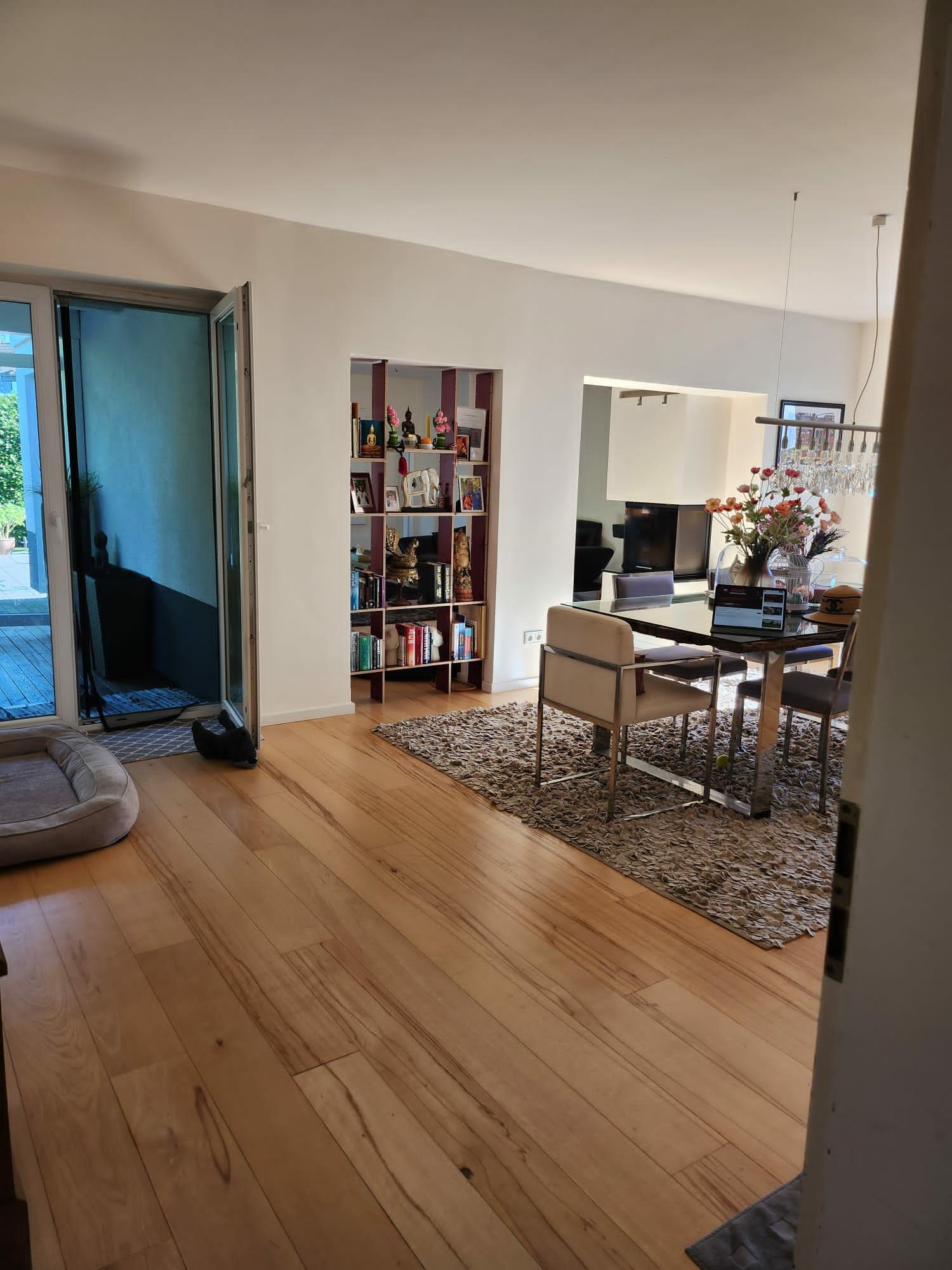 Unser modern ausgestattetes Haus befindet sich in einer ruhigen Wohngegend. Die Räume sind zeitgemäß und funktional eingerichtet. Im Wohnzimmer befindet sich ein offener Tunnelkamin. Die modern ausgestattete Küche verfügt über eine große Kücheninsel. Auf den Böden der Wohnbereiche sind hochwertige Buchenholzdielen verlegt. Die teilweise bodentiefen Fenster können mit Rollläden und Jalousien verdunkelt werden. Im Außenbereich können unsere Terrassen, der Salzwasserpool und der Garten genutzt werden. Auf unserem Grundstück stehen 4 Pkw-Stellplätze zur Verfügung. Weitere Stellflächen gibt es auf der Anliegerstraße.