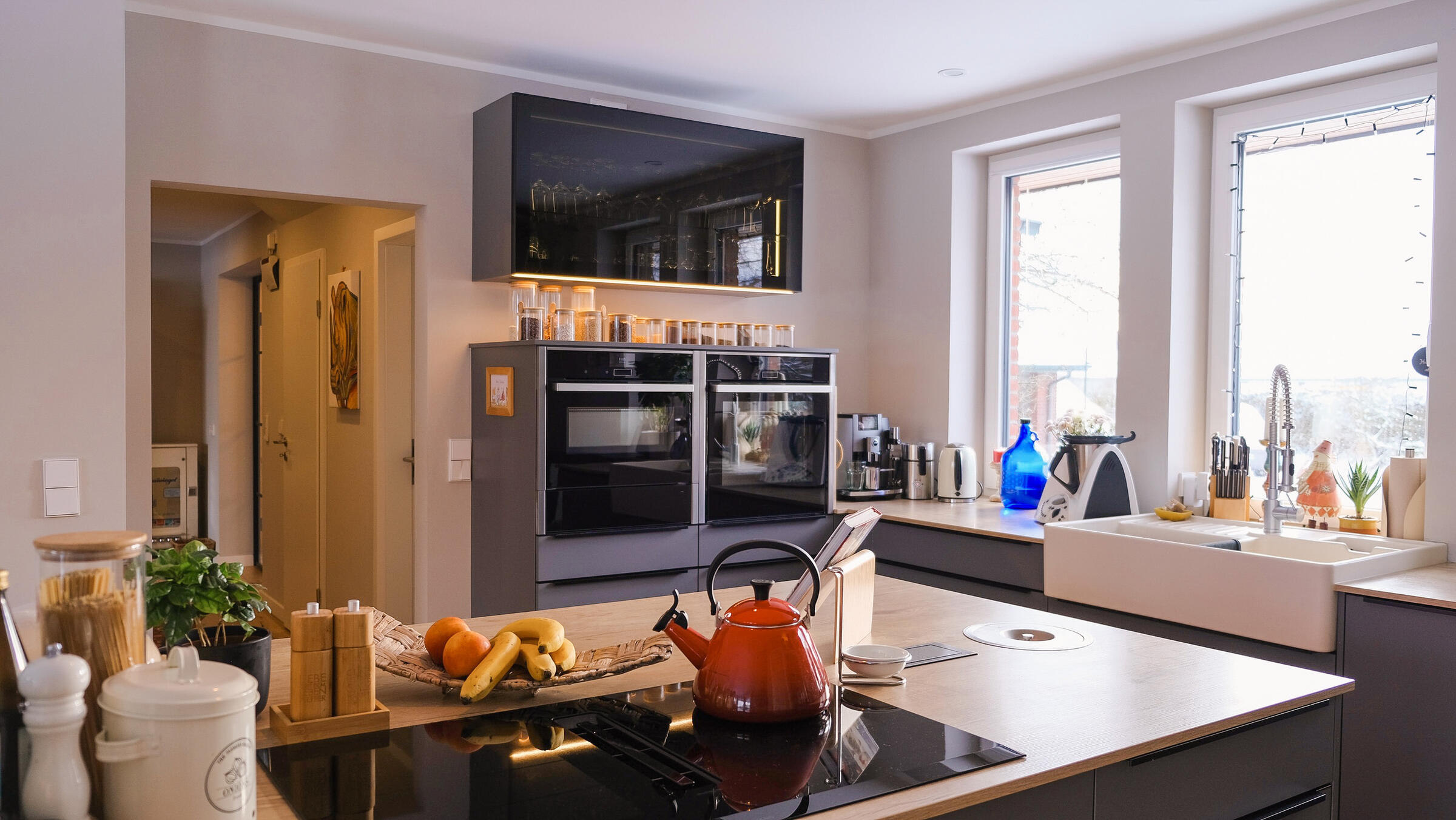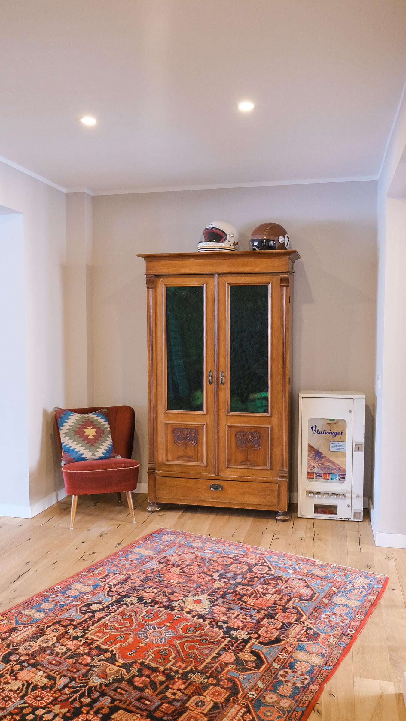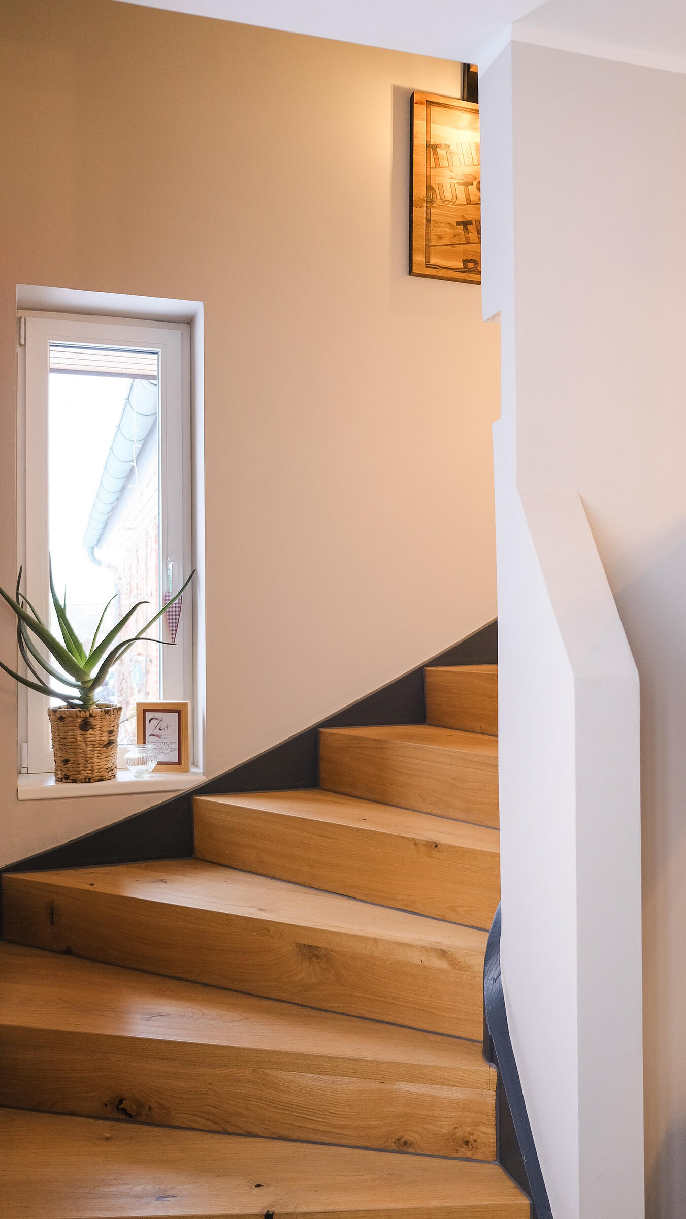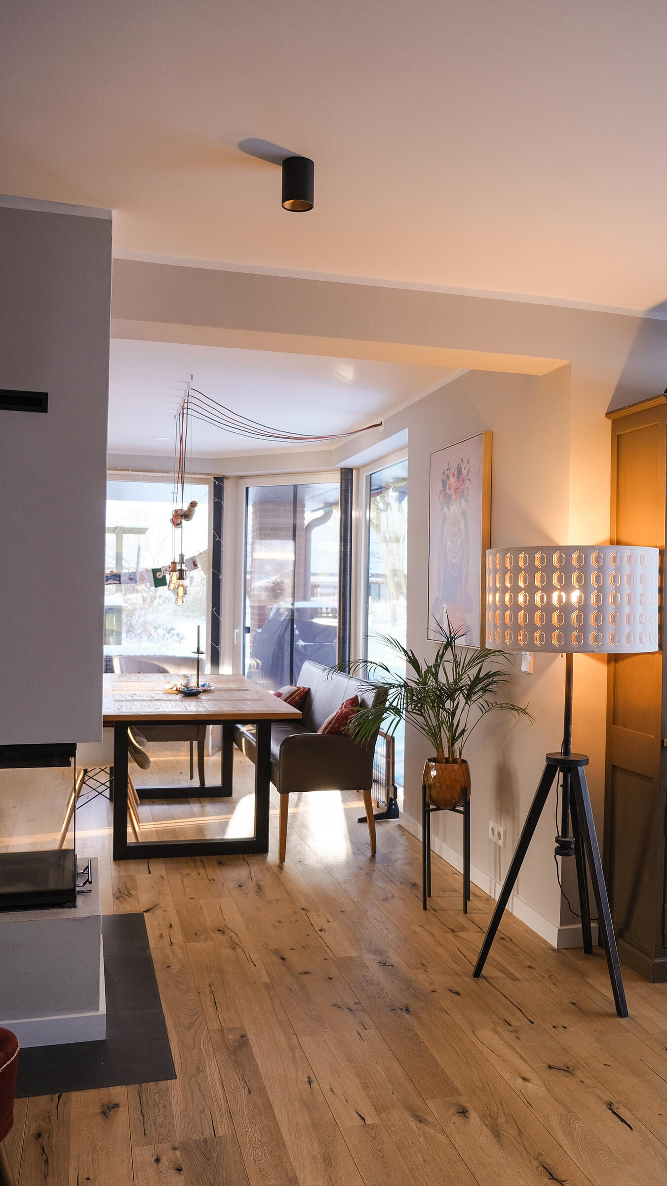 Unser freistehendes Einfamilienhaus mit seinem charakteristischen Spitzgiebel wurde im Jahr 2020 mit viel Liebe kernsaniert und modernisiert. Im Erdgeschoss wurden die Räume geöffnet und ein 270°-Kamin als Blickfang zwischen Ess- und Wohnzimmer platziert. Im Wohnbereich des Untergeschosses befindet sich, mit Ausnahme des graugefliesten Eingangsbereichs, der Gästetoilette und des Hauswirtschaftraumes, geöltes Eichenparkett in einer sehr besonderen Optik. Direkt an das Wohn- und Esszimmer grenzt die anthrazitfarbene, offene Küche mit einer großen Kochinsel im Zentrum. Eine Abstellkammer, ein Hauswirtschaftsraum bzw. Speisekammer, eine ausgefallen tapezierte Gästetoilette, sowie der Zugang zur Praxis und zum Keller sind ebenfalls im Erdgeschoss verortet. Rundherum befinden sich zahlreiche Fenster, die die Räume lichtdurchfluten und sich zum Garten und der Feldrandlage bodentief und groß dimensioniert öffnen, um den Blick über die nordwestlich gelegenen Wiesen und Hügel freizugeben. Hinter der doppelflügeligen Eingangstür bilden Flur und die Diele den großzügigen Eingangsbereich, der von einer modernen, schwarzen Lofttür getrennt wird und viel Platz für eventuelle Technik bietet.