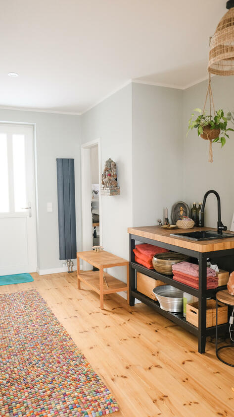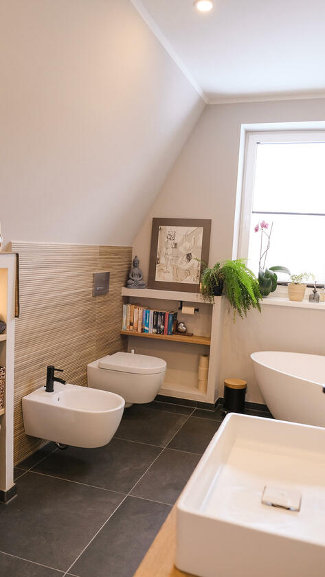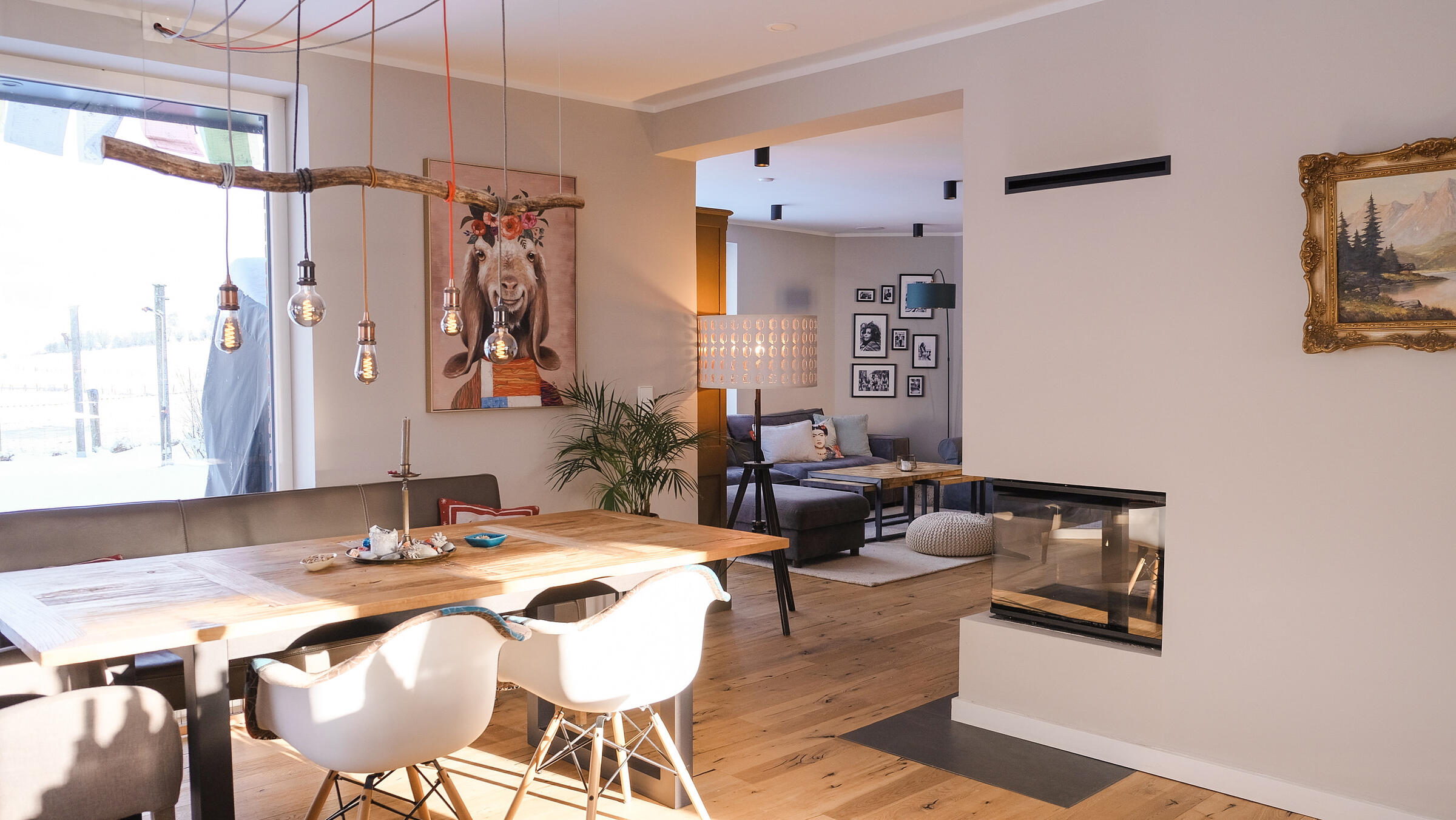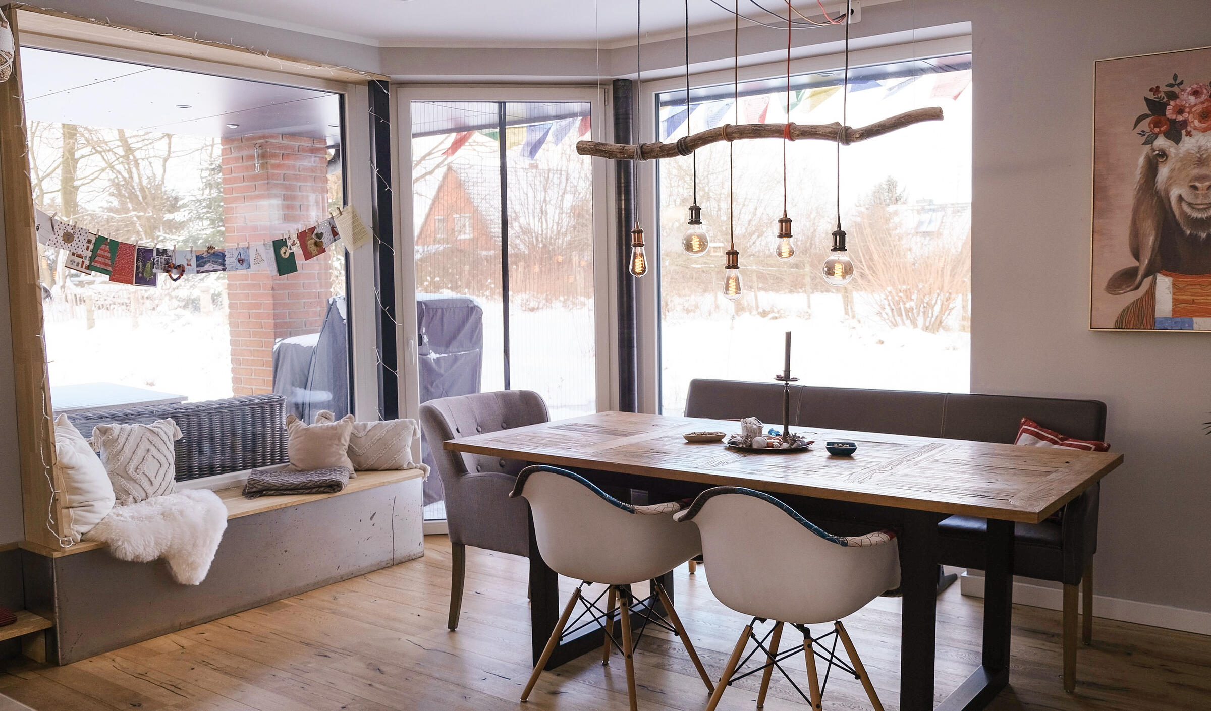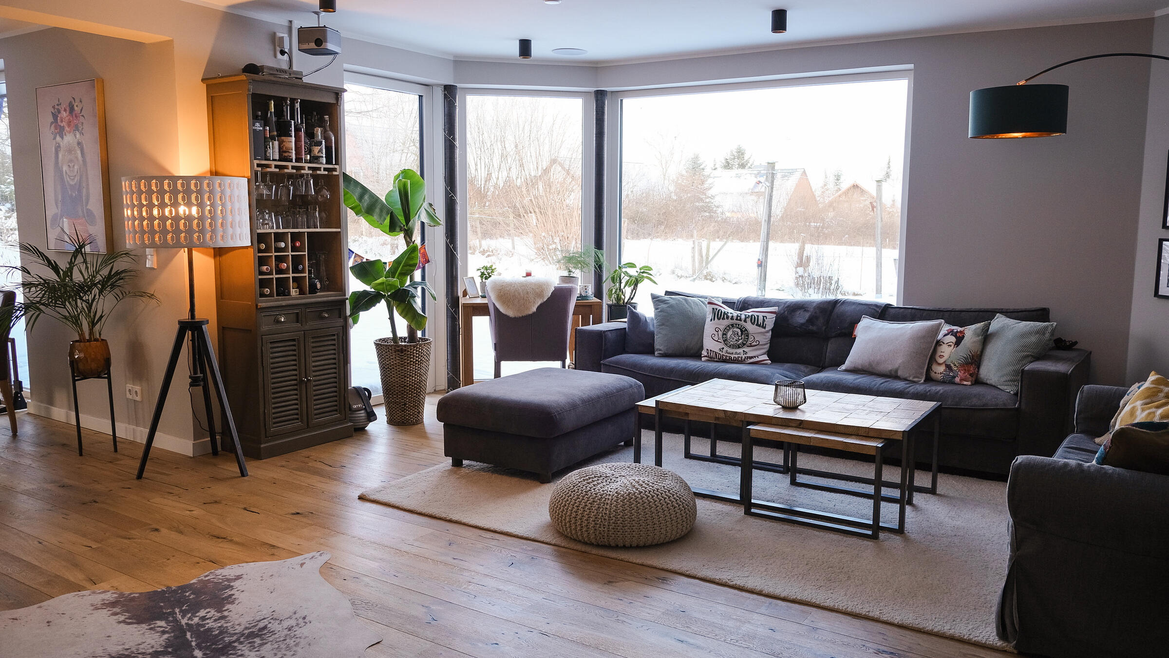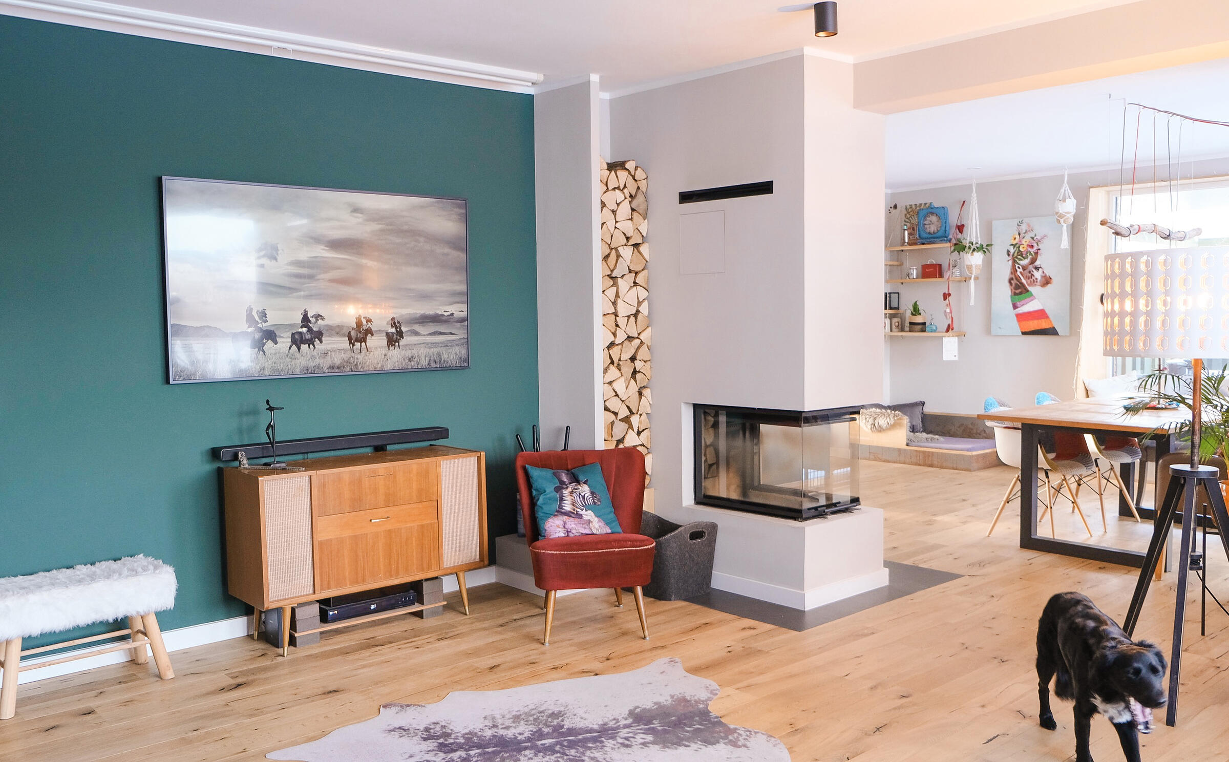 Unser freistehendes Einfamilienhaus mit seinem charakteristischen Spitzgiebel wurde im Jahr 2020 mit viel Liebe kernsaniert und modernisiert. Im Erdgeschoss wurden die Räume geöffnet und ein 270°-Kamin als Blickfang zwischen Ess- und Wohnzimmer platziert. Im Wohnbereich des Untergeschosses befindet sich, mit Ausnahme des graugefliesten Eingangsbereichs, der Gästetoilette und des Hauswirtschaftraumes, geöltes Eichenparkett in einer sehr besonderen Optik. Direkt an das Wohn- und Esszimmer grenzt die anthrazitfarbene, offene Küche mit einer großen Kochinsel im Zentrum. Eine Abstellkammer, ein Hauswirtschaftsraum bzw. Speisekammer, eine ausgefallen tapezierte Gästetoilette, sowie der Zugang zur Praxis und zum Keller sind ebenfalls im Erdgeschoss verortet. Rundherum befinden sich zahlreiche Fenster, die die Räume lichtdurchfluten und sich zum Garten und der Feldrandlage bodentief und groß dimensioniert öffnen, um den Blick über die nordwestlich gelegenen Wiesen und Hügel freizugeben. Hinter der doppelflügeligen Eingangstür bilden Flur und die Diele den großzügigen Eingangsbereich, der von einer modernen, schwarzen Lofttür getrennt wird und viel Platz für eventuelle Technik bietet.