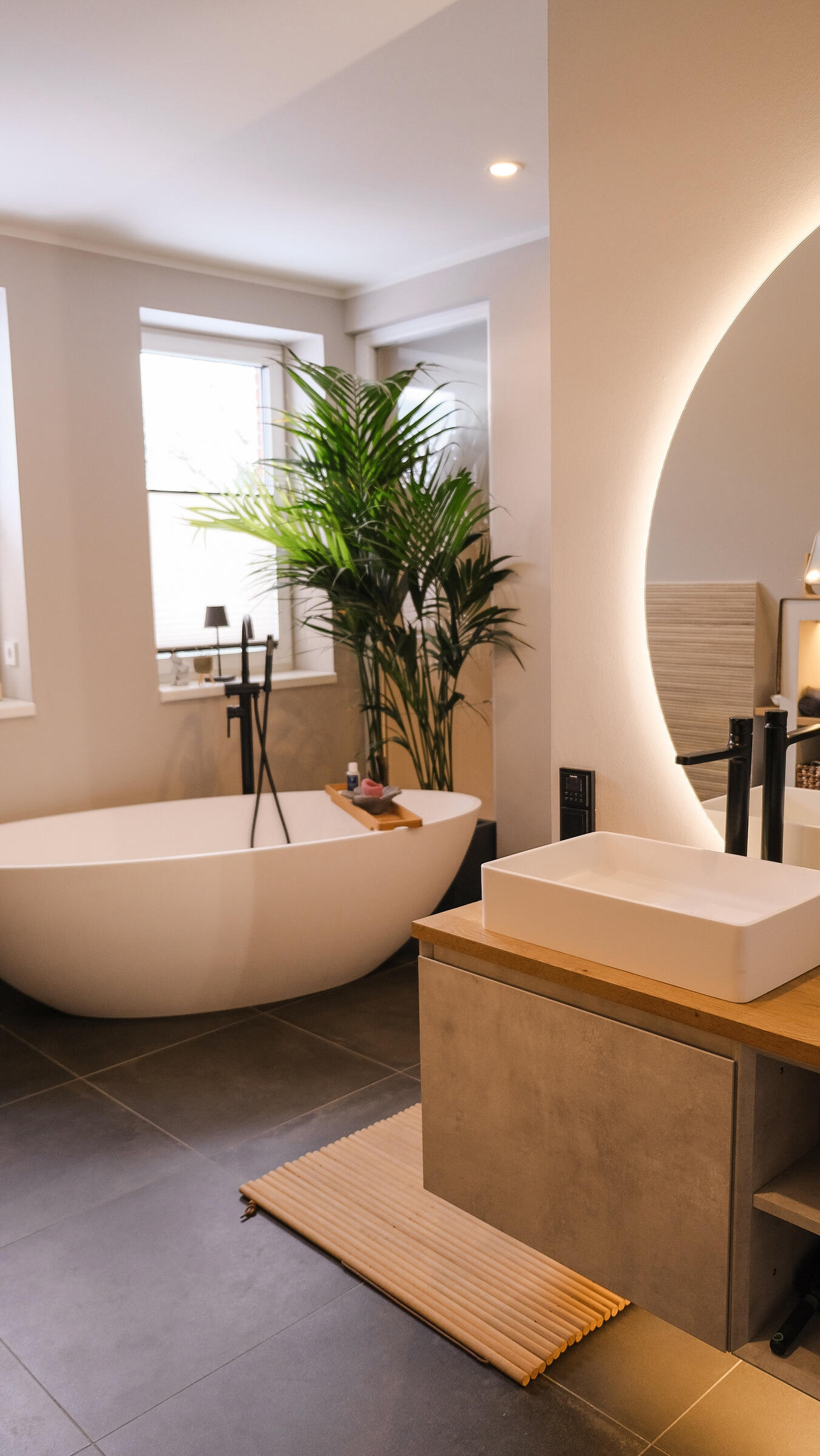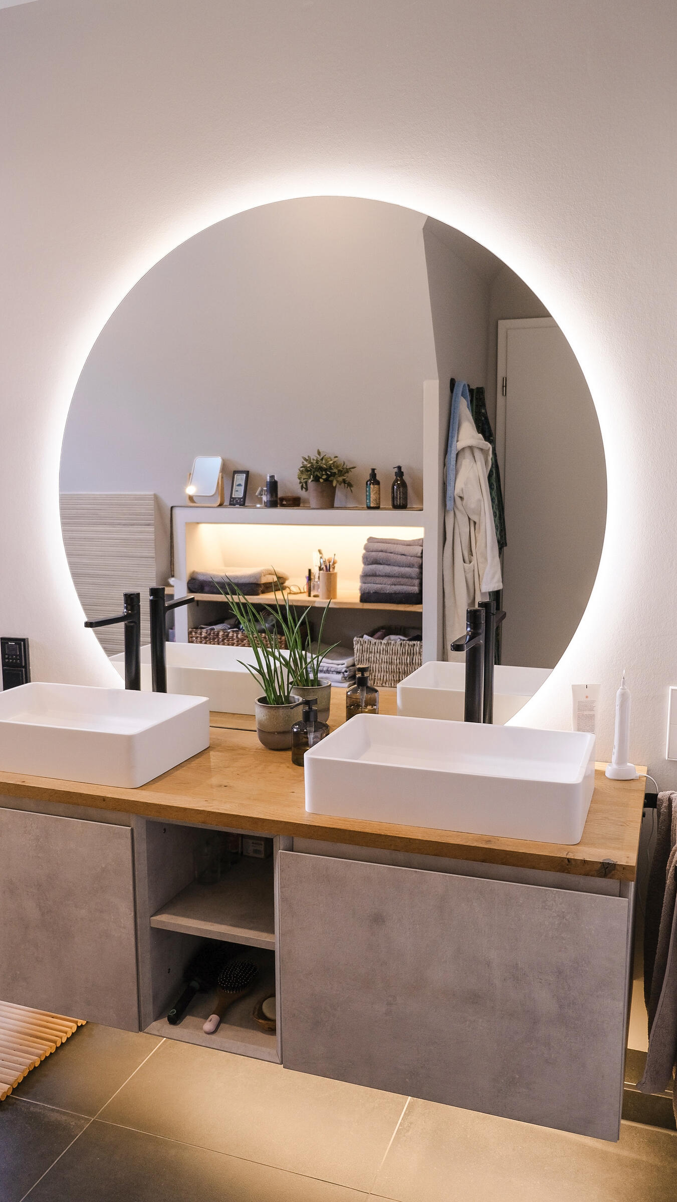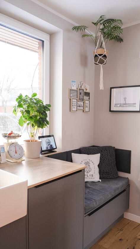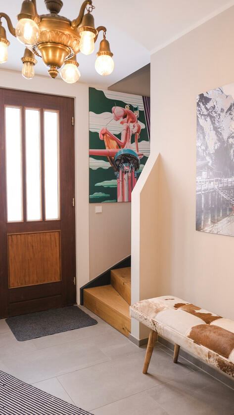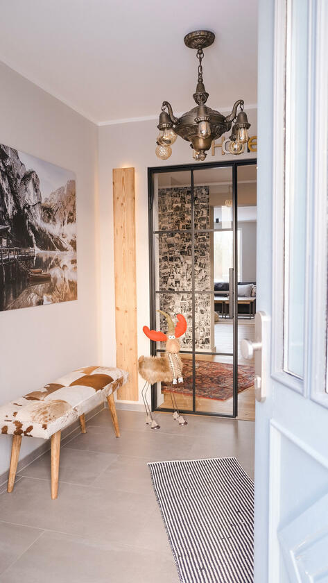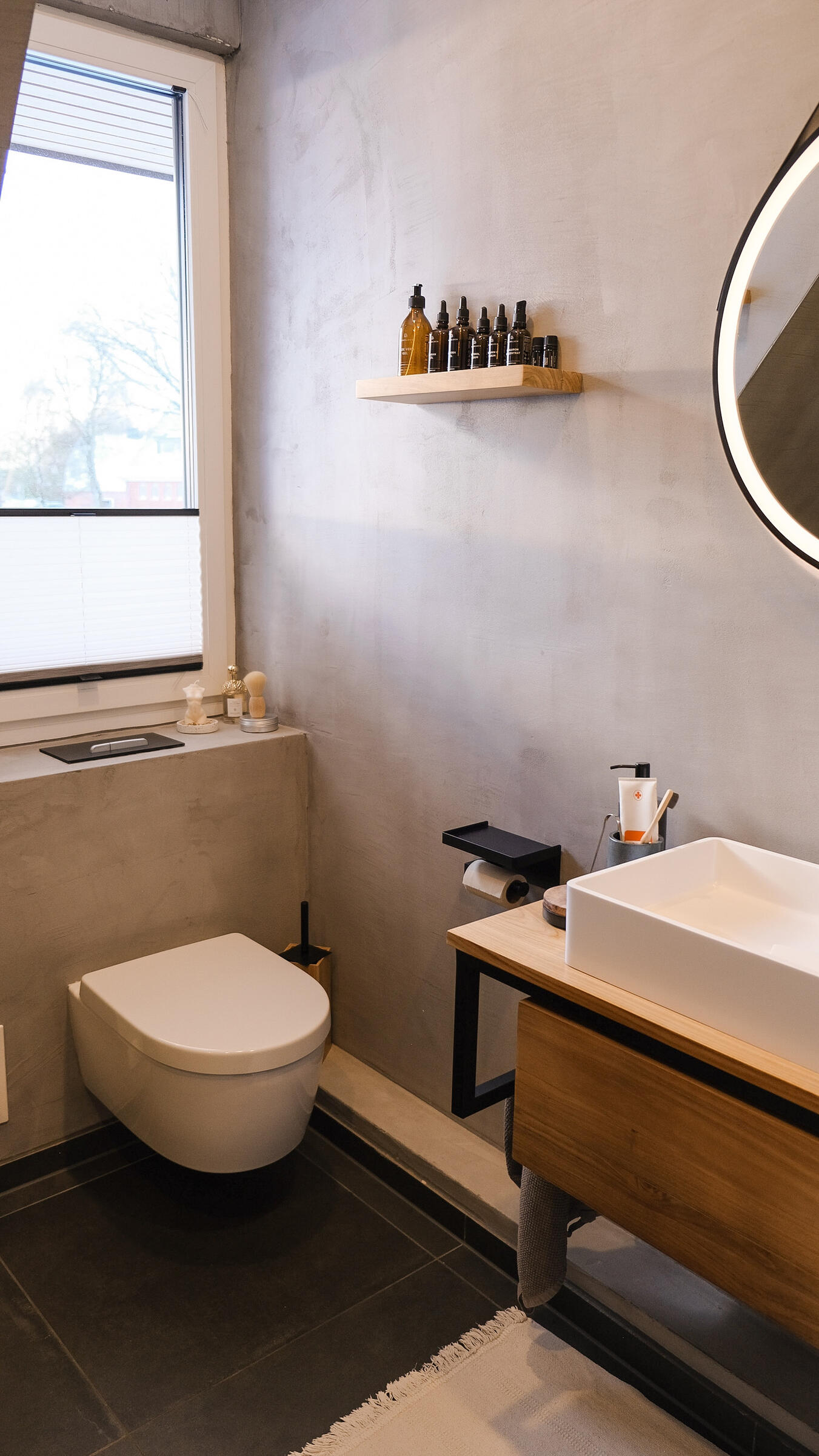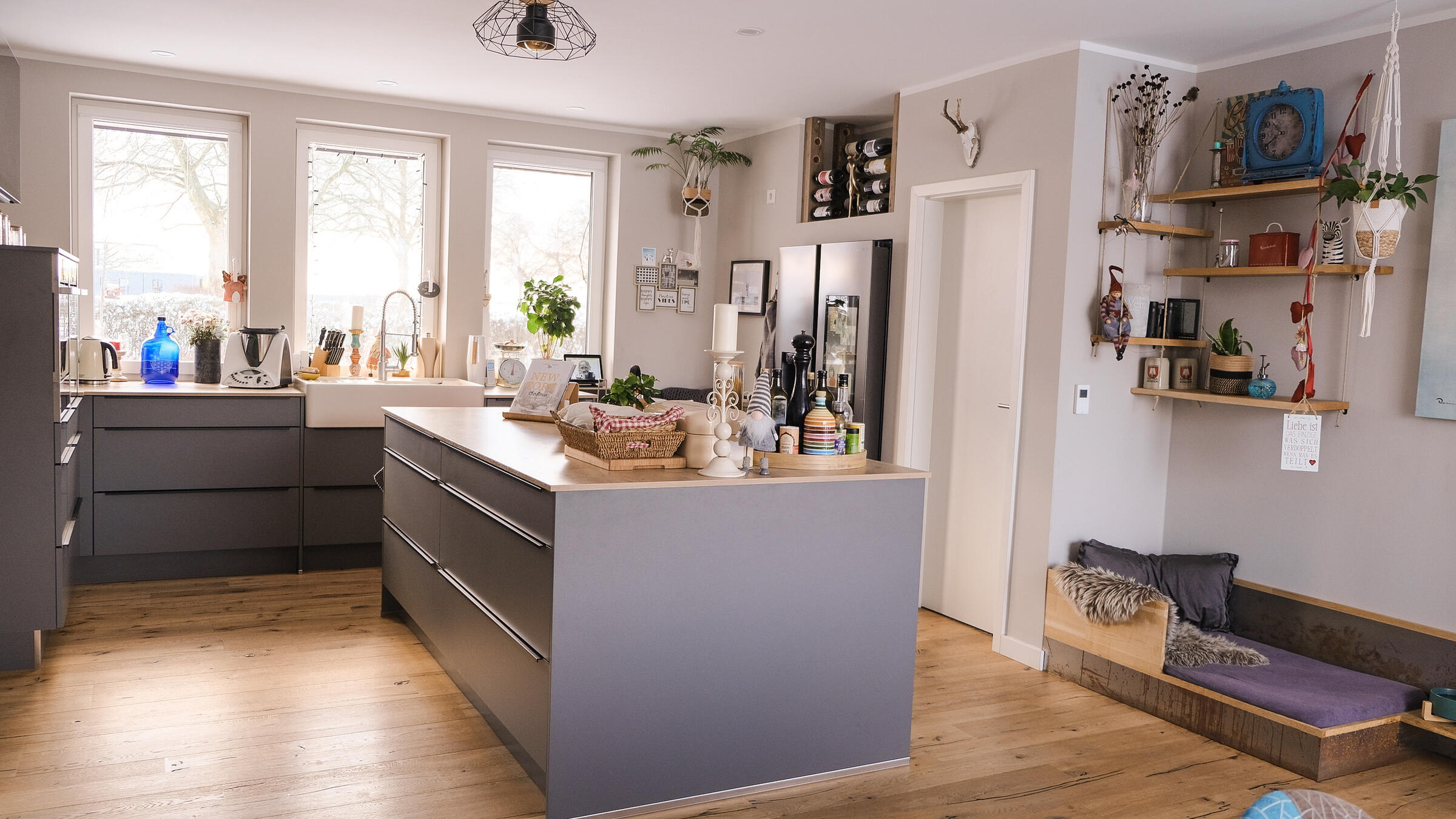 Unser freistehendes Einfamilienhaus mit seinem charakteristischen Spitzgiebel wurde im Jahr 2020 mit viel Liebe kernsaniert und modernisiert. Im Erdgeschoss wurden die Räume geöffnet und ein 270°-Kamin als Blickfang zwischen Ess- und Wohnzimmer platziert. Im Wohnbereich des Untergeschosses befindet sich, mit Ausnahme des graugefliesten Eingangsbereichs, der Gästetoilette und des Hauswirtschaftraumes, geöltes Eichenparkett in einer sehr besonderen Optik. Direkt an das Wohn- und Esszimmer grenzt die anthrazitfarbene, offene Küche mit einer großen Kochinsel im Zentrum. Eine Abstellkammer, ein Hauswirtschaftsraum bzw. Speisekammer, eine ausgefallen tapezierte Gästetoilette, sowie der Zugang zur Praxis und zum Keller sind ebenfalls im Erdgeschoss verortet. Rundherum befinden sich zahlreiche Fenster, die die Räume lichtdurchfluten und sich zum Garten und der Feldrandlage bodentief und groß dimensioniert öffnen, um den Blick über die nordwestlich gelegenen Wiesen und Hügel freizugeben. Hinter der doppelflügeligen Eingangstür bilden Flur und die Diele den großzügigen Eingangsbereich, der von einer modernen, schwarzen Lofttür getrennt wird und viel Platz für eventuelle Technik bietet.