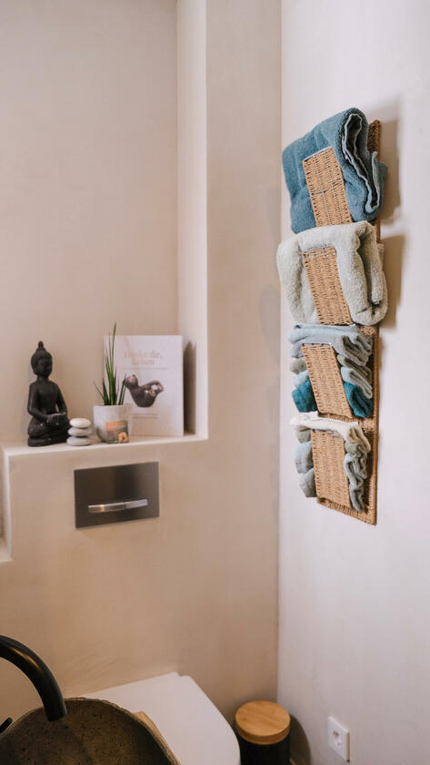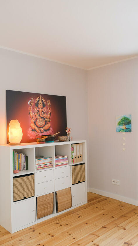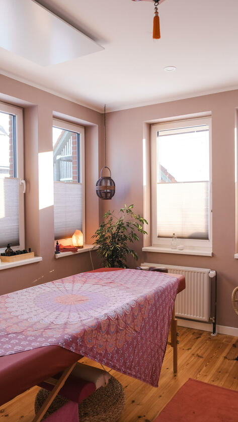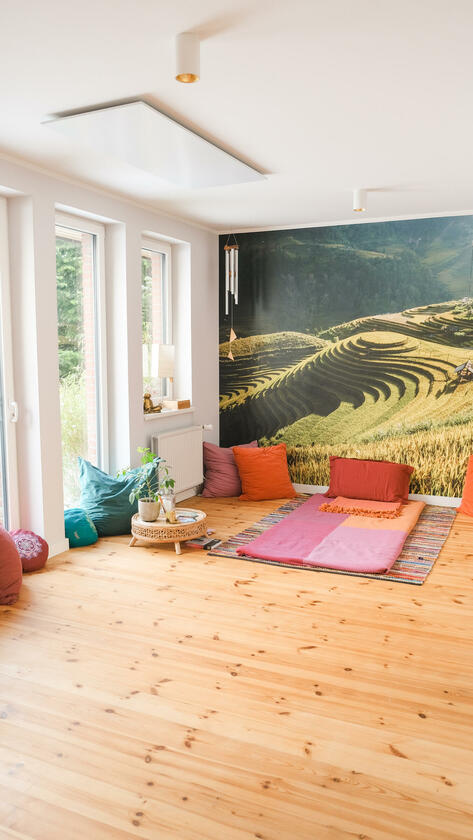 Die 40 m² große Ayurvedische Praxis befindet sich im Ostflügel des Hauses und kann durch einen separaten Eingang oder eine Verbindungstüre im Wohnzimmer betreten werden. Die Praxisräume bestehen aus einem Gruppenraum zum Garten, einem kleinen Massageraum, einem Vorflur mit schwarzer Lofttür und einem kleinen Bad mit Dusche.