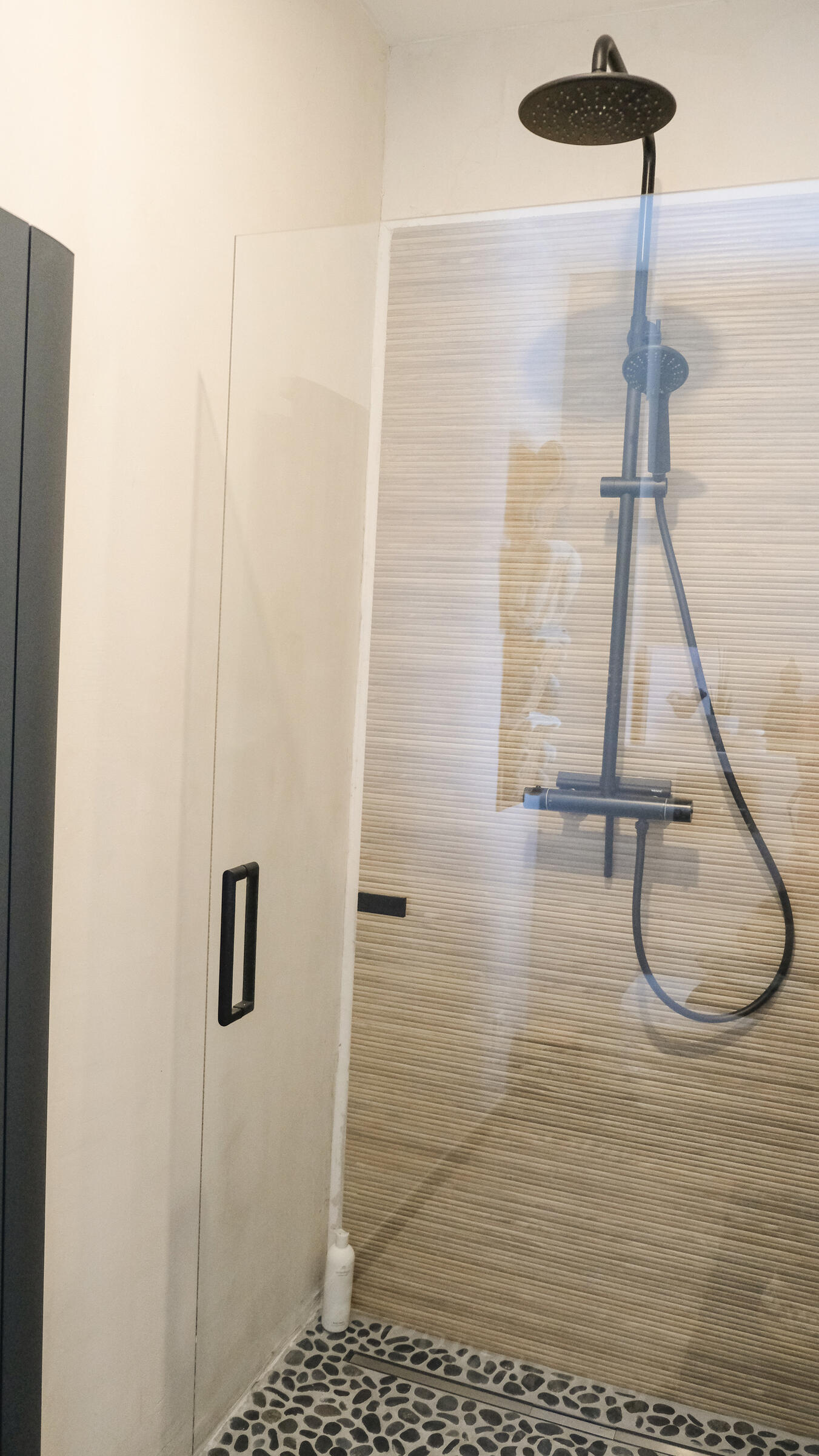 Der Westflügel auf der linken Seite besitzt ein Badezimmer mit begehbarer Dusche, ein großes Gästezimmer und ein Schlafzimmer, die durch eine Schiebetüre aus Holz getrennt sind.