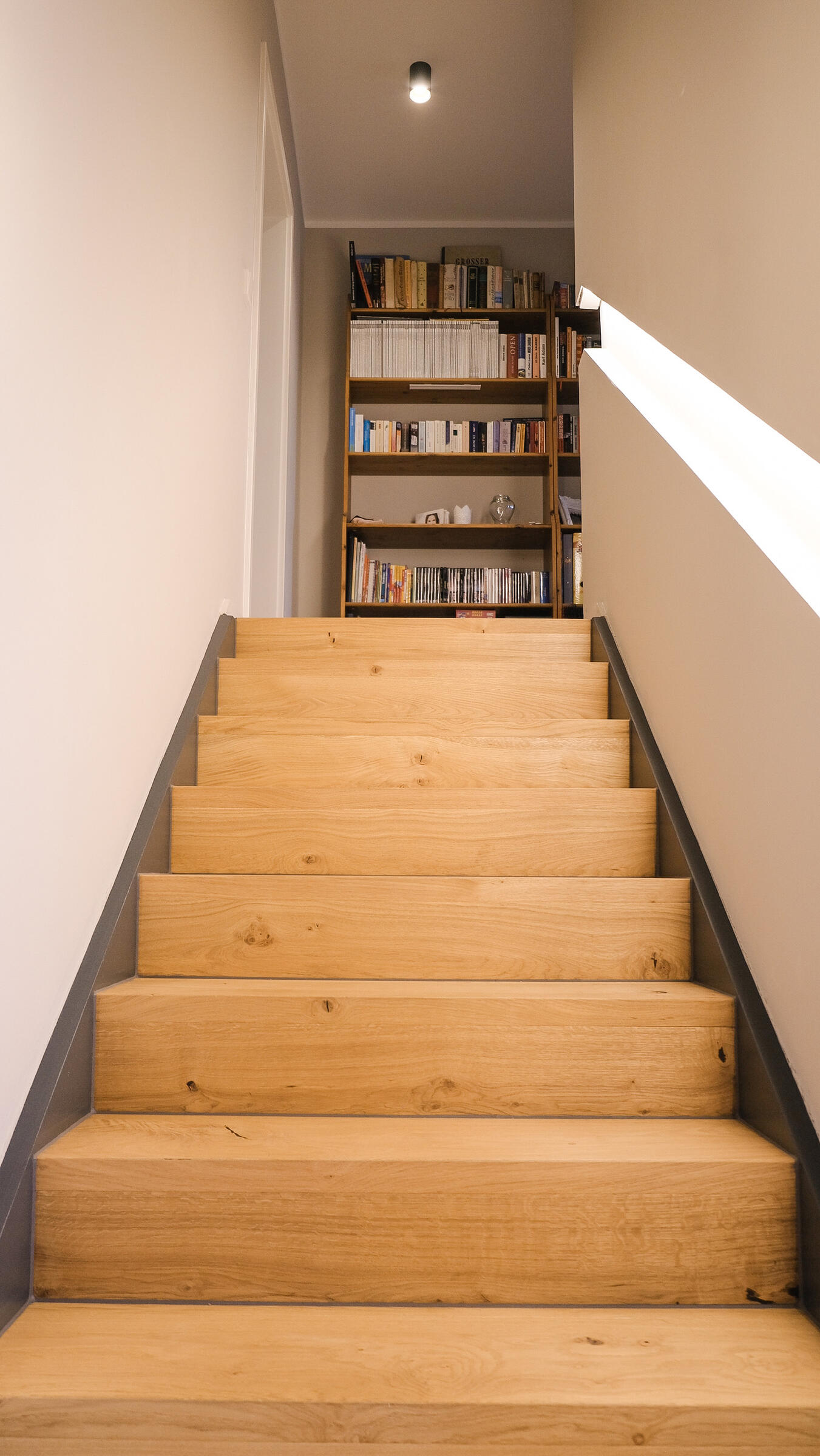 Im gesamten Obergeschoss, mit Ausnahme der Bäder, ist Eichenparkett verlegt und befinden sich Schrägen, die von einer großen Gaube zum Garten und drei Gauben zur Front aufgelockert werden. Auch im OG sind viele Fenster verbaut, die zur 12 m² großen Dachterrasse auf der Feldrandseite mit Terrassentüren ergänzt werden.