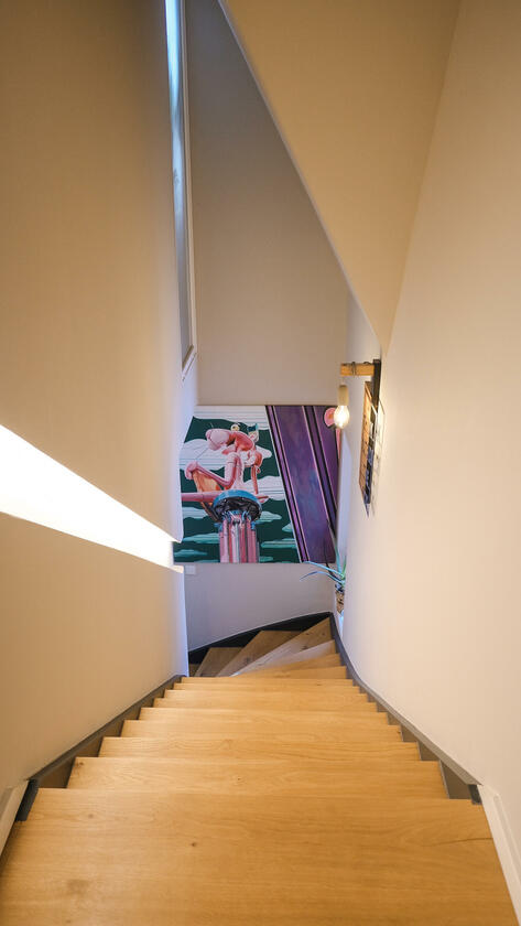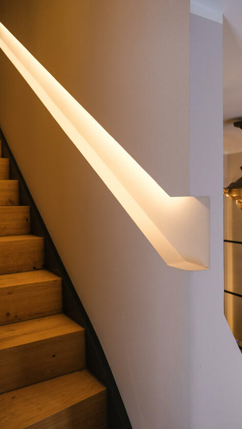 Über eine Holztreppe mit Eichenstufen gelangt man ins Obergeschoss, welches sich nach Osten in Elternteil und nach Westen in Gäste- und „Kinder“-teil trennt. Auf der rechten (Osten) Seite befindet sich ein kleines Büro und das Elternschlafzimmer mit en Suite-Bad, welches mit einer freistehenden Badewanne, einem Doppelwaschtisch, Bidet und Toilette und einer großzügigen, begehbaren Dusche komplett ausgestattet ist.