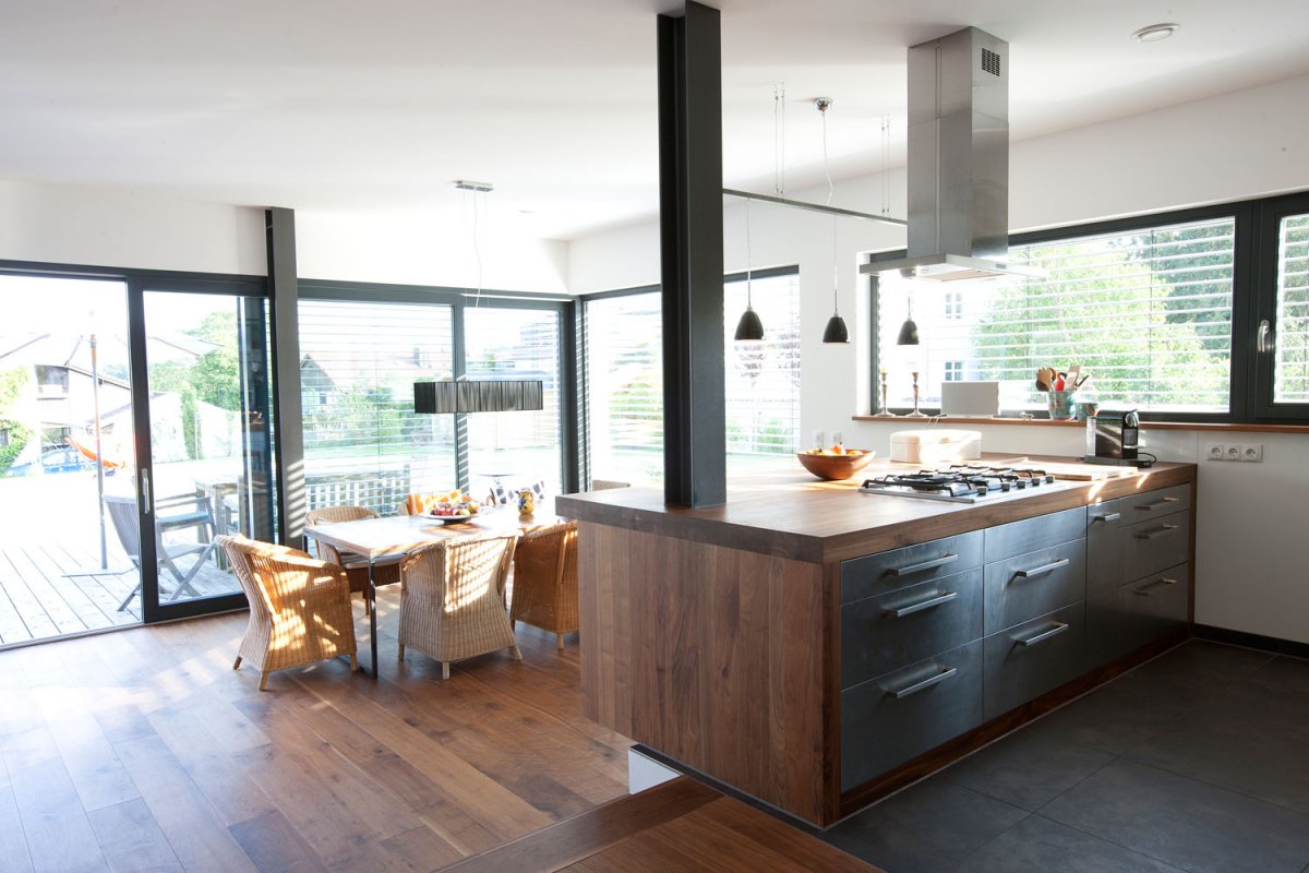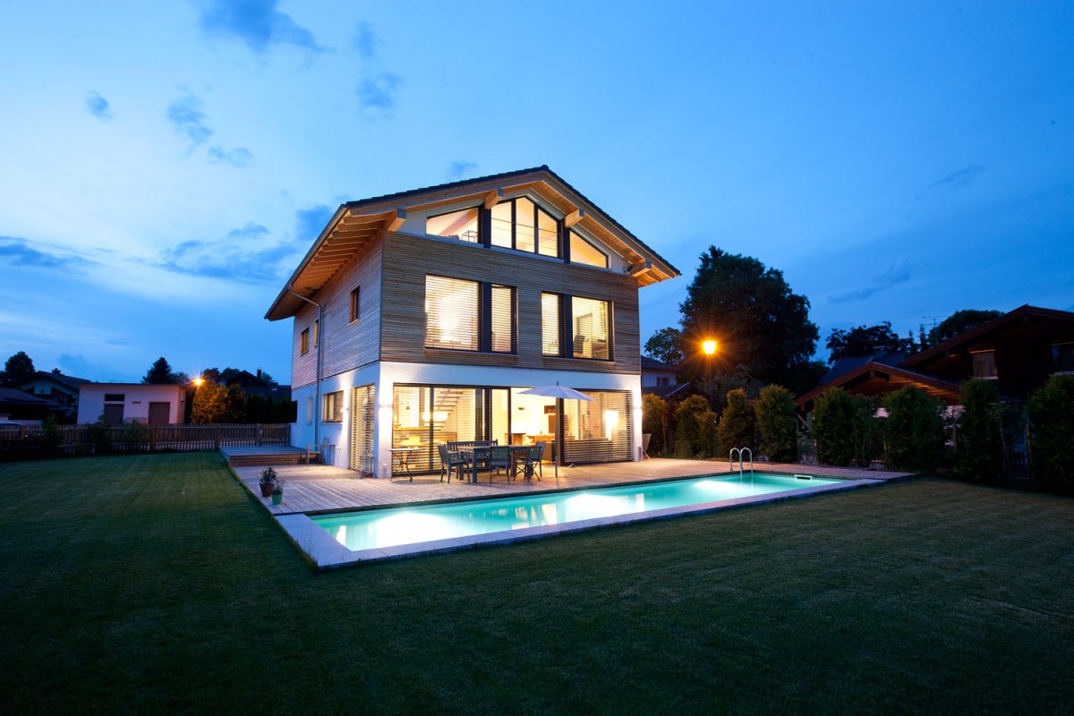 Das fantastisch gelegene Einfamilienhaus mit seinem großen, umgebenden Garten und umlaufender Holzterrasse, liegt im Münchner Süden. Der beheizbare Außenpool grenzt direkt an die Sonnenterrasse und verbindet die weitläufige, gepflegte Rasenfläche mit dem Haus. Die lichtdurchfluteten Räume sind in einem modernen Stil eingerichtet und weisen zeitgemäße Designelemente auf. Die amerikanische Küche samt Küchenblock, der edle Nussbaumboden und die offene, einen freien Blick ermöglichende Bauweise, lässt die im Erdgeschoß befindlichen Räume sehr elegant und großzügig wirken. Die Holzbauweise findet Ihre Fortsetzung in der freischwingenden Treppe zum Obergeschoß. Offene Stahlträger, ein Kamin im Wohnbereich und die großen Fenster geben dem Haus einen individuellen Charakter der individuell, wohnlich und einladend wirkt. Das Niedrigenergiehaus besitzt ein schönes, hell gefliestes Badezimmer mit Waschtisch, Dusche und Badewanne. Im Untergeschoss stehen Kellerräume auf Anfrage zur Verfügung.