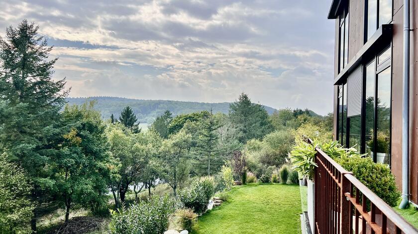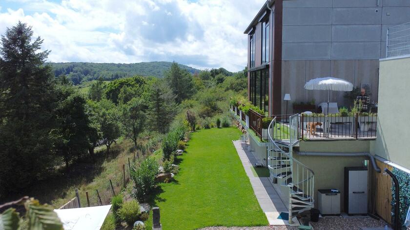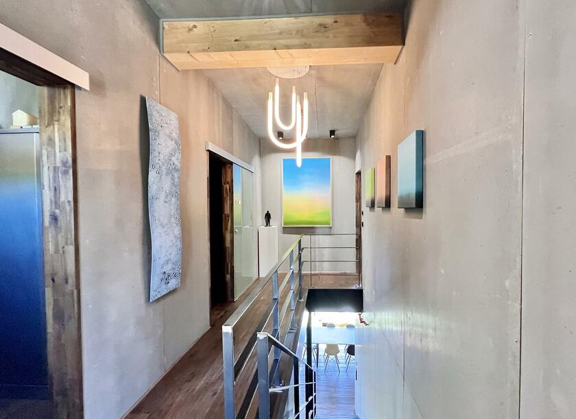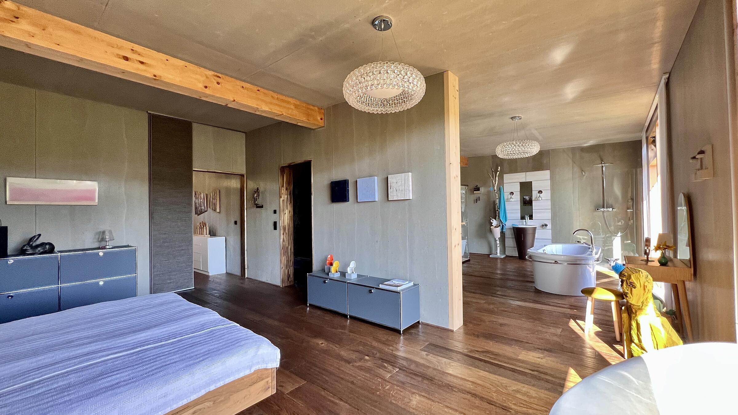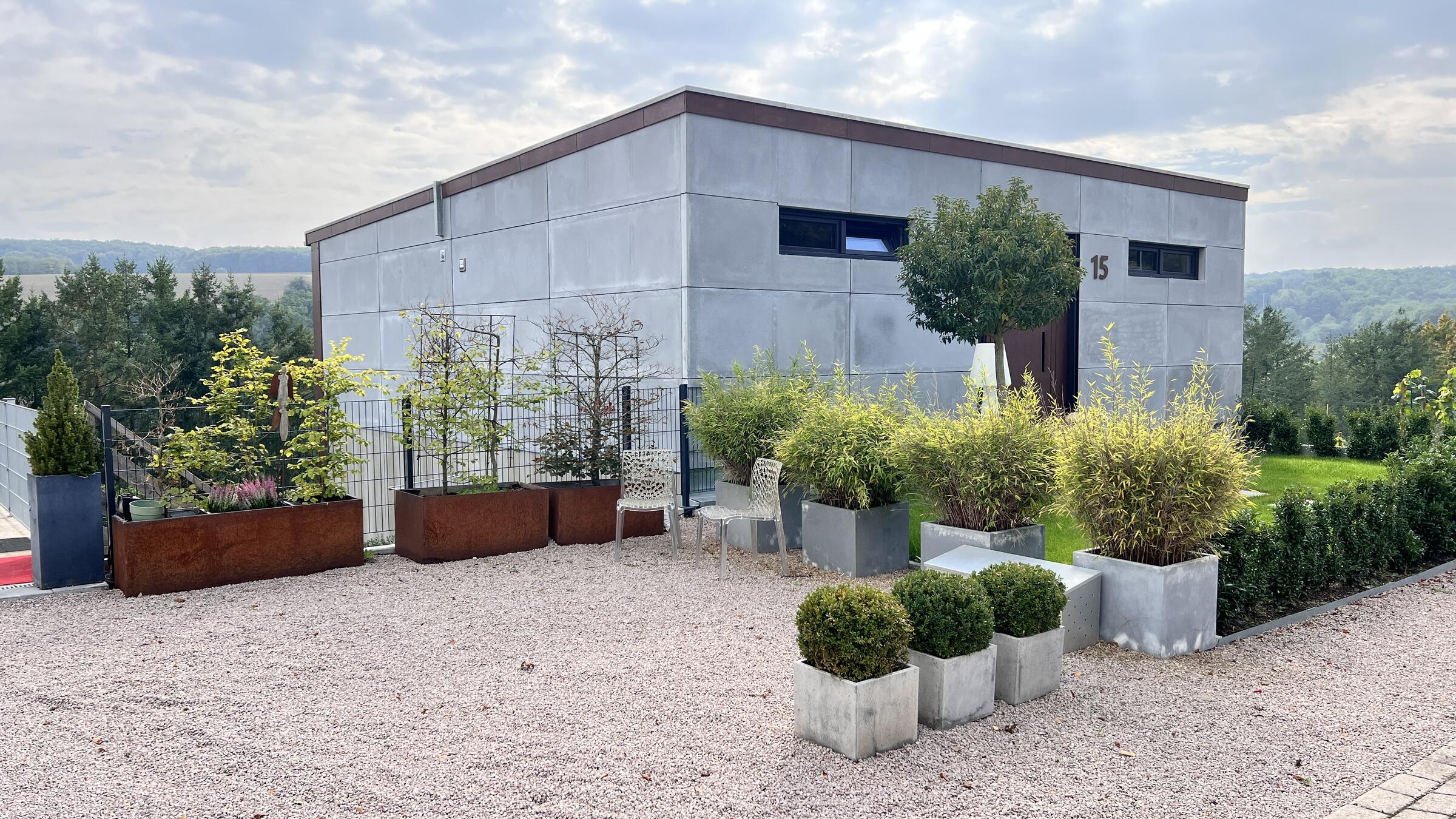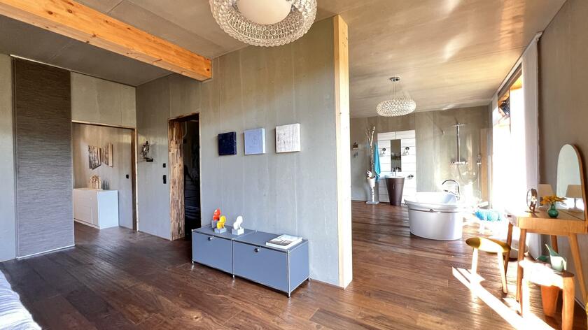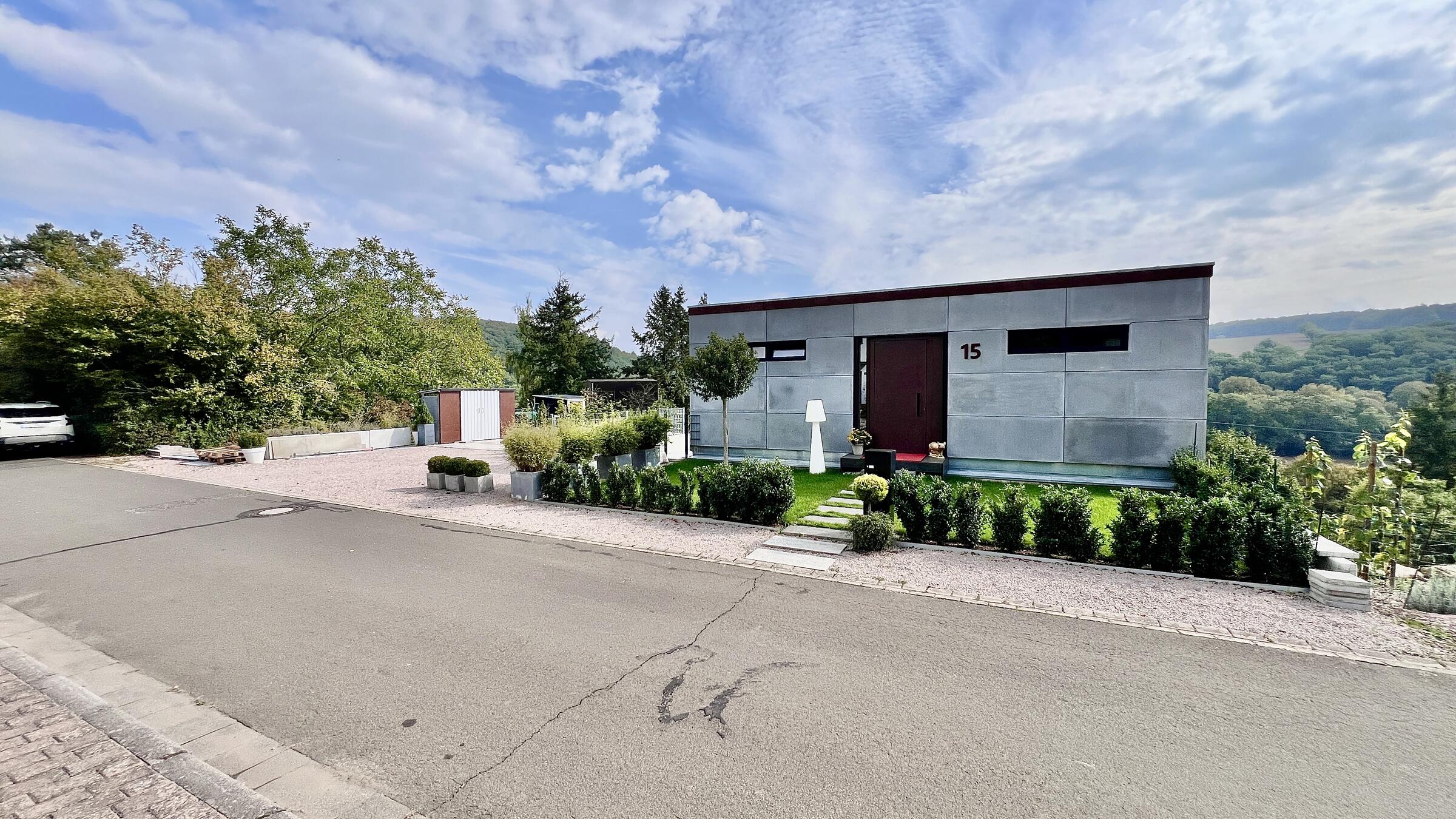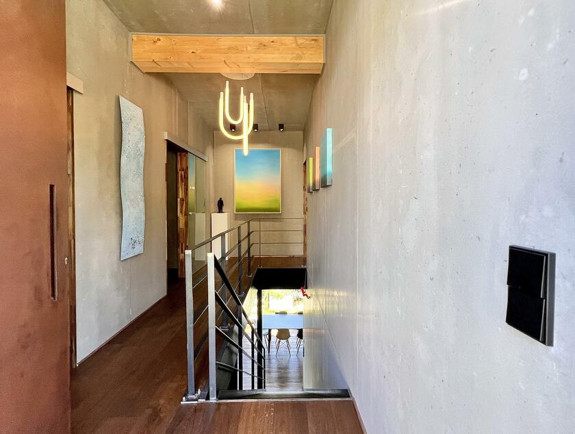 Unser modernes Architektenhaus vereint puristisches Design mit großzügiger Raumgestaltung und einzigartiger Lage, eingebettet in eine ruhige, unverbaubare Naturlandschaft. Bereits die Außenfassade beeindruckt als klares Betonhaus mit markanter Cortenstahleingangstür. Im Inneren setzen sich die Sichtbetonwände fort und schaffen in Verbindung mit edlen Eichenholzböden eine klare, zeitlose Ästhetik. Der offen gestaltete Wohnbereich verbindet Kochen, Essen und Wohnen auf einer Ebene und schafft eine helle, kommunikative Atmosphäre. Im Obergeschoss erwartet Sie eine exklusive Schlaf- und Badsuite mit Sauna, ein großes und künstlerisch gestaltetes Gäste-WC sowie eine mit Kunst ausgestattete Diele mit markanter Stahltreppe. Großflächige Panoramafenster, die nach Süden ausgerichtet sind, geben den Blick in die Natur frei und durchfluten die Räume ganztägig mit Licht. Für atmosphärische Aufnahmen sorgt ein Kamin im Wohnbereich, der eine warme und zugleich stilvolle Stimmung erzeugt. Zur Ausstattung zählen ein Swimmingpool im Außenbereich, sowie ein Billardzimmer mit Musikecke und eine Kaffeebar im großzügigen und offenen Wohnbereich. Ergänzt wird das Ensemble durch ein separates Nebengebäude, das der Crew als Arbeits- und Aufenthaltsbereich zur Verfügung steht. Ein liebevoll angelegter kleiner Weinberg sowie ein weitläufiges Gartengrundstück schaffen eine atmosphärische Umgebung und eröffnen zusätzliche, vielseitige Dreh- und Fotomotive. Großzügige Parkmöglichkeiten direkt am Haus sowie zusätzliche Stellflächen am angrenzenden Wendehammer garantieren eine bequeme Logistik ohne Durchgangsverkehr. Der Standort zeichnet sich zudem durch eine absolut ruhige Lage mit nur wenig Bebauung im angrenzenden nachbarschaftlichen Bereich aus – ideale Voraussetzungen für konzentriertes Arbeiten am Set.