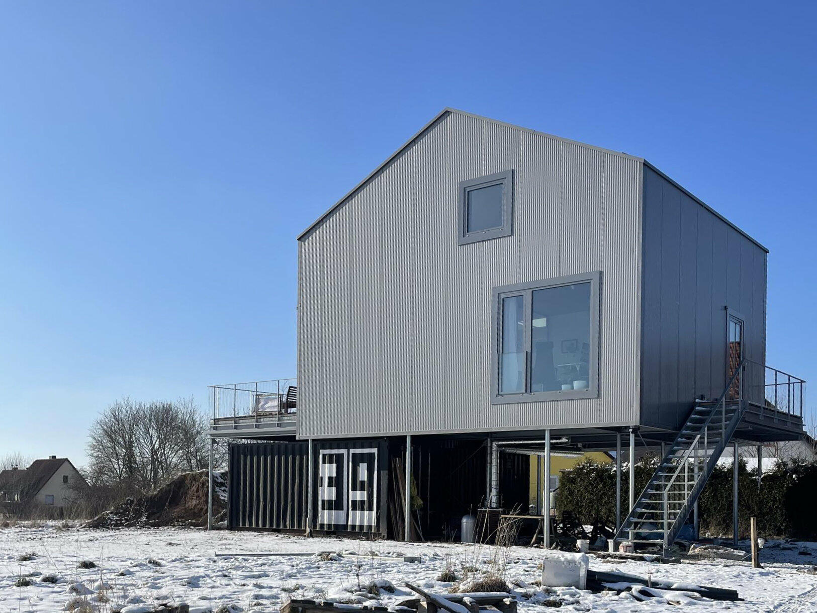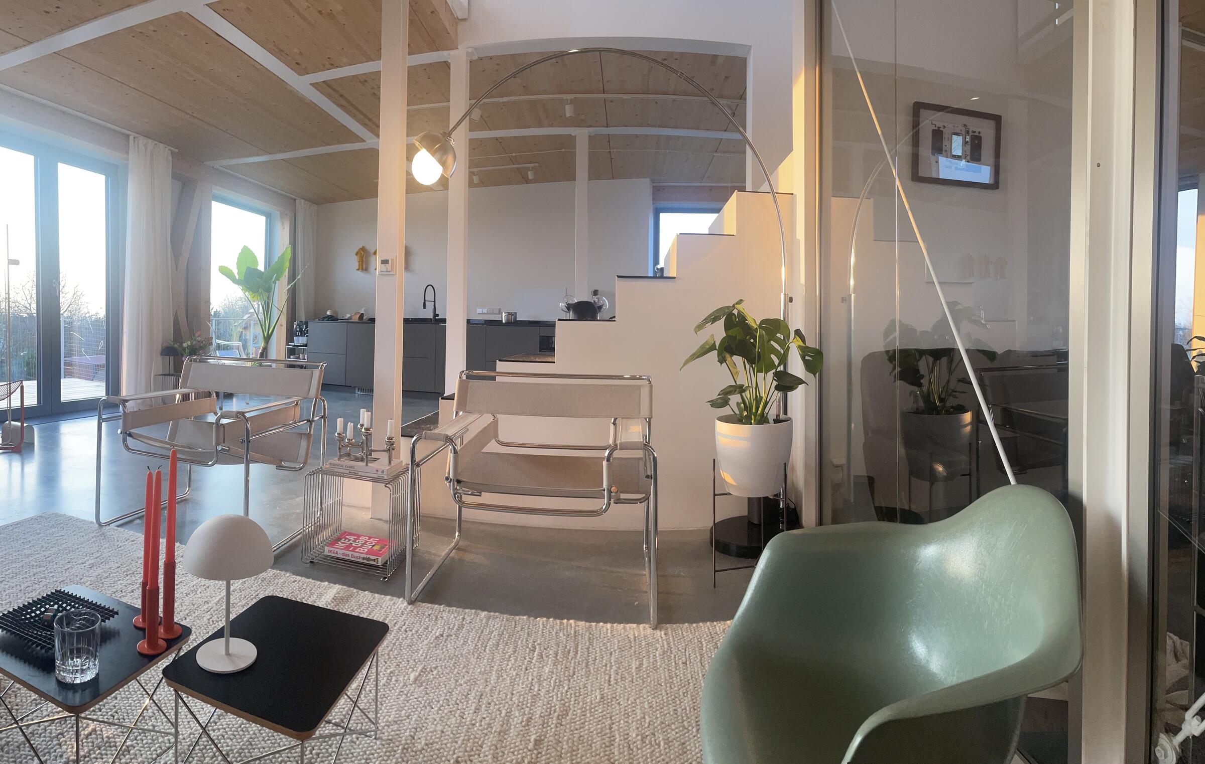 Unser in Holzständerbauweise nachhaltig errichtetes Haus befindet sich in einem Neubaugebiet, am Ende einer wenig befahrenen Sackgasse. Die Räume sind hell und zeitgemäß eingerichtet. Durch die großen Fenster fällt viel Tageslicht in die Räume. Die Fenster können mit weißen Vorhängen verdunkelt werden. Die Böden im Haus bestehen aus grauem Estrich mit individuellem Muster. Der Boden im Badezimmer besteht aus achatgrauem Gußboden. Die Räume dürfen nach Absprache umgestaltet werden. Auf unserem Grundstück stehen 4 Pkw-Parkplätze zur Verfügung. Weitere Parkplätze gibt es auf der Straße vor unserem Haus.