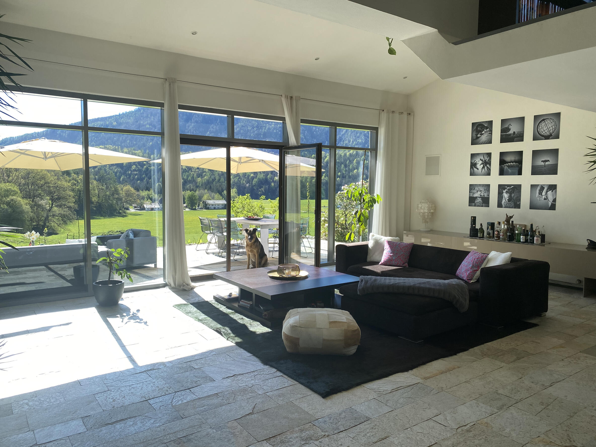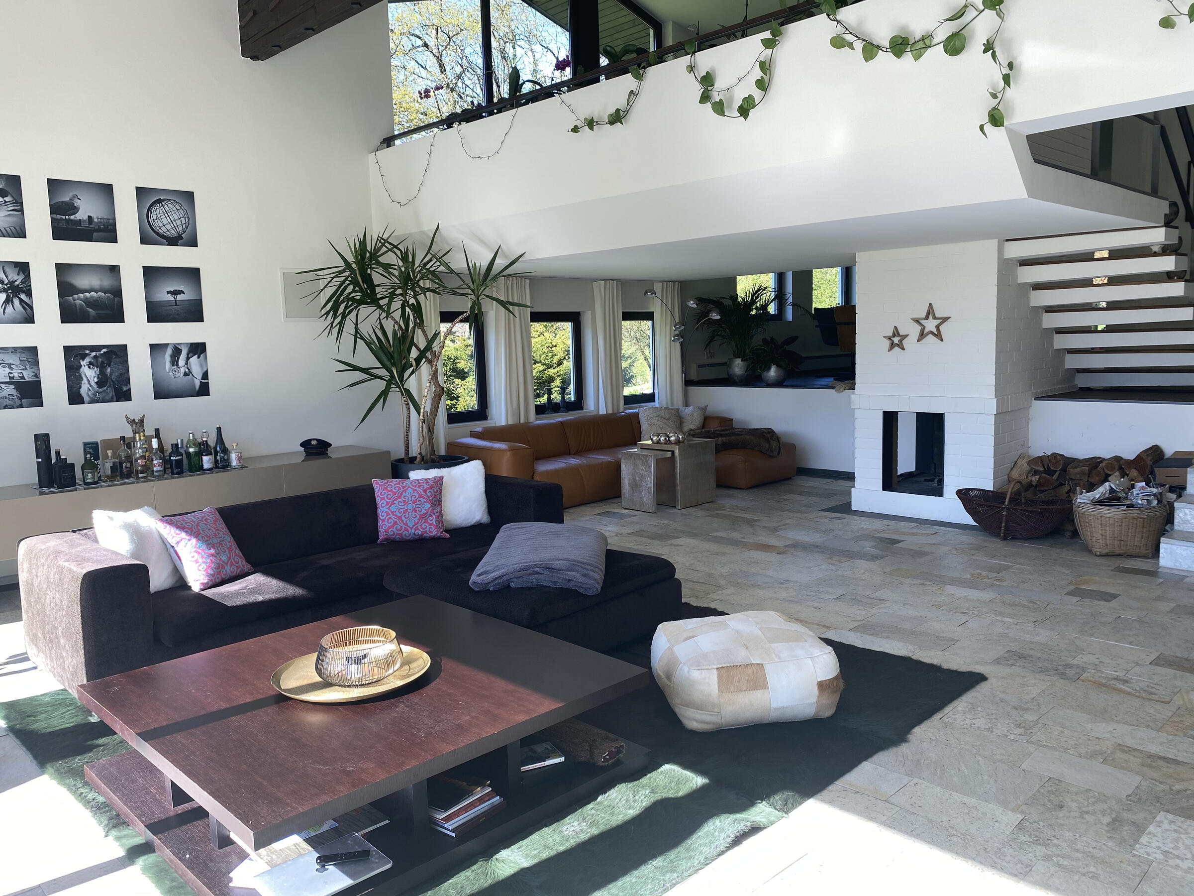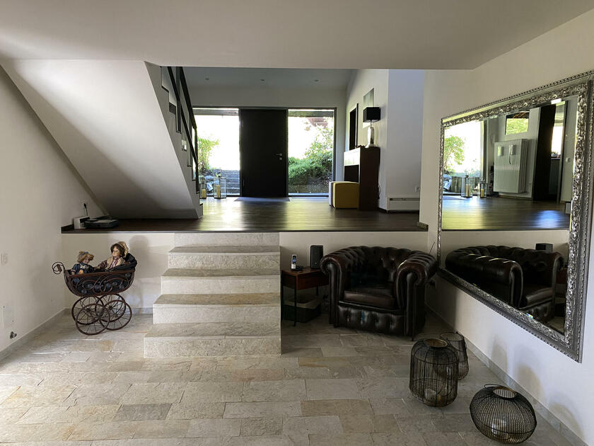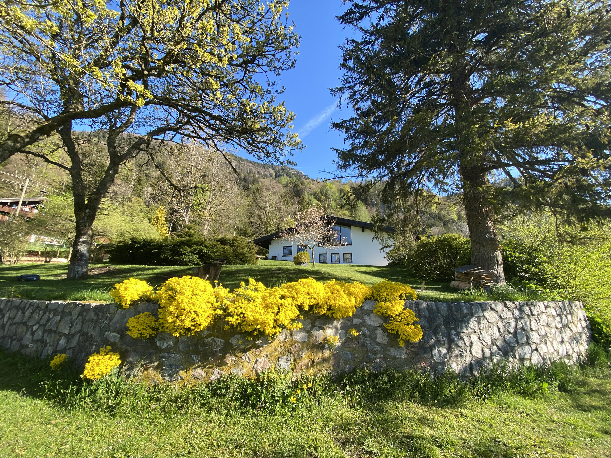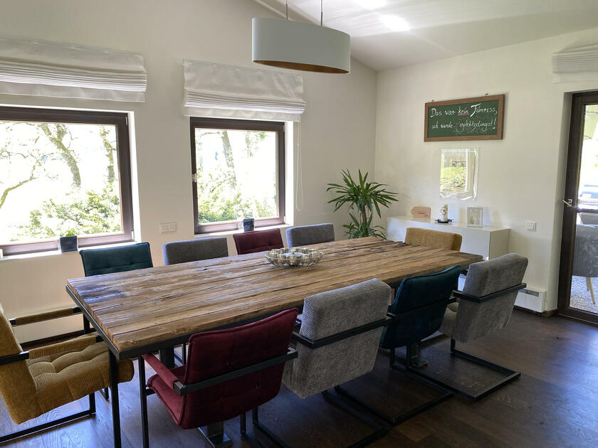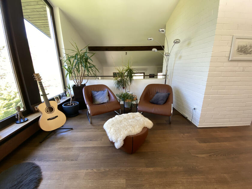 Am Fuße der Hochplatte im idyllischen Chiemgau liegt mein hübsches Hanghaus. Das Haus wurde im Jahr 1976 als Architektenhaus gebaut und im Jahr 2008 komplett und aufwendig renoviert. Der Wohnraum ist sehr offen gestaltet mit hohen Räumen, hochwertigen Möbeln und vielen Fensterflächen. Dadurch ist es im Wohnbereich mit Wohnzimmer, Küche, Esszimmer und Galerie sehr hell und lichtdurchflutet. Von der Galerie aus, kann man im Winter, wenn die Bäume keine Blätter tragen, ebenfalls bis zum wilden Kaiser sehen. Außerdem ist ein offener Kamin vorhanden. Im ersten Obergeschoss befindet sich das Ankleidezimmer mit großem Bad, das Schlafzimmer sowie ein Büro. Im Souterrain befinden sich zwei Gästezimmer sowie ein Gästebad und eine gemütliche Telefonecke.
