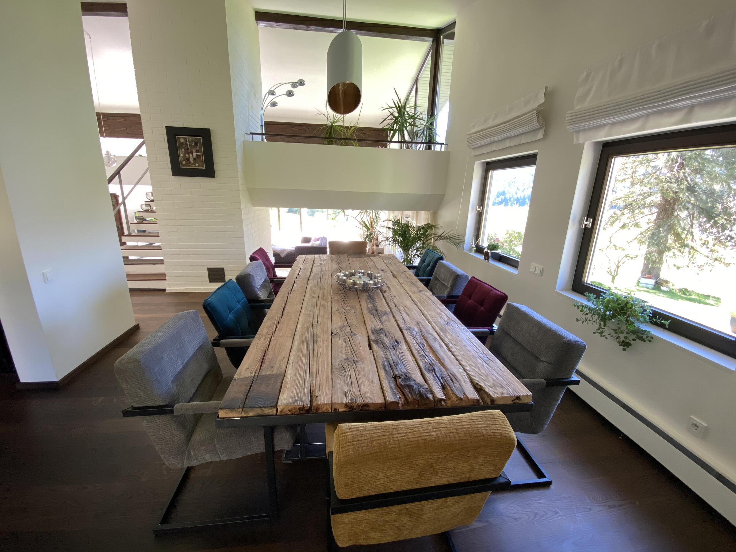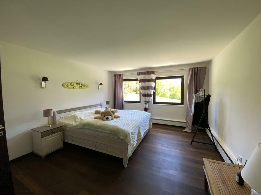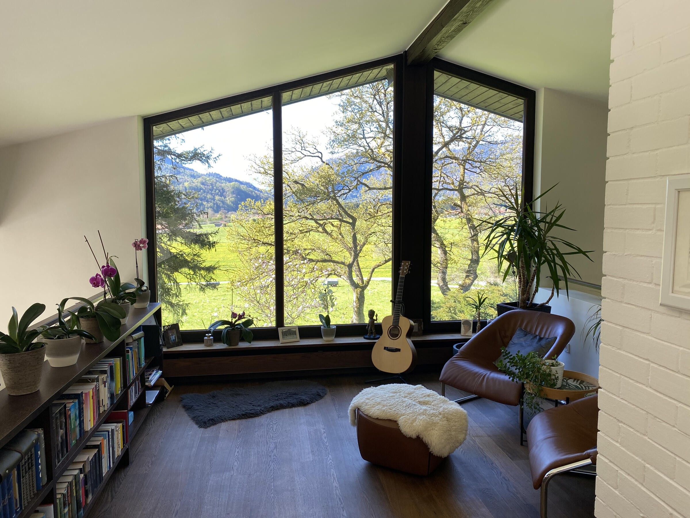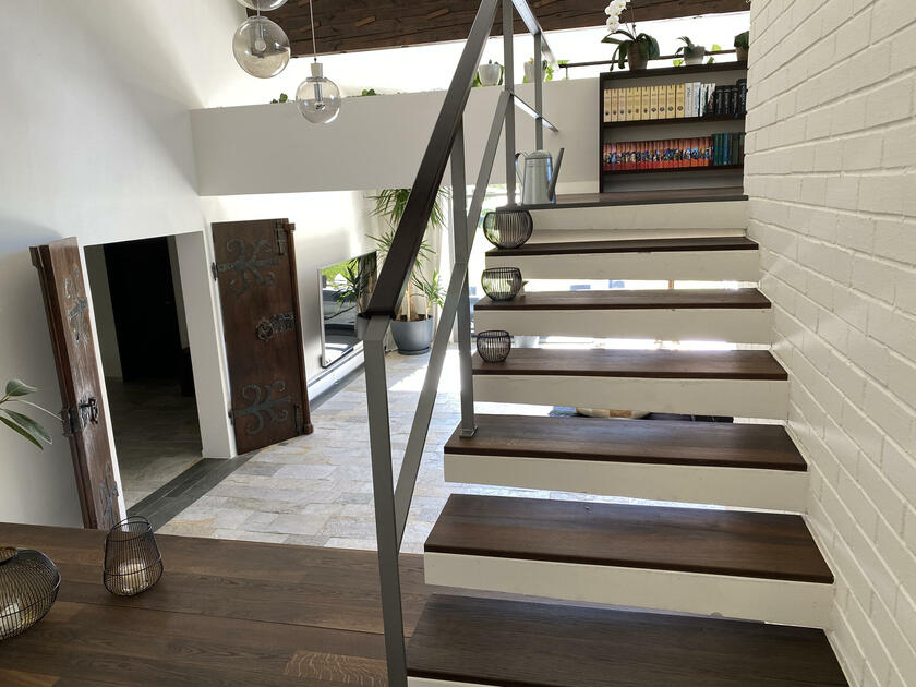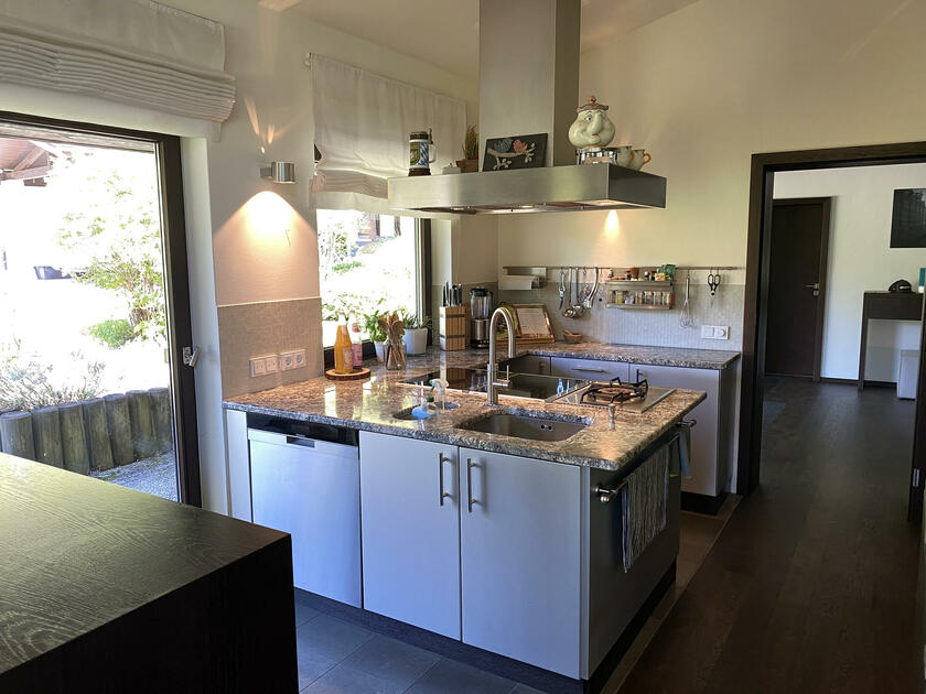 Am Fuße der Hochplatte im idyllischen Chiemgau liegt mein hübsches Hanghaus. Das Haus wurde im Jahr 1976 als Architektenhaus gebaut und im Jahr 2008 komplett und aufwendig renoviert. Der Wohnraum ist sehr offen gestaltet mit hohen Räumen, hochwertigen Möbeln und vielen Fensterflächen. Dadurch ist es im Wohnbereich mit Wohnzimmer, Küche, Esszimmer und Galerie sehr hell und lichtdurchflutet. Von der Galerie aus, kann man im Winter, wenn die Bäume keine Blätter tragen, ebenfalls bis zum wilden Kaiser sehen. Außerdem ist ein offener Kamin vorhanden. Im ersten Obergeschoss befindet sich das Ankleidezimmer mit großem Bad, das Schlafzimmer sowie ein Büro. Im Souterrain befinden sich zwei Gästezimmer sowie ein Gästebad und eine gemütliche Telefonecke.