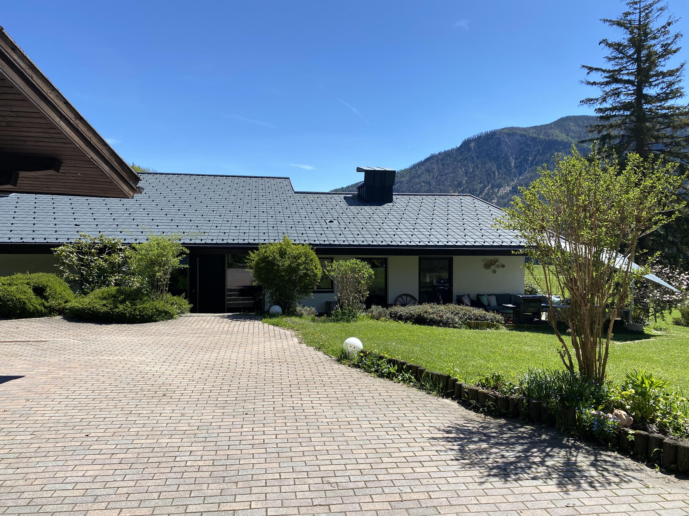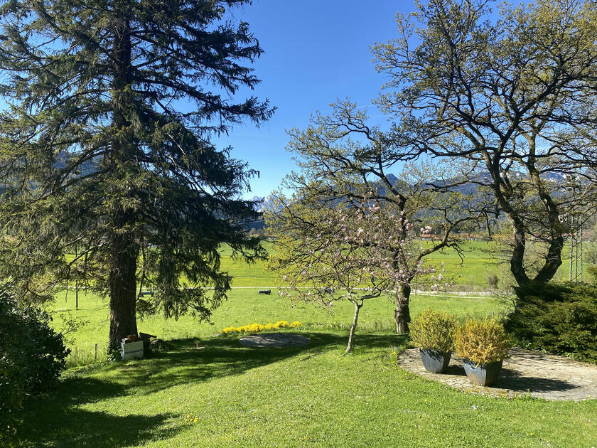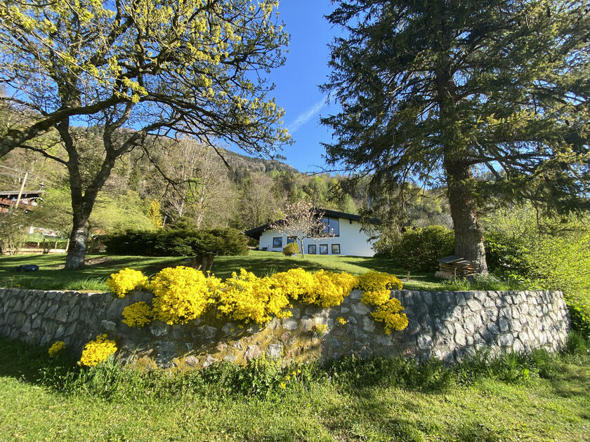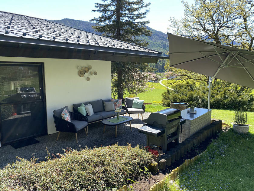 Der Garten ist abfallend am Hang und hat im Süden einen wunderbaren Blick auf den wilden Kaiser, das Schlechinger Achental und den Breitenstein. Im Osten und im Westen sind zwei gemütliche Terrassen vorhanden. Im Innenhof ist für drei bis sieben Fahrzeuge Platz.
