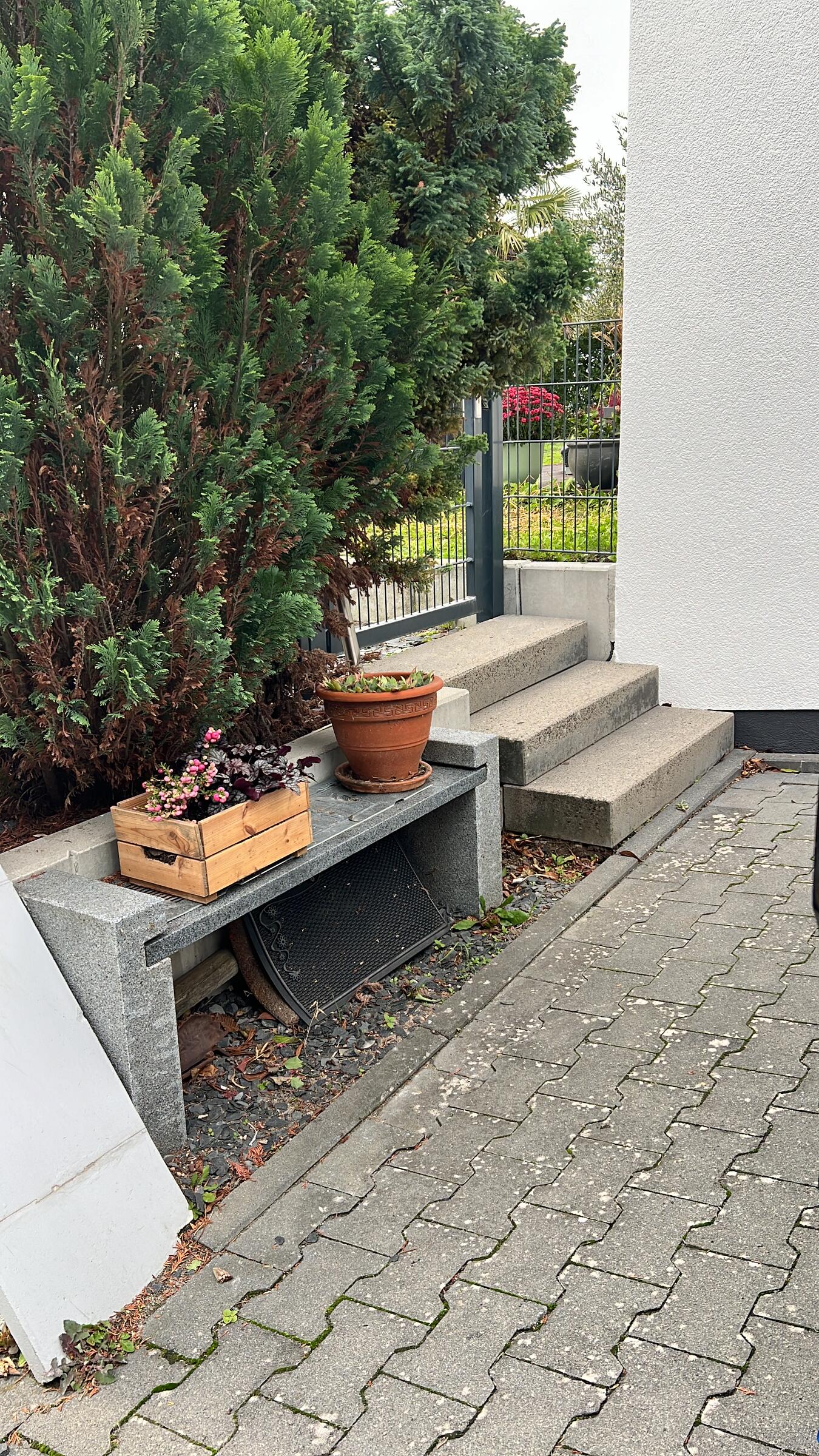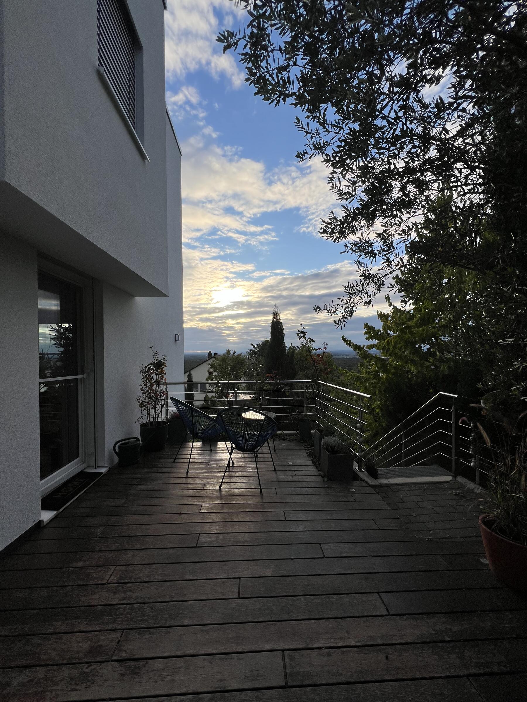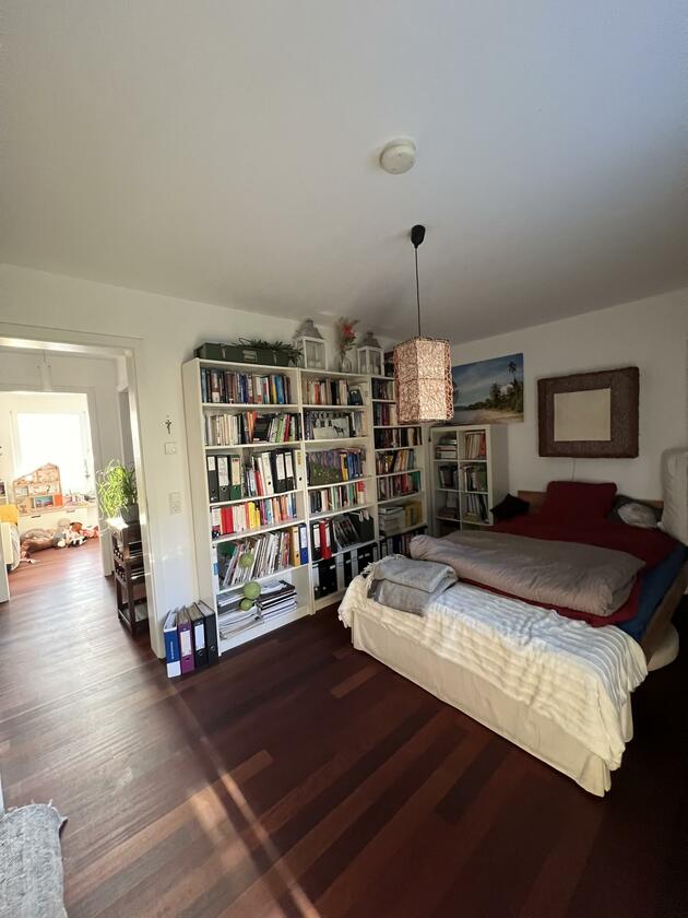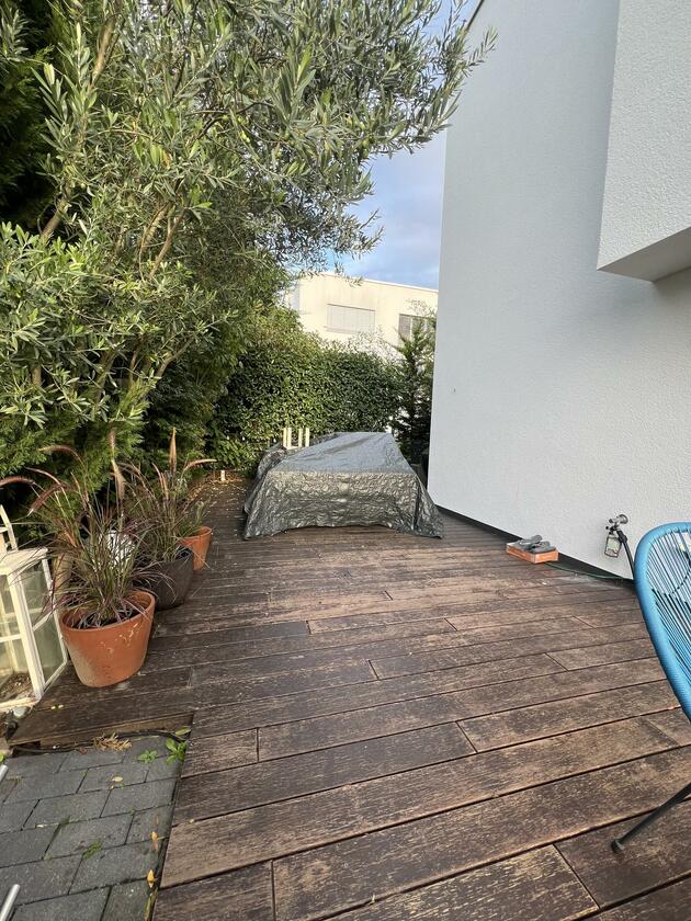 Im 2. OG befinden sich ein Arbeitszimmer, ein Kinderzimmer, ein Gästezimmer sowie ein Sportraum. Im Außenbereich stehen unser Garten, der sowohl vom Schlafzimmer als auch vom Badezimmer direkt zugänglich ist, und die Terrasse, erreichbar vom Wohnzimmer, zur Verfügung. Die zwei Gartenbereiche sind durch eine Außentreppe miteinander verbunden. Nach Absprache dürfen die Räume unseres Hauses umgestaltet werden. Ebenfalls können 3 Pkw-Stellplätze genutzt werden.