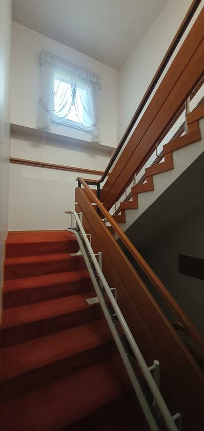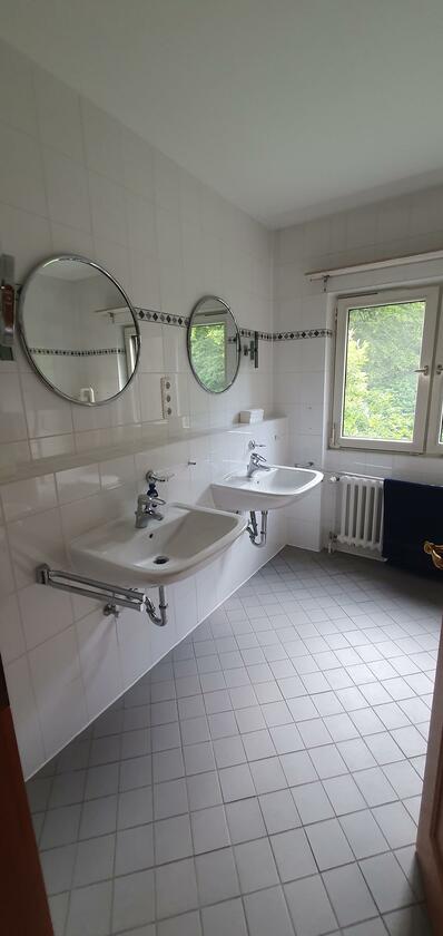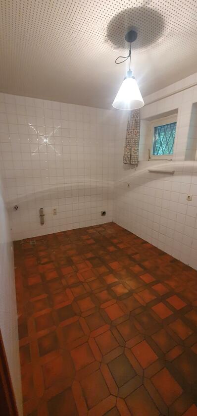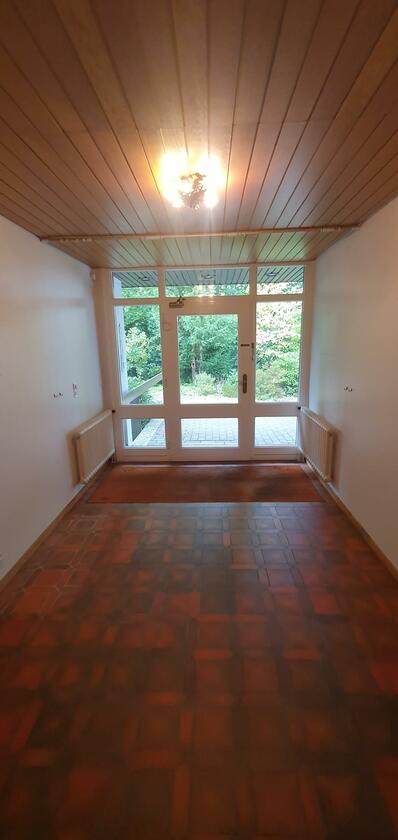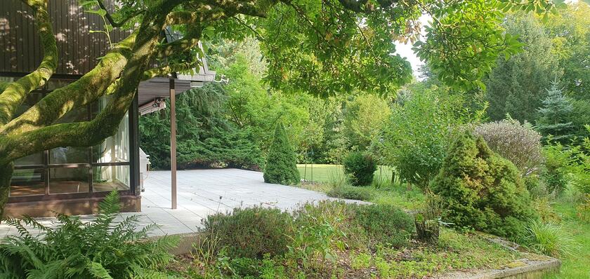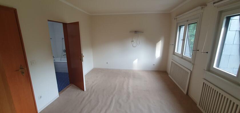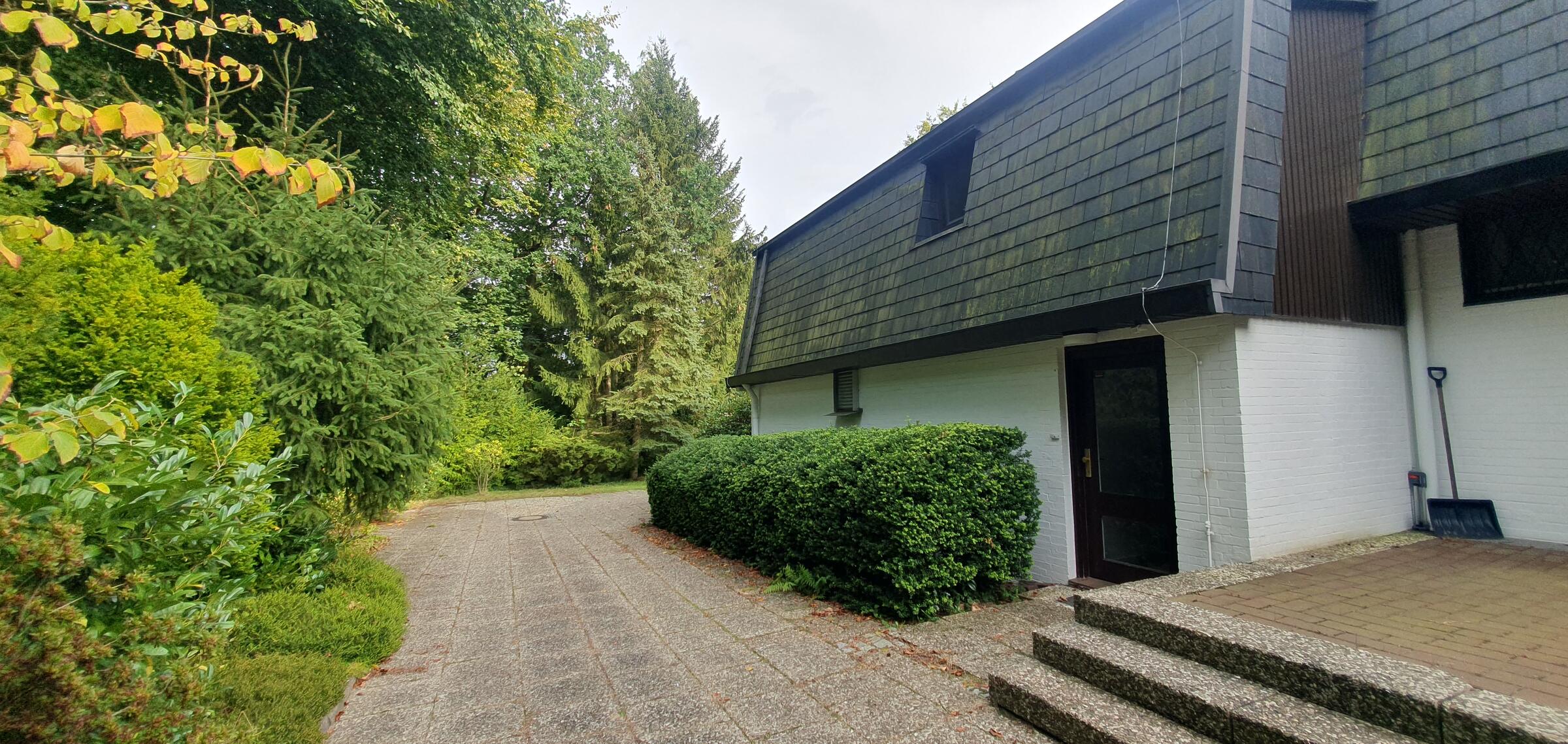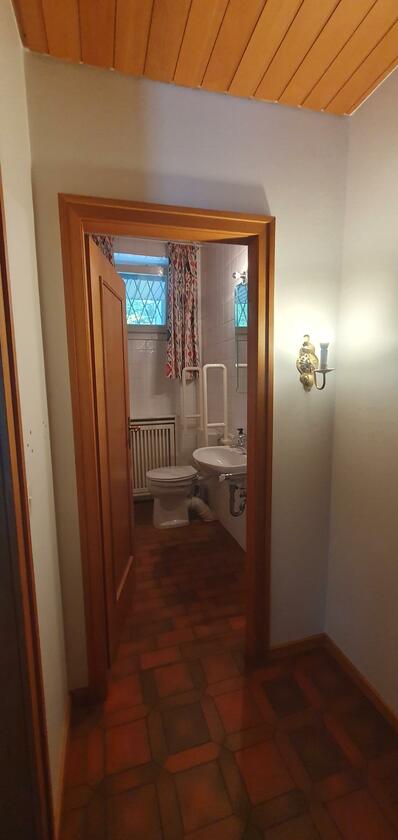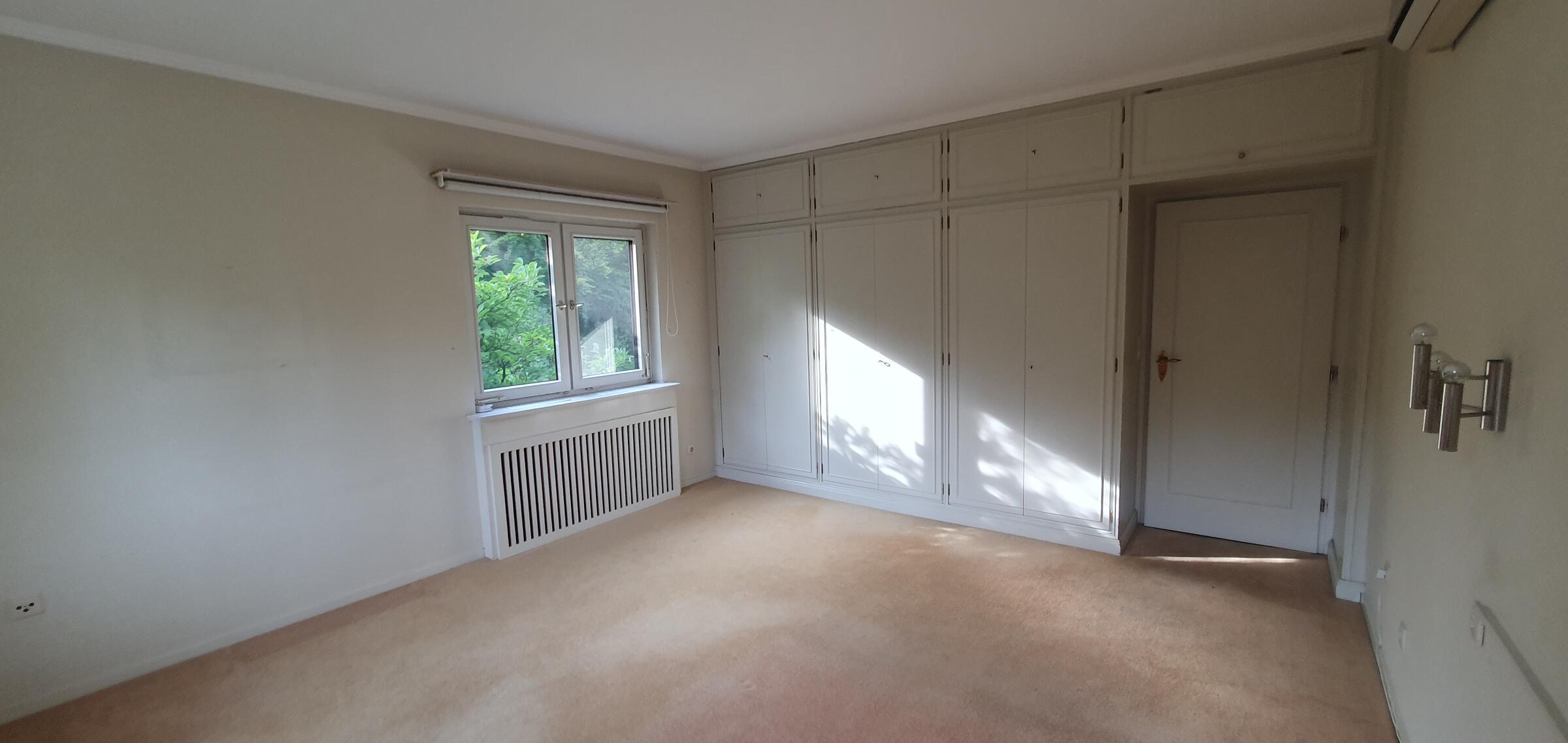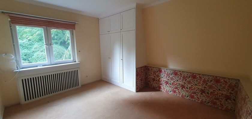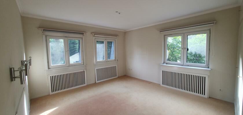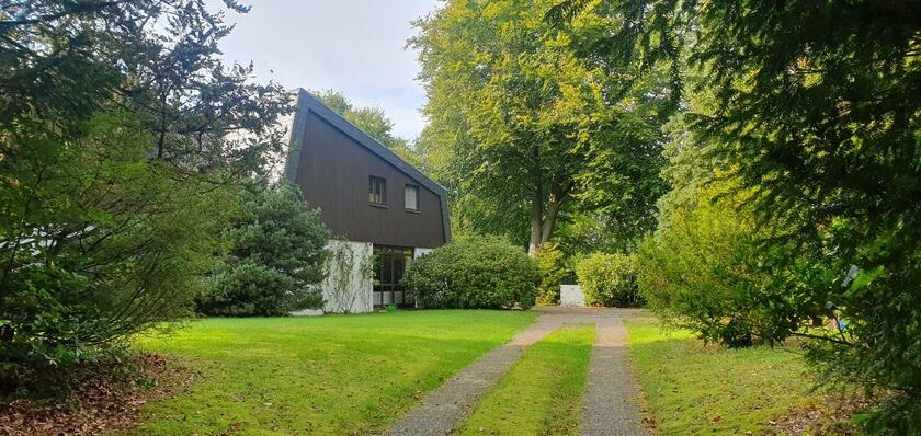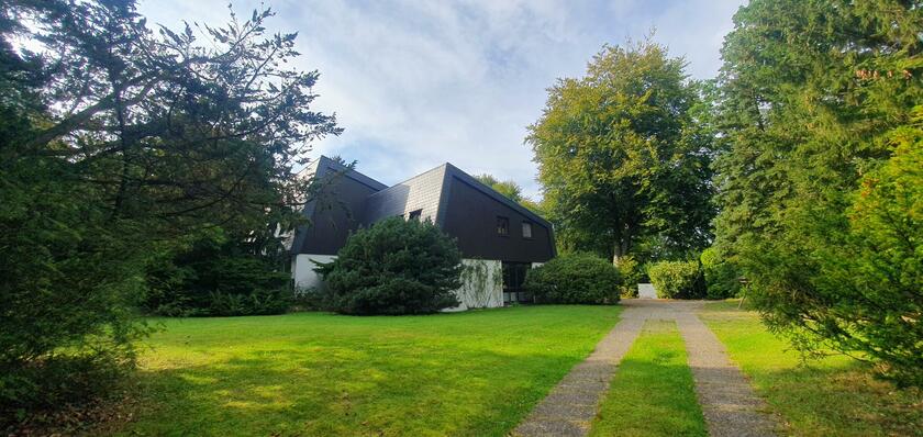 Diese leerstehende Architektenvilla wurde in den 1970er Jahren gebaut und bietet 7 Zimmer, ein Hallenbad, eine Einliegerwohnung und diverse Nebenräume. Die Innenausstattung der Räume ist überwiegend im Original erhalten. Der offene Kamin im Wohnraum ist in Kupfer eingefasst und die dortigen Einbauschränke in Malertechnik petrolfarben gestrichen. Die Fenster im Wohn- und Essbereich im Erdgeschoss können mit Außenjalousien abgedunkelt werden. Im Obergeschoss befinden sich 4 Schlafräume, 3 Bäder, sowie ein WC. Der Innenpool ist derzeit entleert, kann jedoch nach Absprache befüllt werden. Die separat zugängliche 3-Zimmer Einliegerwohnung kann gut als Crew-Aufenthalt genutzt werden, Küche und Badezimmer sind dort ebenfalls vorhanden. Das eingewachsenes Grundstück bietet alten Baumbestand und einen großen parkartigen Garten. Die große Terrasse mit Granitboden öffnet sich zum Garten. Das Gebäude ist nach Süden ausgerichtet. Die Zufahrt zum Gebäude erfolgt über eine ansprechende Auffahrt. Für größere Fahrzeuge bzw. Anlieferungen steht eine rückwärtige Zufahrt ohne Steigung zur Verfügung.