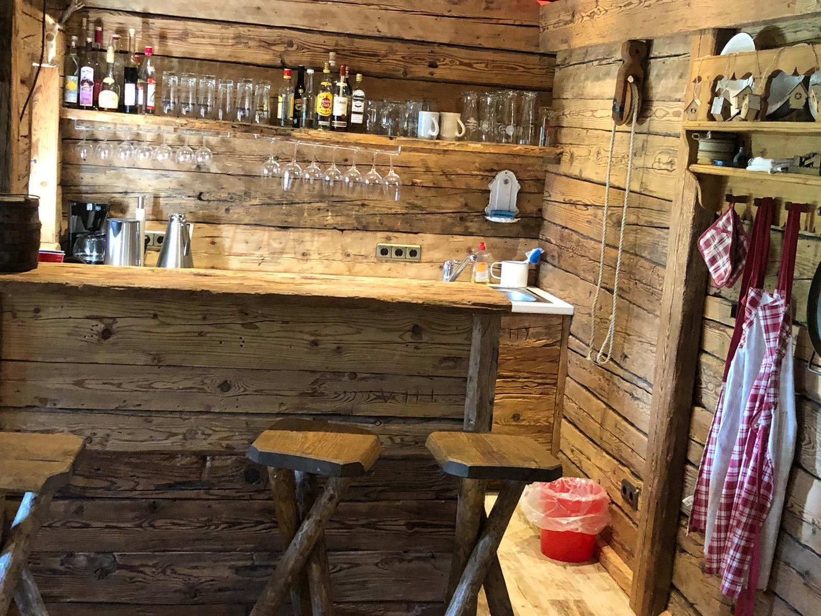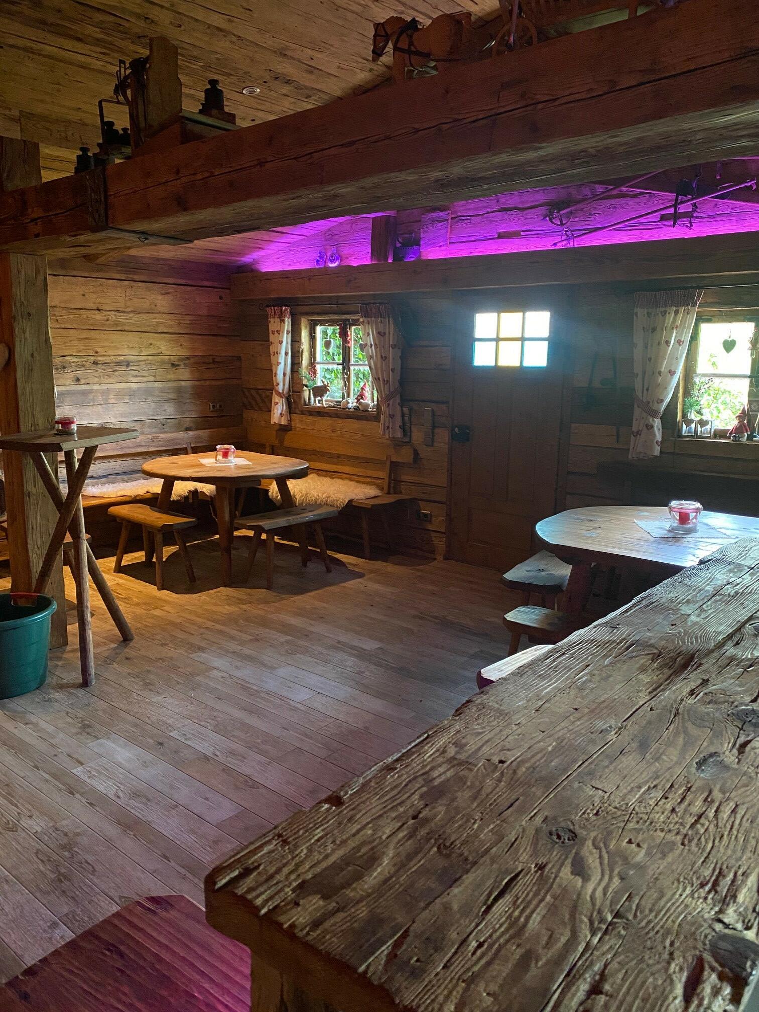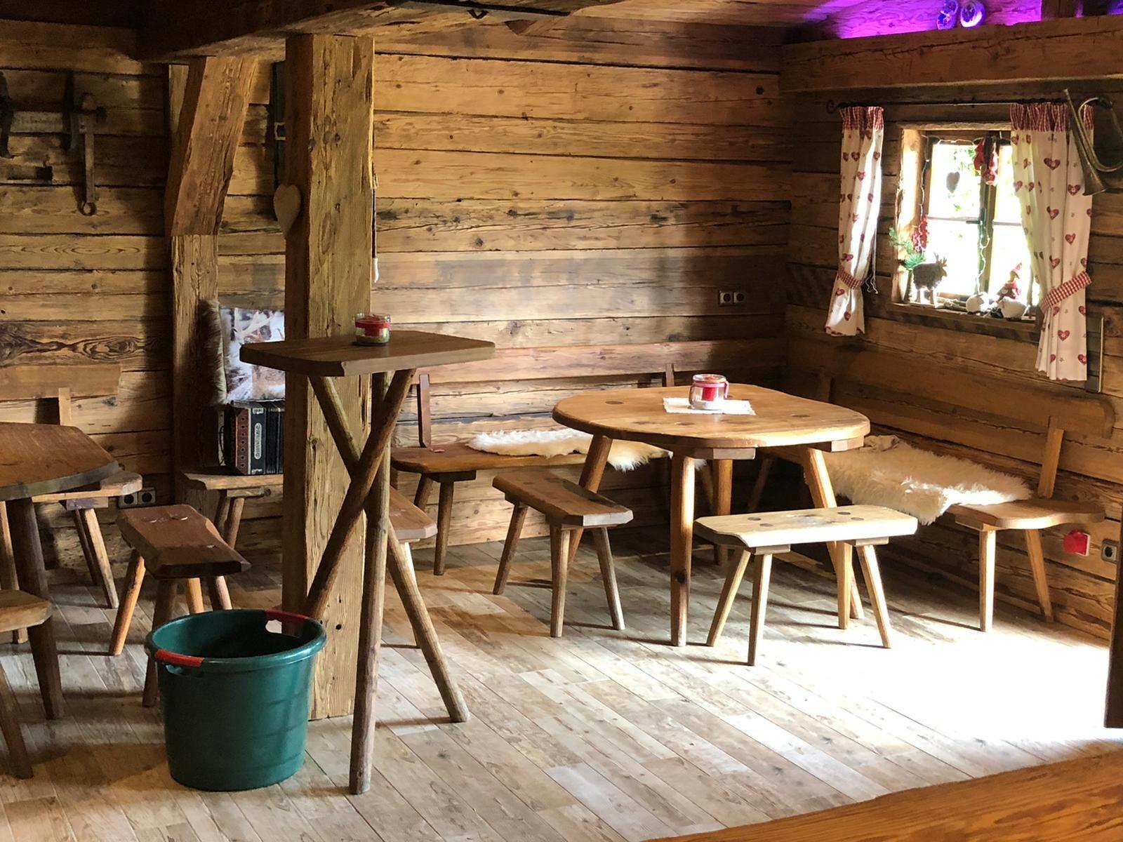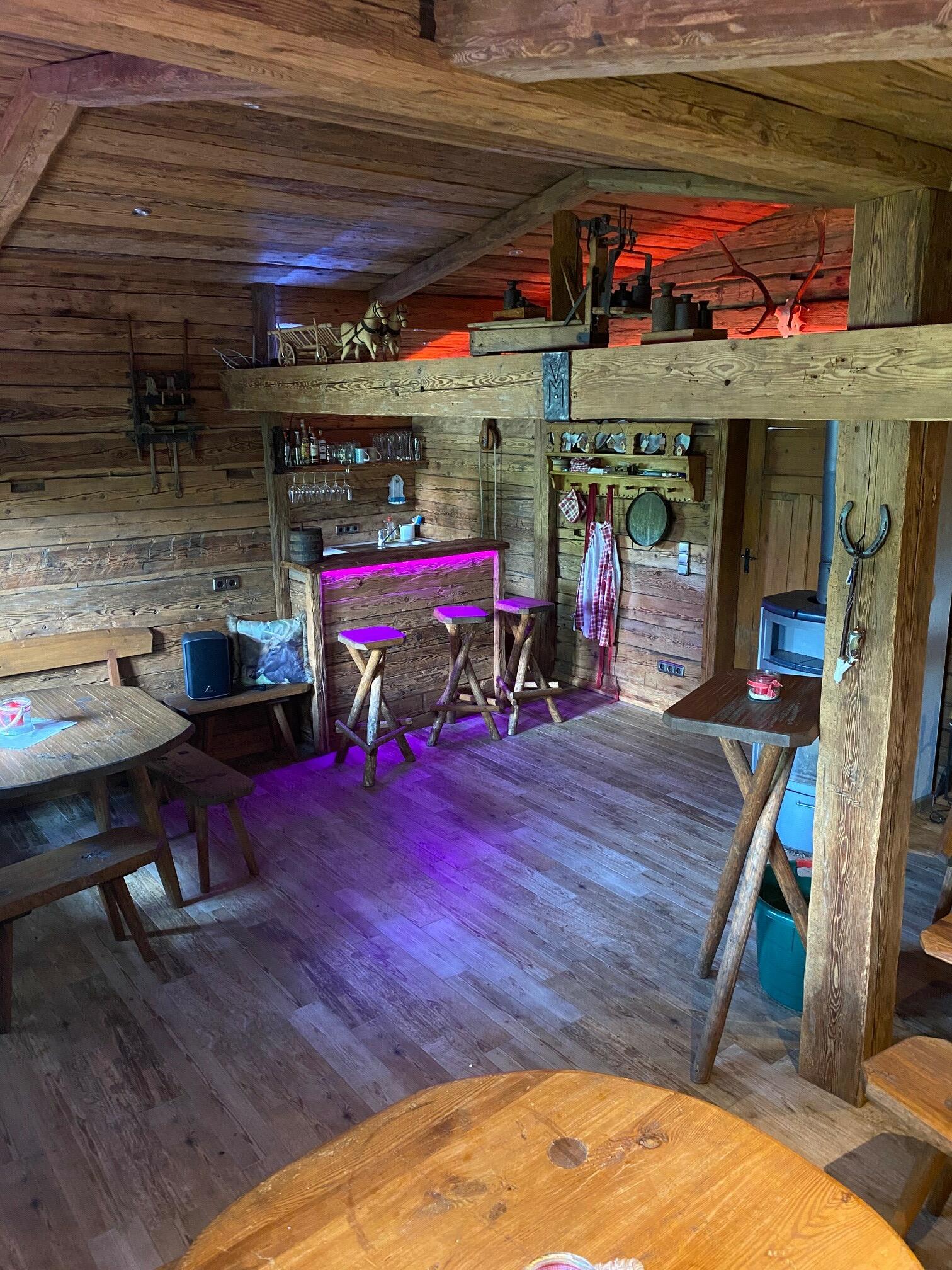 Die sehr charmante Almhütte wurde mit original Altholz aus Tirol liebevoll bis ins Detail aufgebaut. Die größere Stube bietet eine Küche, eine kleine Bar mit Tresen, 3 Tische und einen Holzofen. Der Nebenraum hat einen Essbereich und eine alte Werkbank. Die Hütte hat auch einen Lagerraum. Vor der Hütte gibt es eine Terrasse mit einem überdachten Sitzbereich und großem wunderbar eingewachsenem Garten. In der Umgebung befinden sich Obstbäume und ein großer Hochbeetbereich. Neben der Hütte ist auch noch ein Grillbereich, der mit alten Ziegeln eingefasst ist. Im Wohnhaus nebenan gibt es nutzbare Toiletten. Die Hütte selbst kann mit dem Ofen beheizt werden und hat Warm- und Kaltwasser und LAN-Anschluss.