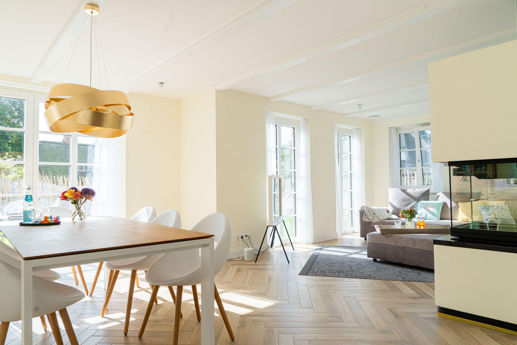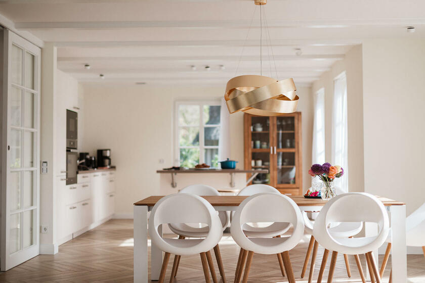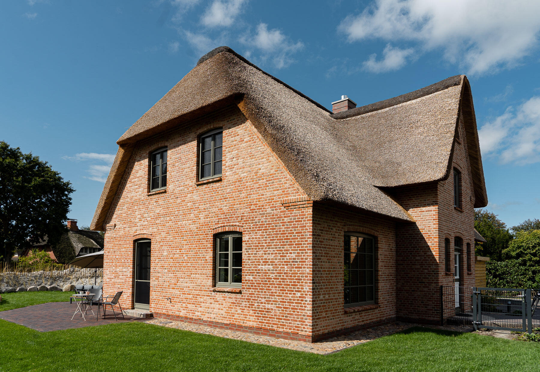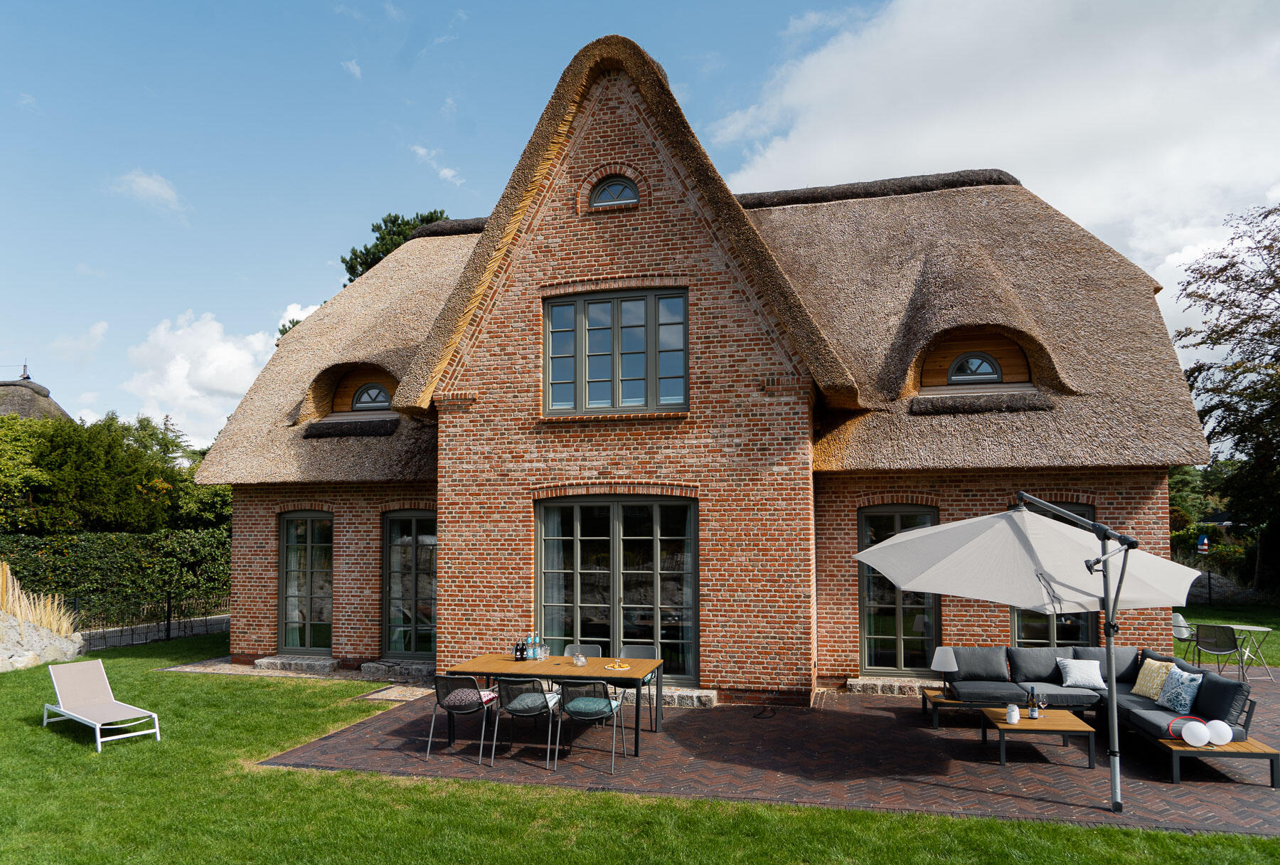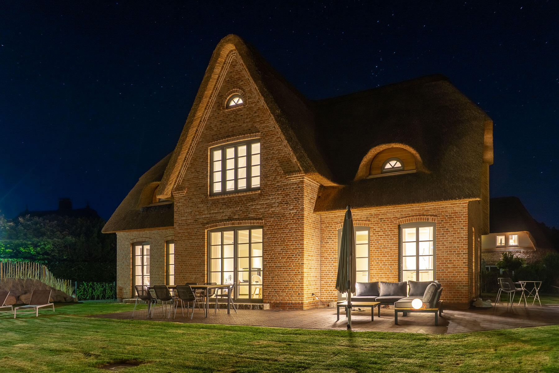 Unser wunderschönes und großzügiges Reetdachhaus befindet sich in einem Reetdachviertel in St. Peter-Ording mit Laufweite zum Deich. Die Nachbarschaft ist sehr ruhig. Das Haus liegt in einer Sackgasse ohne Verkehrslärm. Die Fußböden sehen aus wie Parkett, sind jedoch komplett gefliest und daher sehr widerstandsfähig. Alle Schlafzimmer sind gleich groß, haben aber unterschiedliche Tapeten und Schränke. Für Dreharbeiten würde sich vor allem das EG eigenen, da dies sehr großzügig ist. Die Schlafzimmer sind eher kleiner, können aber hervorragend als Garderoben genutzt werden. Das lichtdurchflutete Badezimmer im OG verfügt über eine freistehende Badewanne. Der beeindruckende Eingangsbereich ist nach oben offen. Der Garten verläuft an drei Seiten eingezäunt ums Haus und hat zur Straßenseite hin hohe Dünen, so dass er nicht einsehbar ist. Die Dünen sorgen für Strandflair. Abends ist das Haus stimmungsvoll von außen beleuchtet. Die Sackgasse vor dem Haus könnte vermutlich leicht für Fahrzeuge gesperrt werden. Der Parkplatz ist direkt vor dem Haus und ohne Tor.