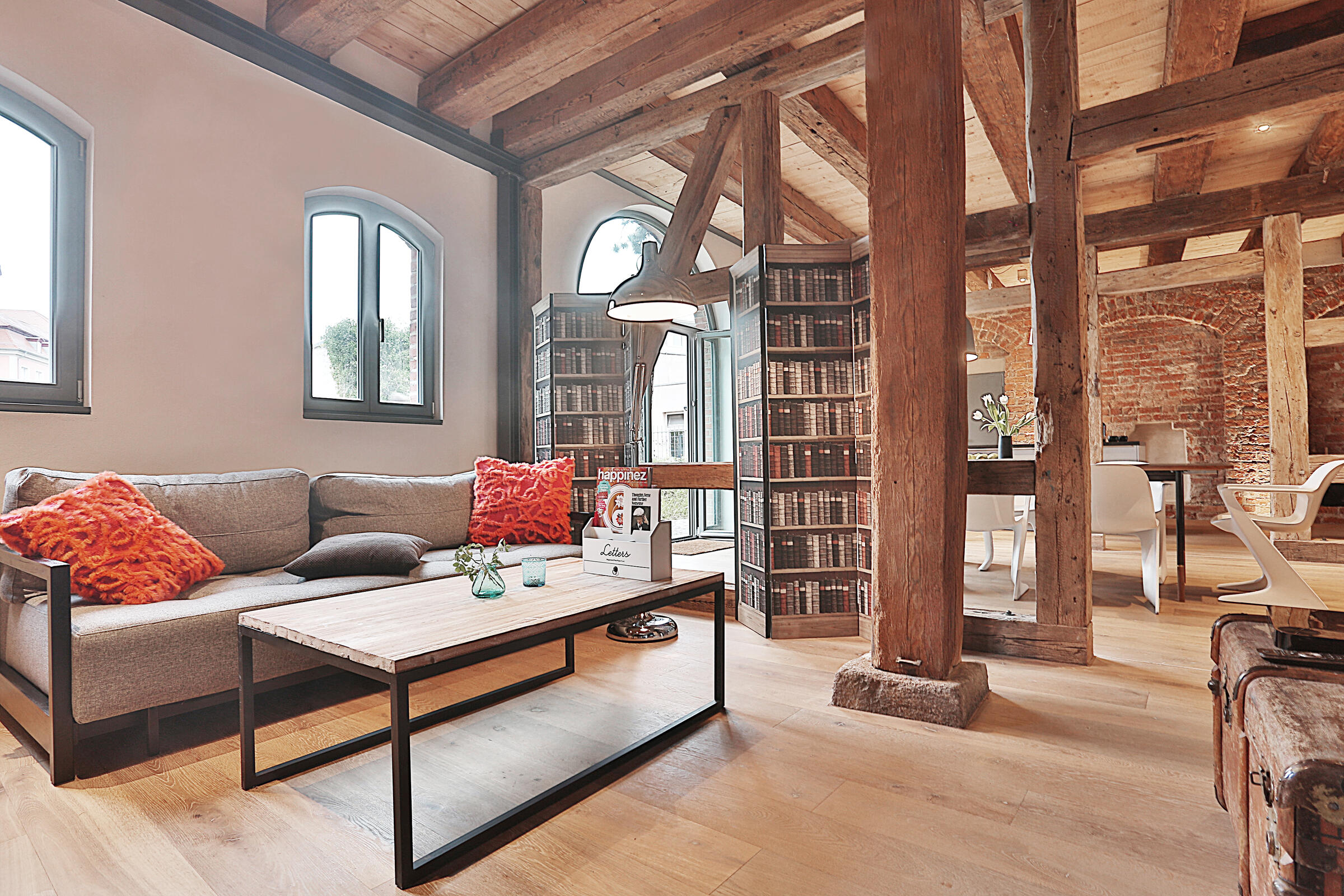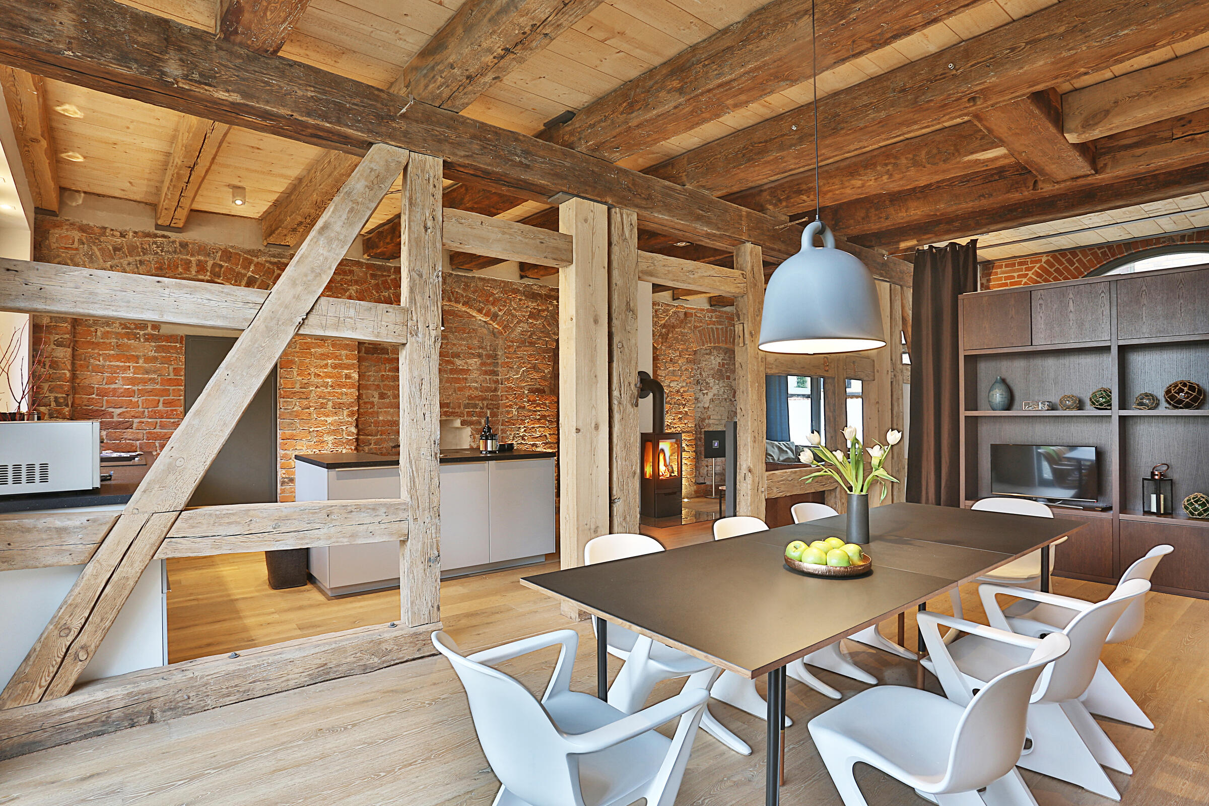 Der Grundcharakter des Gebäudes - ein ehemaliger Getreidespeicher - ist auch nach der Sanierung noch gut erlebbar. Altes Mauerwerk, originale Deckenbalken und alte Fachwerkwände geben den Räumen besonderen Charme. Die Wohnung, die eher einem Haus gleicht, eignet sich für alle, die es großzügig, modern und loftig mögen und das Besondere schätzen.