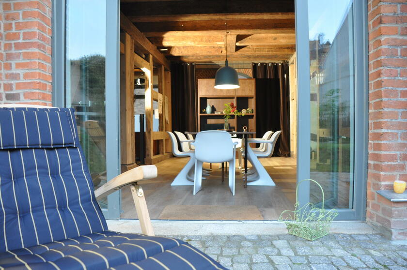 Im Erdgeschoss befinden sich der großzügige Aufenthaltsbereich - Essdiele, Bibliothek, Wohnküche und Wohnzimmer mit Kaminofen -, ein kleines Bad und ein Hauswirtschaftsraum. Durch das große Glastor auf der Hofseite der Diele gelangen sie auf die Terrasse.