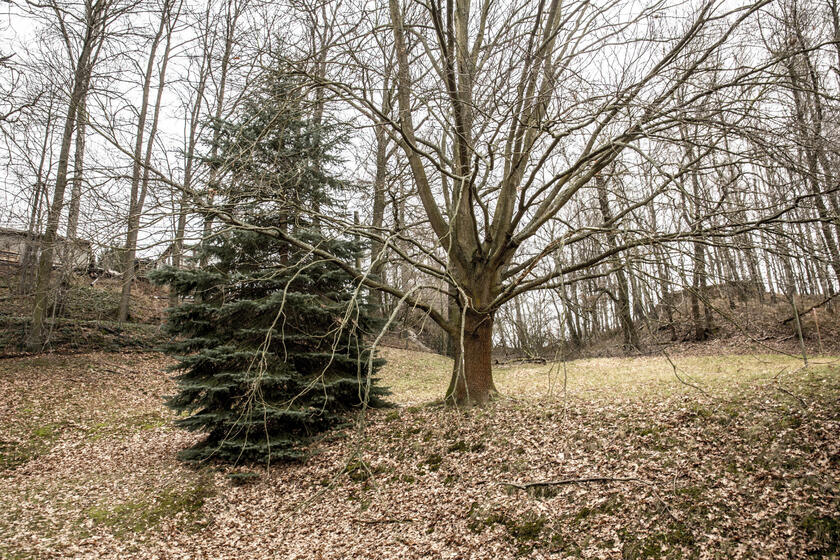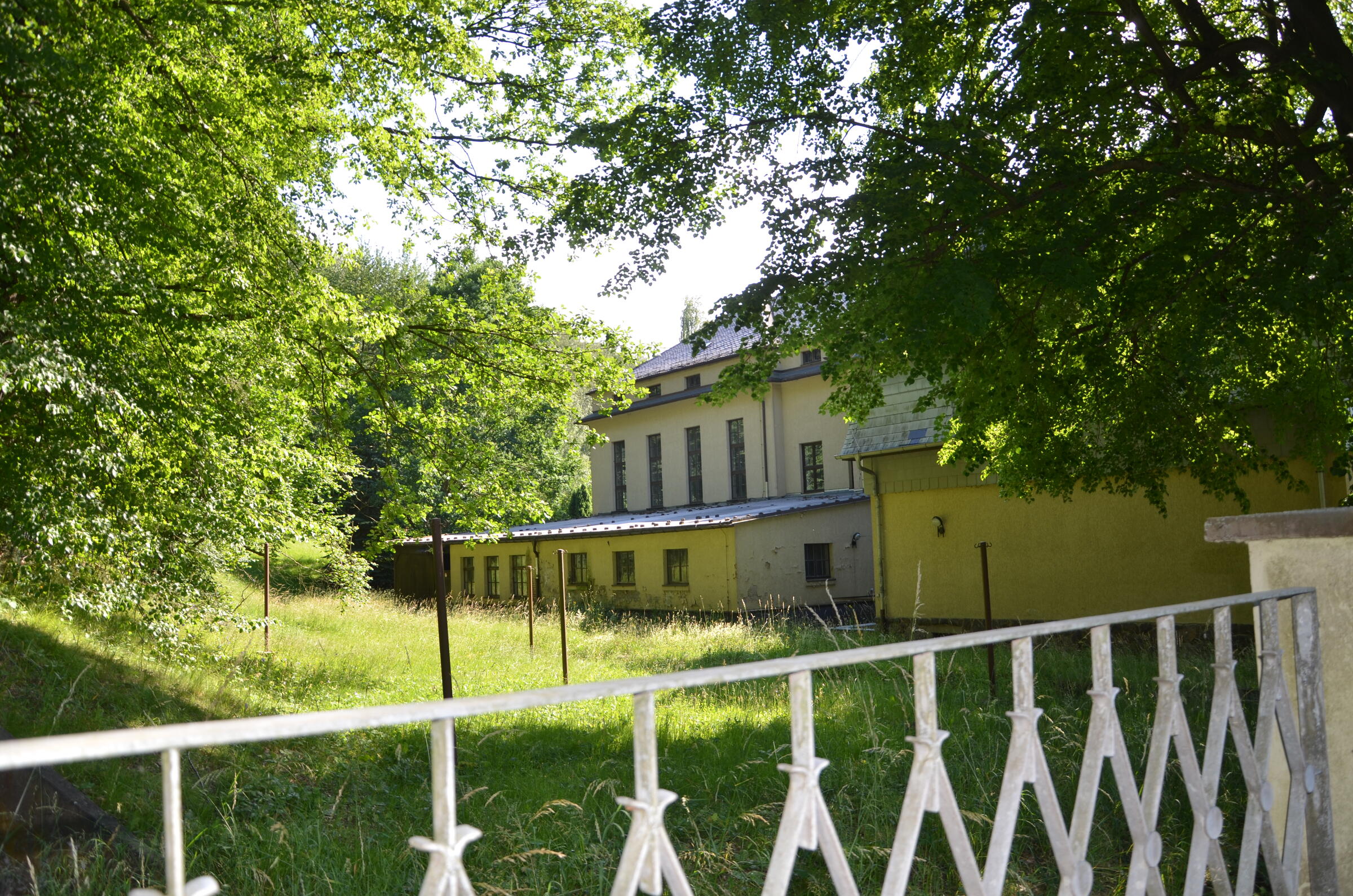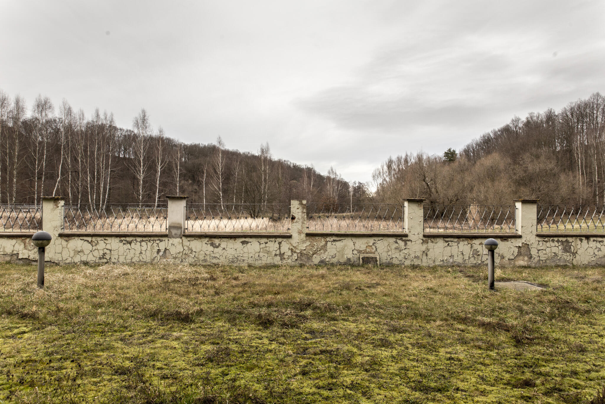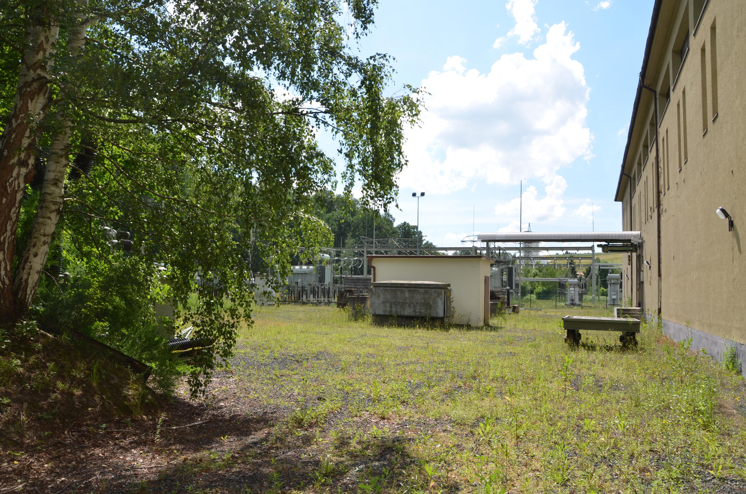 Das Außengelände im hinteren Bereich hat ein Brunnenhaus, eine Grünfläche und eine Schotterfläche, auf der noch einige alte Transformatoren stehen. Zudem befindet sich eine Grünfläche inklusive einem kleinen Wald seitlich des Grundstückes. Der Innenhof ist durch große Fichten und Rhododendron sichtgeschützt. In der Mitten befindet sich ein einfacher Springbrunnen. Das Objekt und dessen Mauer ist ein technisches Denkmal und steht somit unter Denkmalschutz.
