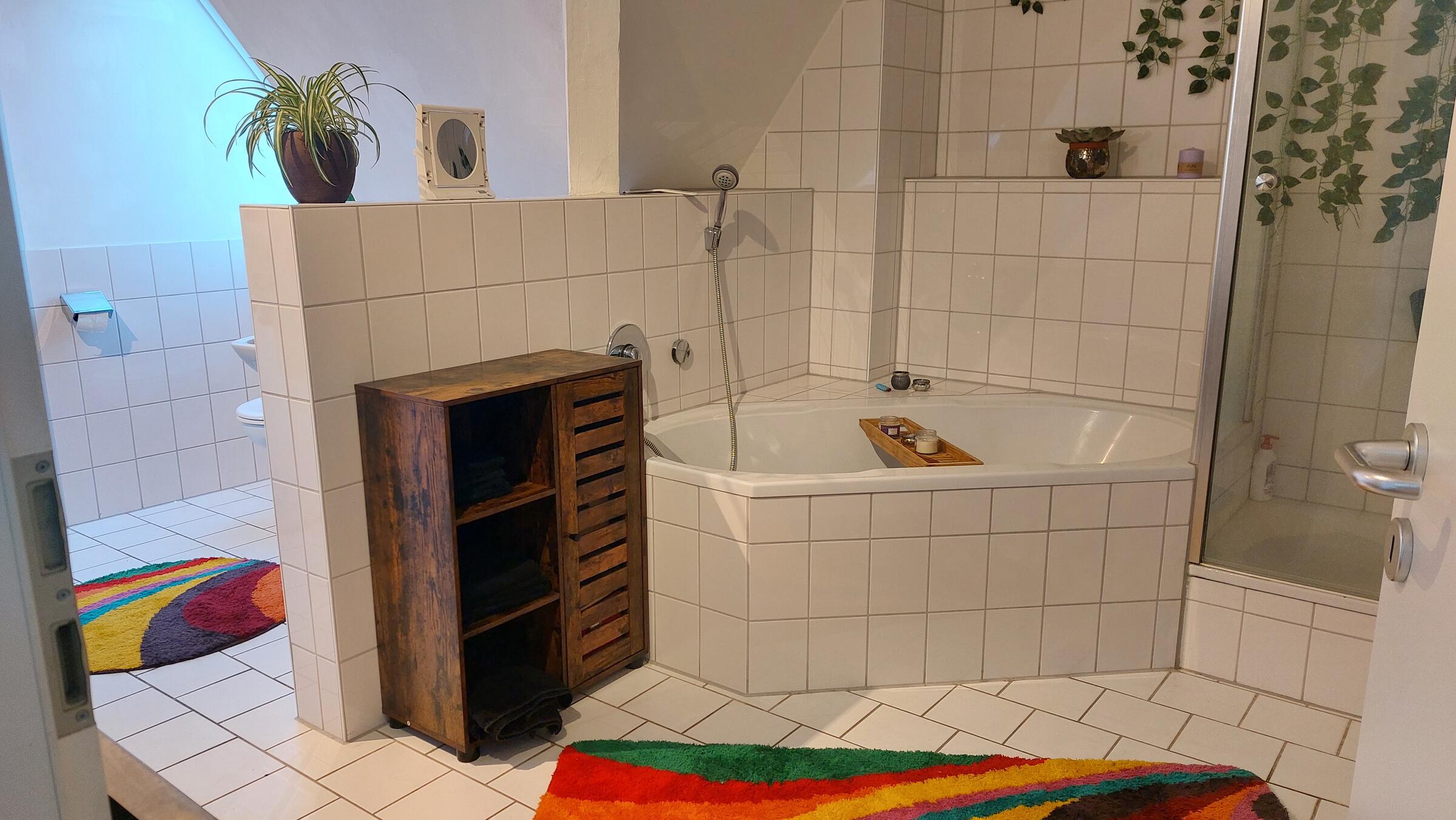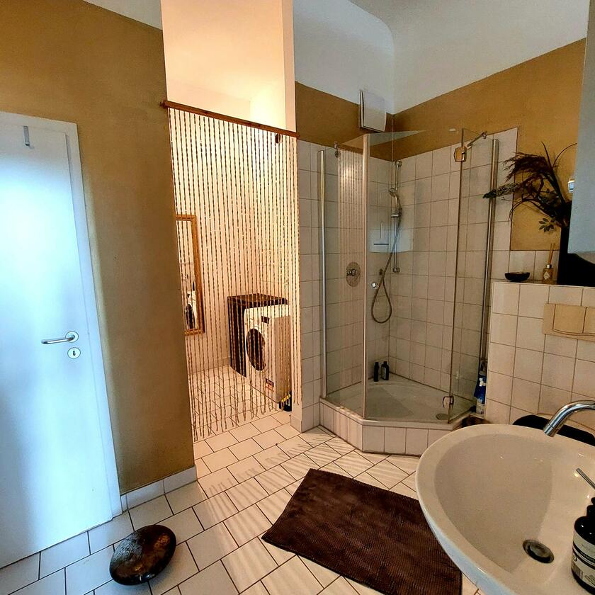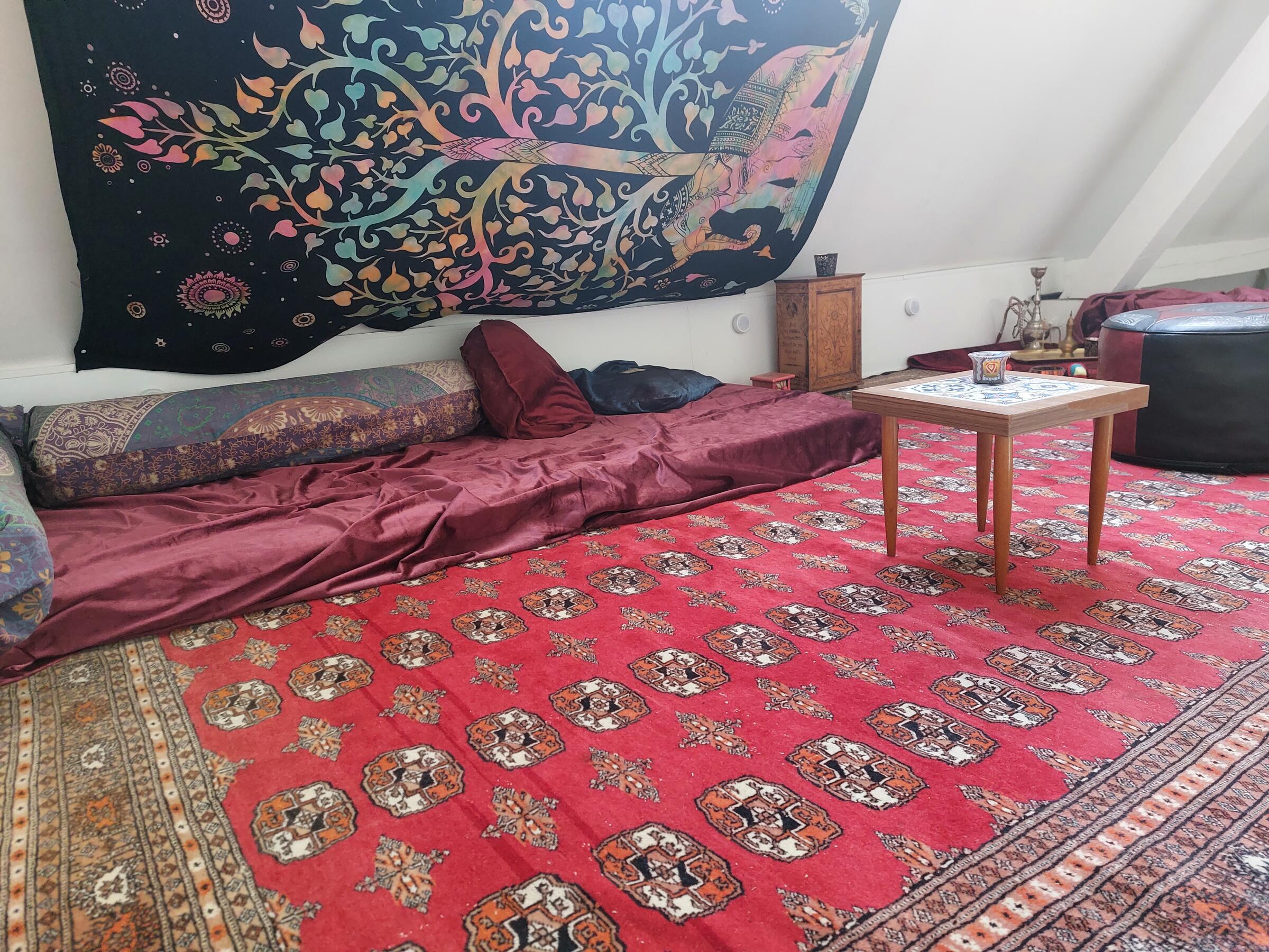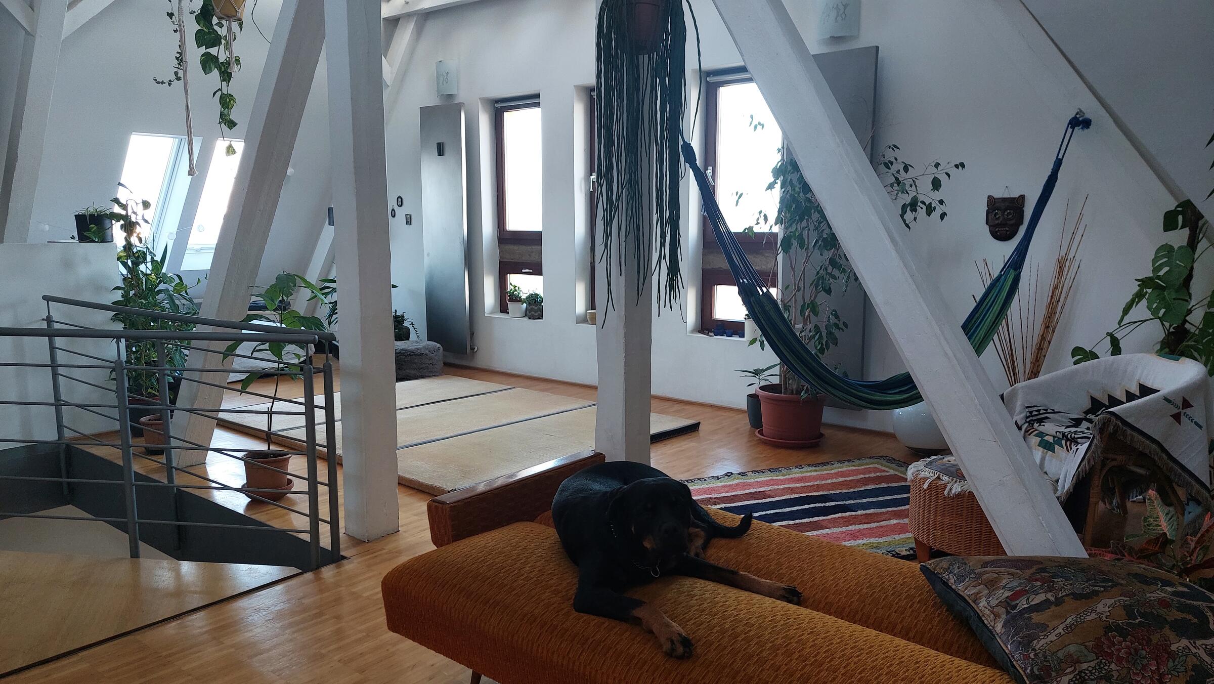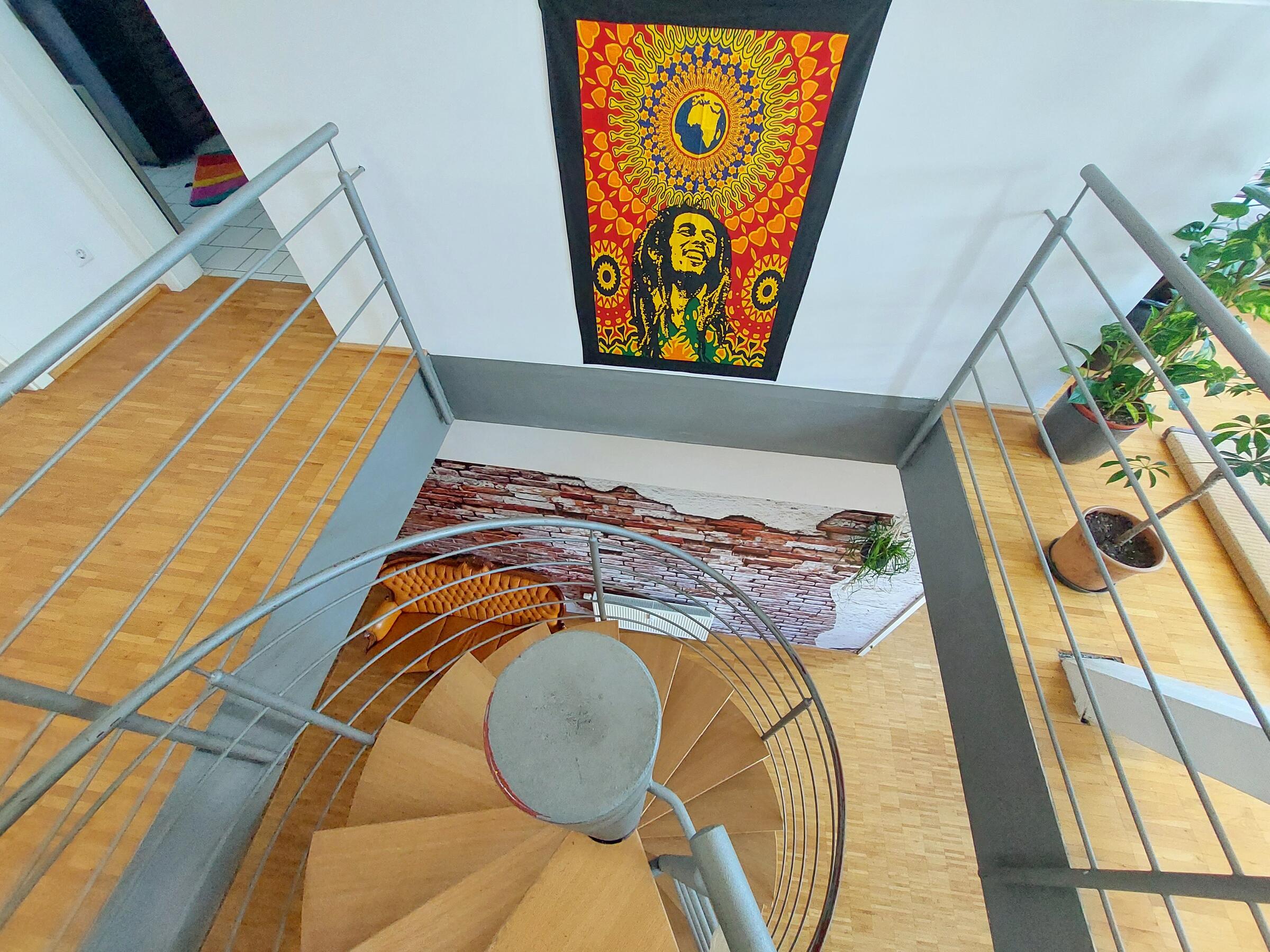 Diese offene und lichtdurchflutete ca. 200 m² große Maisonettewohnung im Industriestil befindet sich im 3. Obergeschoss. Im unteren Bereich der Wohnung befindet sich ein Tanz- und Yogastudio mit Umkleide, WC, Dusche und Wohnküche. Im oberen Teil befindet sich der Wohnbereich mit einem weiteren Badezimmer mit WC, Dusche und Badewanne. Eine Leiter führt zur Empore, welche sich quasi im 3. Obergeschoss des Hauses befindet und im orientalischen Einrichtungsstil gehalten ist. Der Boden ist mit echtem Parkett ausgelegt. Das Haus hat keinen Aufzug, verfügt aber über breite und relativ flache Steintreppen, die zur Wohnung führen.