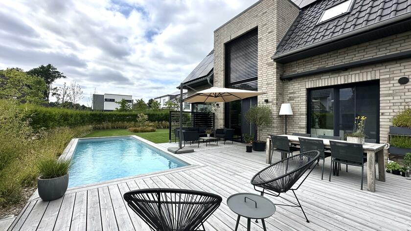 Unser modernes Haus befindet sich in einer ruhigen Wohngegend, an einer wenig befahrenen Anliegerstraße. Die Räume sind offen, modern und hell eingerichtet und gestaltet. Auf den Böden wurde Eichenholzparkett verlegt. Die Küche bietet eine große Kücheninsel. Die Fenster können mit Außenraffstores abgedunkelt werden. Es stehen separate Bereiche für Maske und Garderobe zur Verfügung. Im Außenbereich können unsere Terrasse, der Pool und der Garten für Produktionen genutzt werden. Direkt vor dem Haus gibt es 5 Pkw-Parkplätze. Weitere Stellplätze finden sich an der Straße. Der Flughafen Bremen ist in ca. 20 und die A1 in ca. 15 Autominuten erreichbar. Der Bahnhof ist nur 800 m vom Haus entfernt.