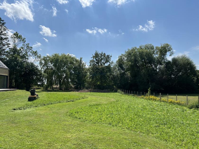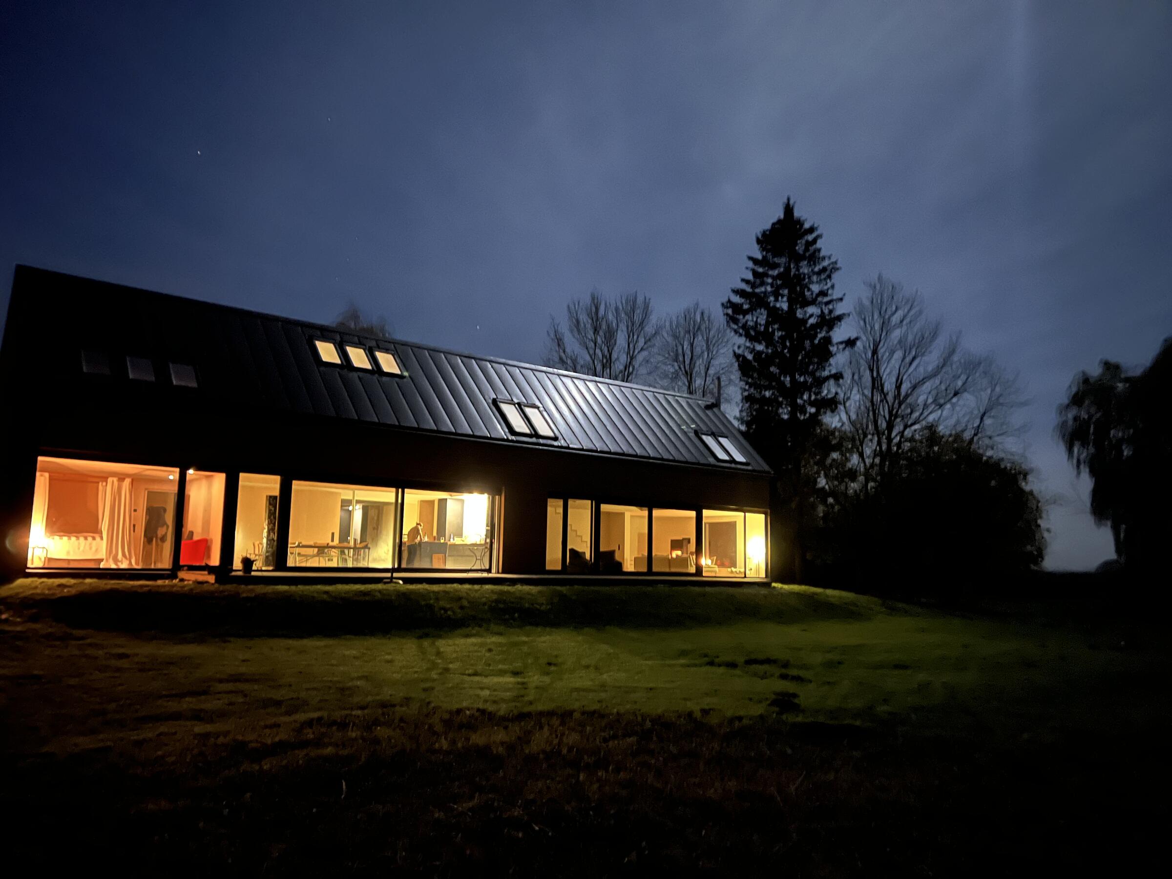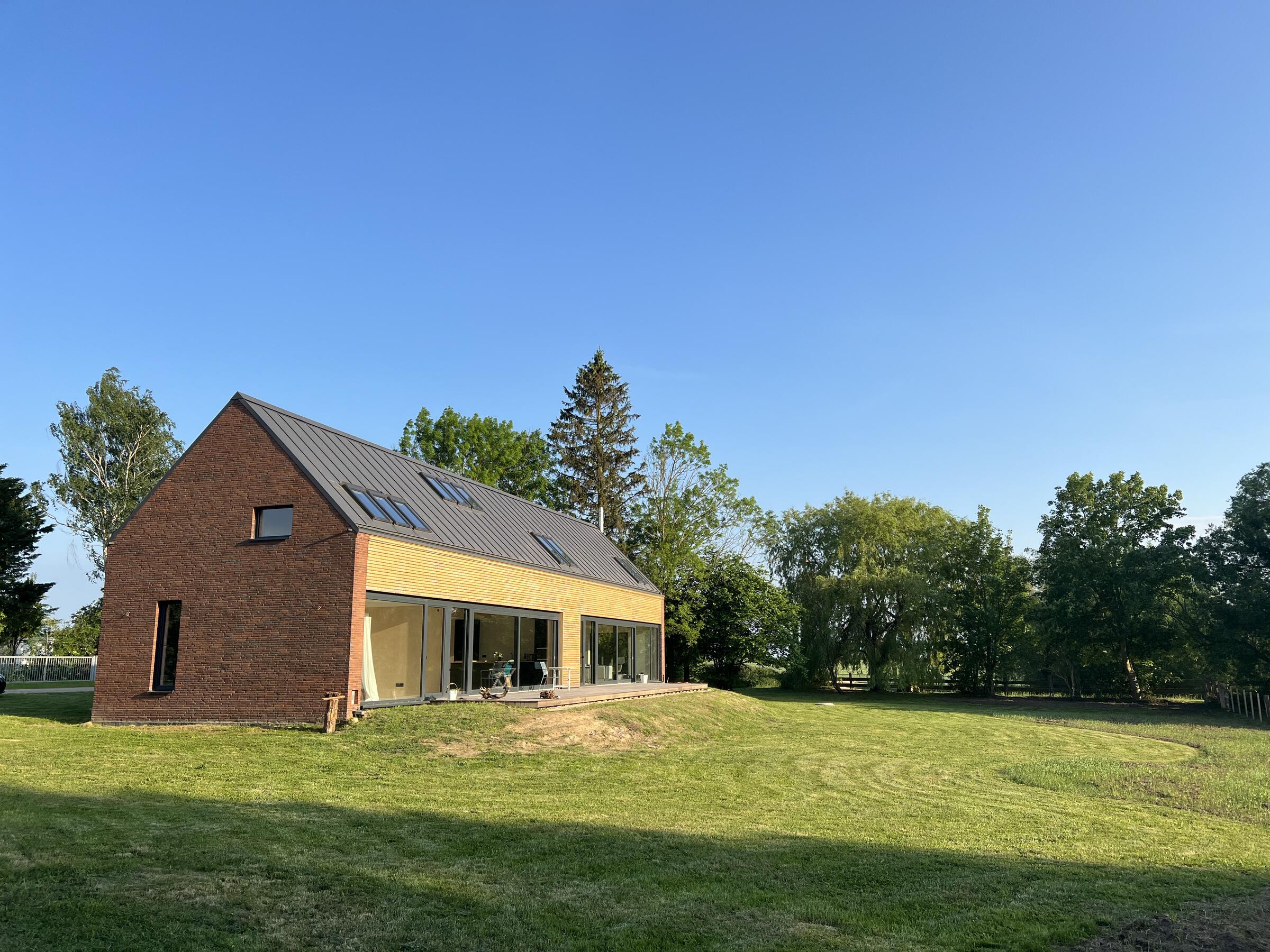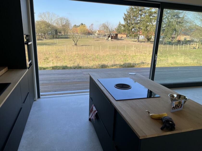 Das neu gebaute Ferienhaus befindet sich in der Mecklenburgischen Schweiz, in einer ruhigen und ländlichen Umgebung zwischen Güstrow und Rostock, Laage, Gnoien, Tessin. Die offene Bauweise des Langhauses bietet große, zugängliche Räume und Bereiche. Die Räume sind minimalistisch und funktional eingerichtet und flexibel umzugestalten. Es wurde viel Birkenholz verarbeitet. Auf den Böden ist hochwertiges Parkett verlegt. Die bodentiefen Fensterfronten ermöglichen viel Tageslicht in den Wohnräumen. Die Fenster verfügen über keine Verdunkelungsmöglichkeiten. Im Außenbereich steht eine große Wiesenfläche zur Verfügung. Pkw-Stellplätze gibt es auf dem Grundstück. Das Grundstück befindet sich an einer kaum befahrenen Sackgasse.