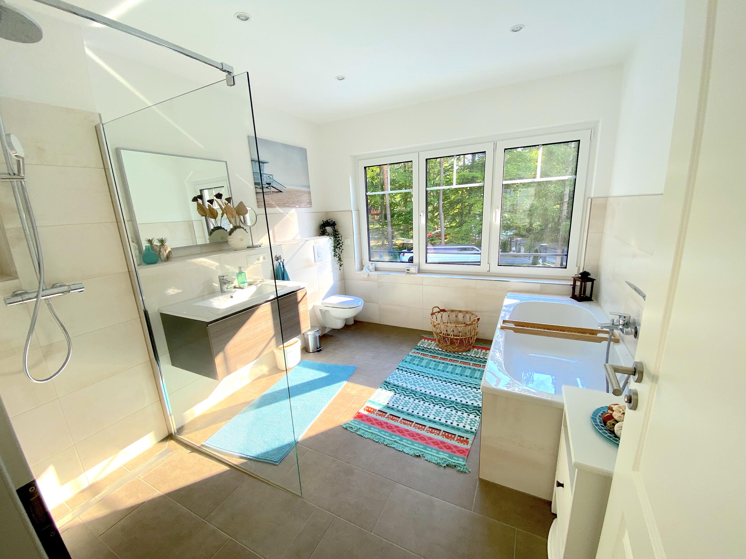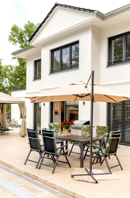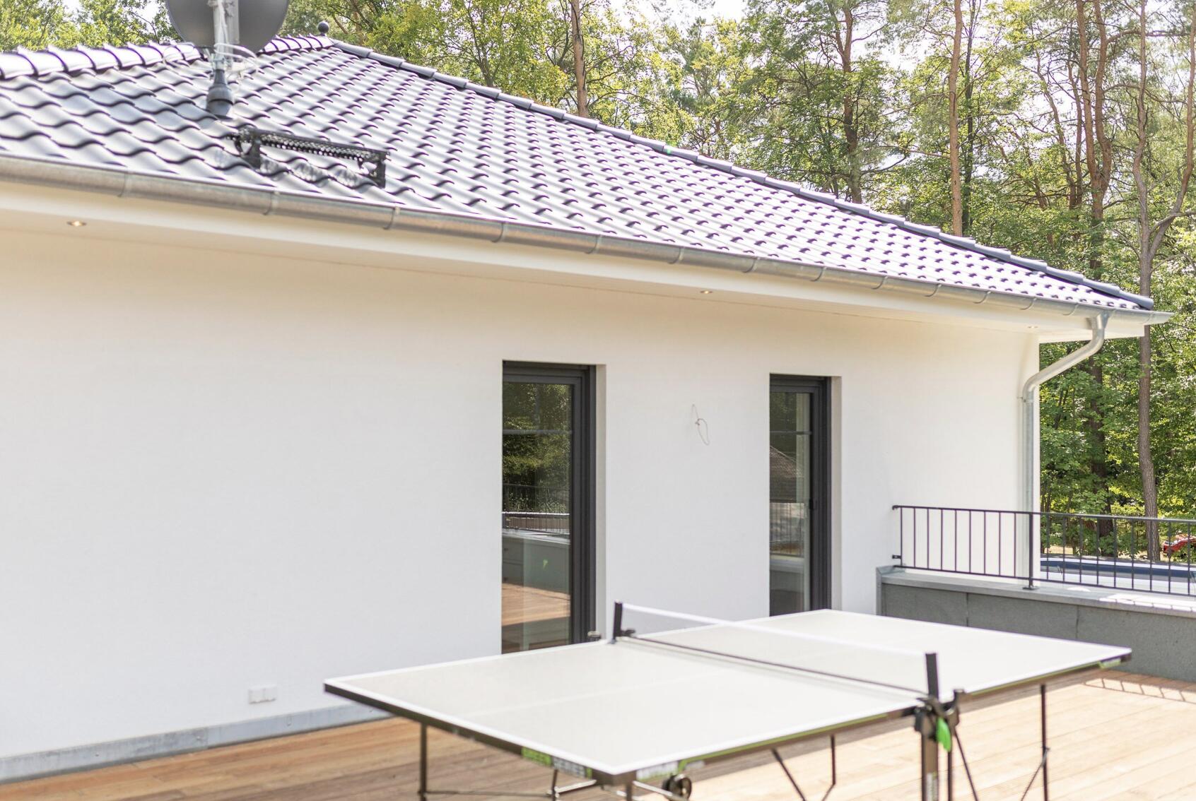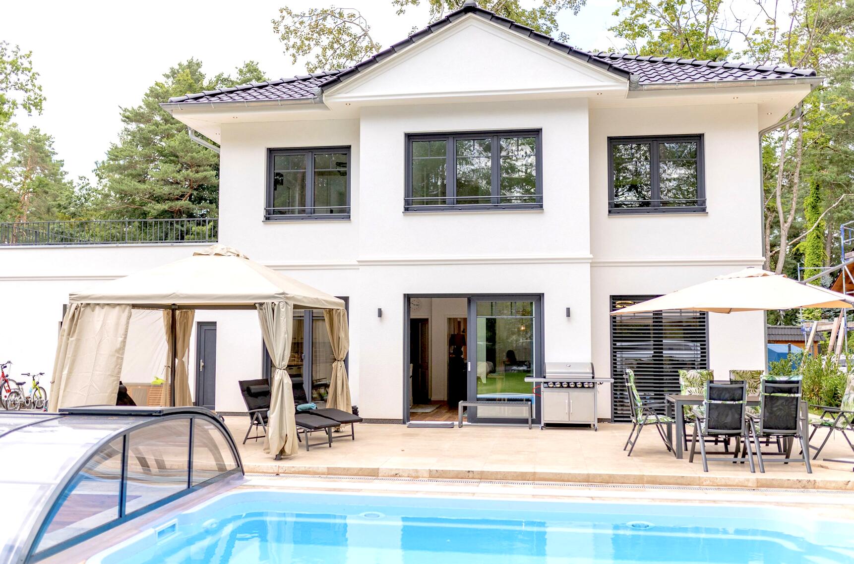 Unser Einfamilienhaus liegt idyllisch im Herzen von Wandlitz, nahe des Liepnitzsee in entspannter und bevorzugter Wohnlage nur 30 km von Berlin entfernt. 2020 im ländlichen Stil erbaut, bietet dieses Haus auf fast 200 m² Wohnfläche den Landhaus-Charme par excellence mit einem offen gestalteten Wohnbereich mit angrenzender großflächiger Außenterrasse. Der gesamte Poolbereich ist großzügig gestaltet und mit Naturstein verlegt. Hier finden Sie Relax-Liegen, einen Pavillon, sowie einen BBQ Grill. Der mit einer Salzanlage betriebene Pool kann sowohl überdacht als auch offen benutzt werden. Auf der Doppelgarage gibt es eine große Dachterrasse. Zum Haus gehört ebenfalls ein großzügig begrünter Garten.