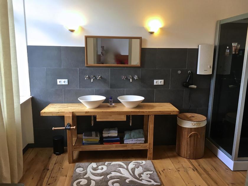 Unser Haus ist ein historischer Bahnhof von 1868, ein Kulturdenkmal in Alleinlage am Ortsrand, aus massivem Rotsandstein errichtet und in den letzten 4 Jahren grundlegend saniert. Er bietet zwei riesige Wohnungen à 170 m² mit massiven originalen Holzdielen und 3,50 bis 4 m hohen Räumen. Die Wohnungen sind hell durch sehr große Fenster in alle Himmelsrichtungen. Im Erdgeschoss gibt es einen Saal von 56 m² mit 6 riesigen Fenstern und Flügeltüren. Die Küche im EG ist 30 m² groß und im industriellen Designerstil eingerichtet (wird Ende 2019 vollendet). Das EG hat 3 Ausgänge mit Doppeltüren zum Bahnsteig, einen zum Garten und einen zur Südseite. Die 3 großen Badezimmer haben Tageslicht und können für die Maske genutzt werden. Garderobe ist in den Schlafräumen möglich. Teamaufenthalt je nach Drehort im Wohnbereich, der Lounge oder dem Saal. Das Gebäude hat einen Gewölbekeller aus Sandstein und einen Dachstuhl mit jeweils ebenfalls 170 m² Grundfläche und über 3 m hohen Decken. Nach Westen liegt ein Garten mit Rasen und Bäumen und nach Osten eine terrassierte Grünfläche, insgesamt 820 m². Vor dem Gebäude ist ein eigener Parkplatz und Parkgelegenheiten für weitere Fahrzeuge (Wiese). Gamburg liegt zwischen Tauber-Bischofsheim, Bad Mergentheim und Wertheim und ist in einer Stunde von Frankfurt und Stuttgart aus zu erreichen.