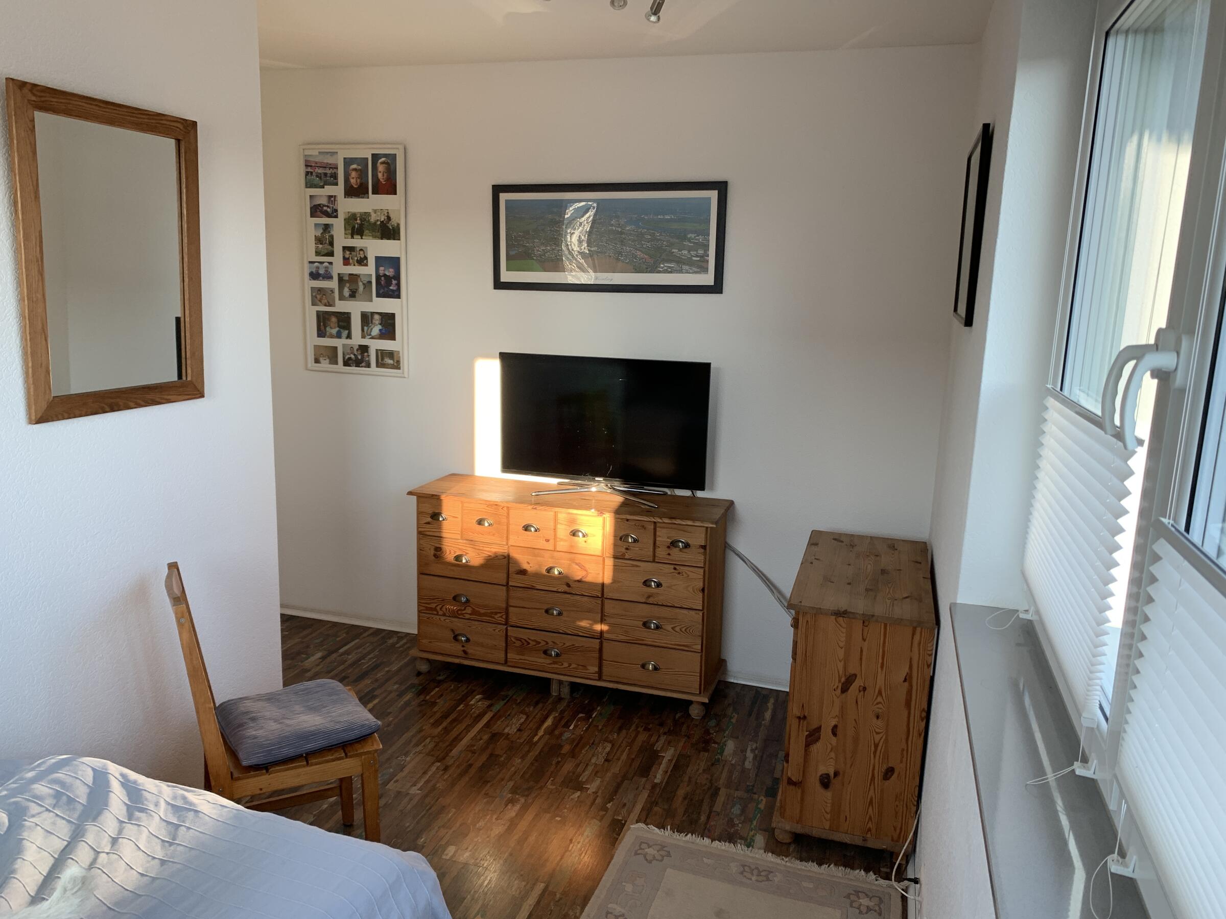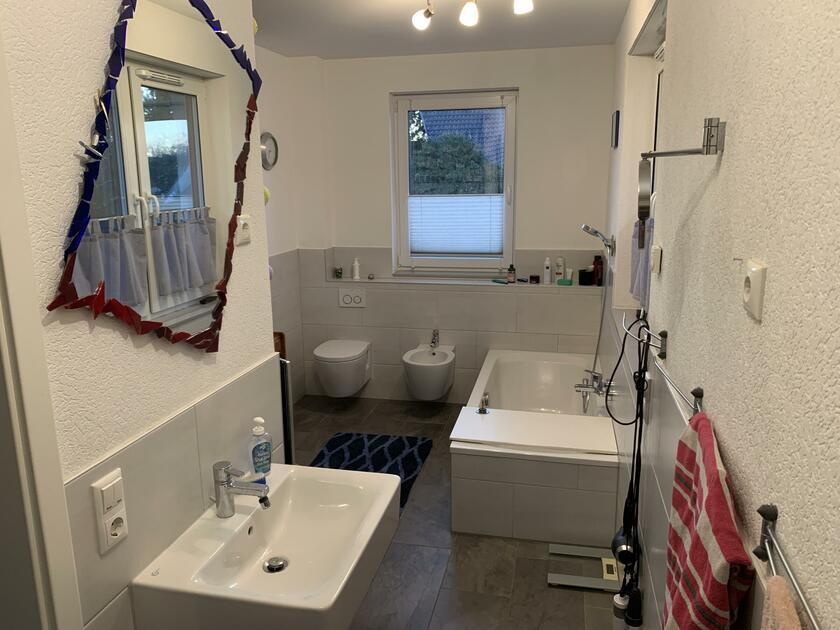 Das Haus befindet sich in einer ruhigen Wohngegend an einer wenig befahrenen Straße. Die Räume sind hell und funktional eingerichtet. Die Wohnräume im Erdgeschoss sind offen gestaltet. Die Küche verfügt über eine große Kochinsel. Die Böden aller Räume sind grau gefliest. Die Fenster können mit Hilfe von elektrischen Außenrollos vollständig verdunkelt werden. Nach Absprache dürfen die Räume umgestaltet werden. Im Außenbereich können zwei Terrassen, die jeweils über Markisen verfügen, und der große Garten genutzt werden. Zwei Pkw-Parkplätze bestehen auf der Auffahrt des Grundstückes. Weitere Parkplätze gibt es auf der vorbeiführenden Spielstraße.