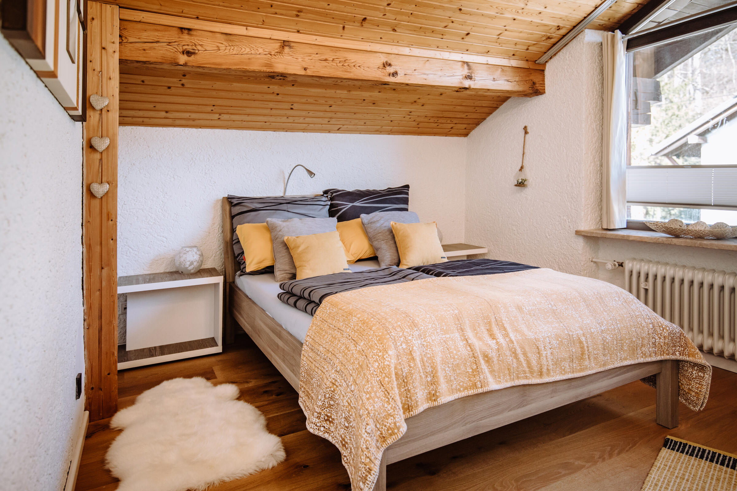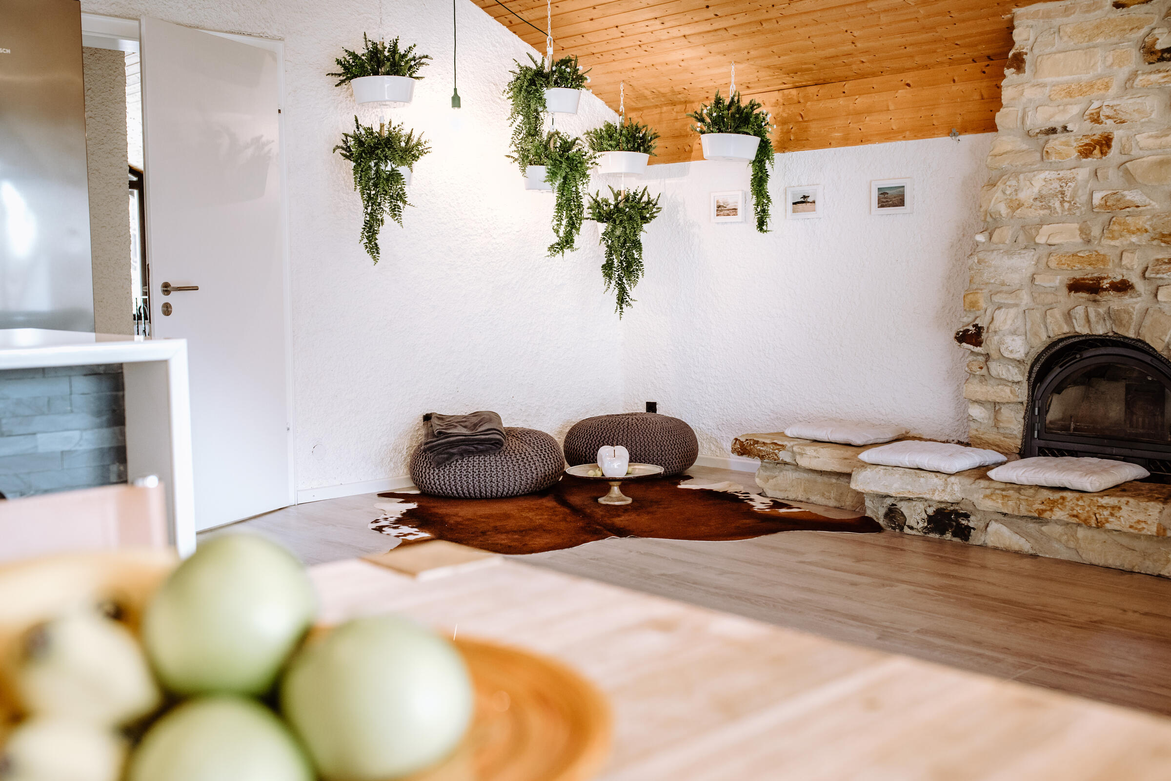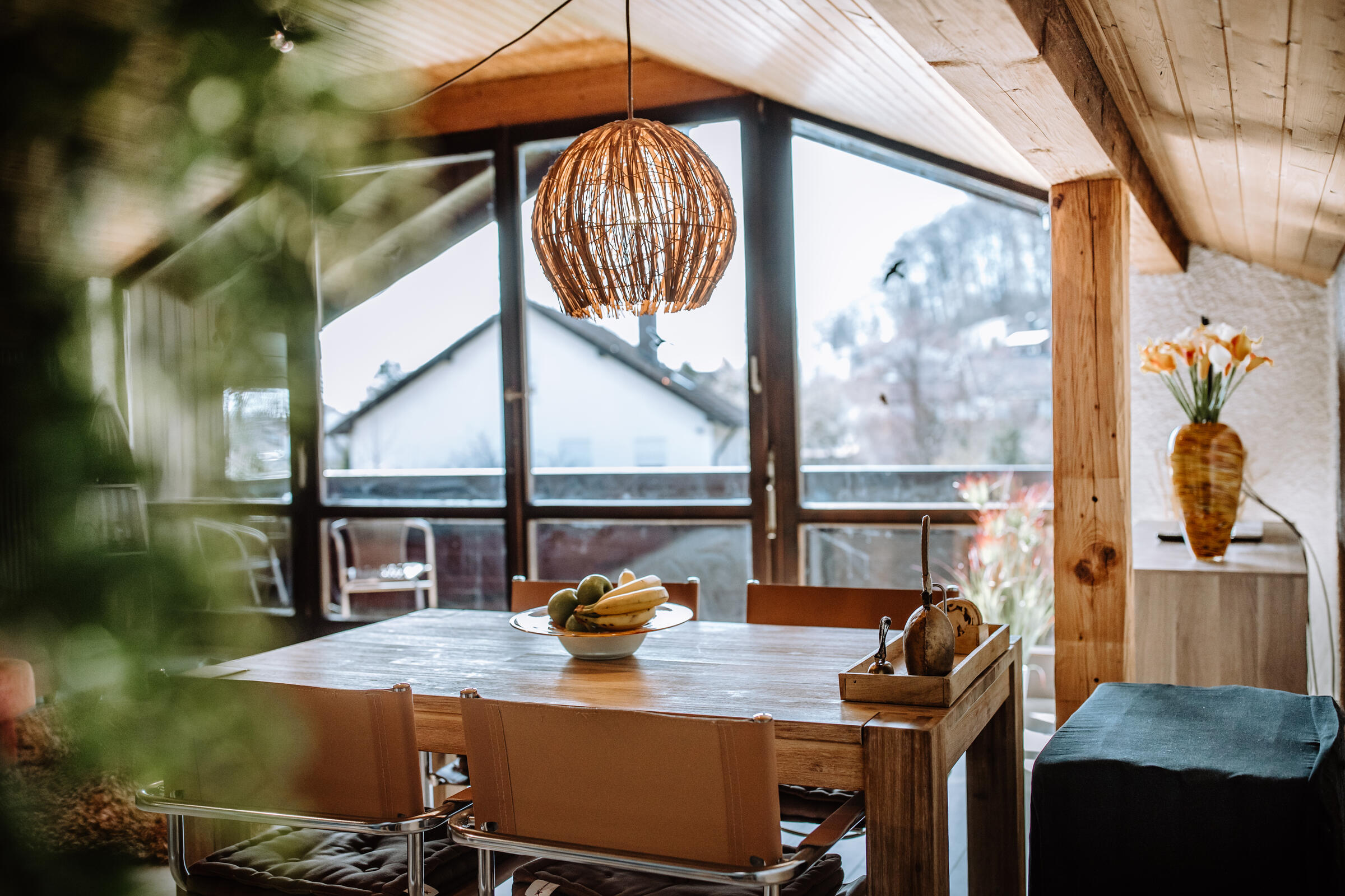 Die idyllische 2-Zimmer-Wohnung befindet sich separiert im Dachgeschoss unseres Einfamilienhauses. Der großzügige Wohn- und Essbereich mit integrierter Kochinsel sorgt für ein angenehmes Raumgefühl. Ein doppelflügeliger Balkonzugang lässt den Raum noch größer erscheinen. Der Balkon ist mit Mosaik-Tischchen und Stühlen möbliert. Eine kleine Chill-Ecke lädt zum Verweilen ein. Sie bietet Sitzgelegenheiten, ebenso die Kaminbank aus Jurakalk-Naturstein. Der Schlafbereich gen Osten lässt Morgensonne ins Bett fallen. Ein Eichenboden mit Teppichen verschafft ein wohnliches Klima. Die Ausblicke sind in alle Richtungen unverbaut.