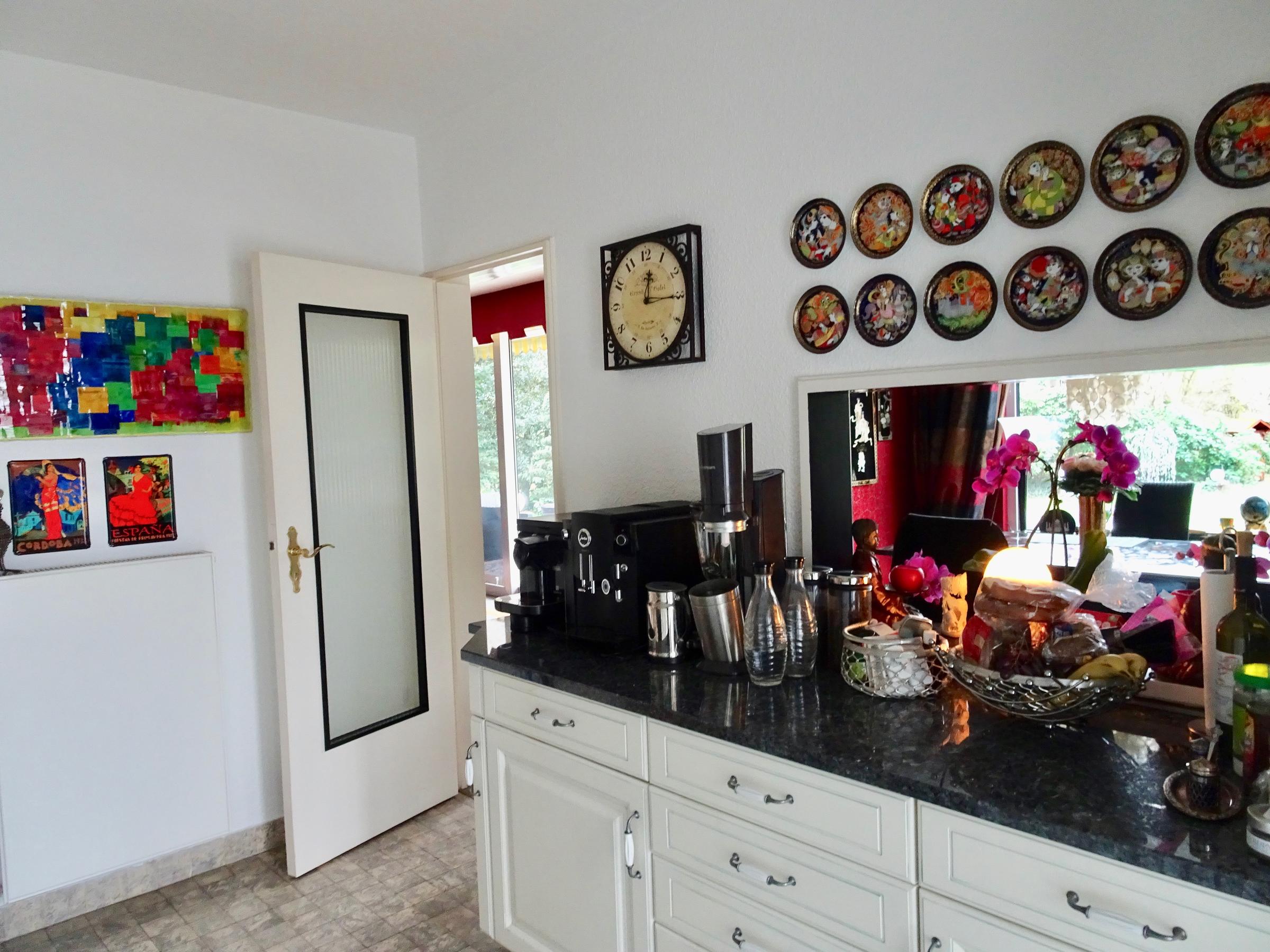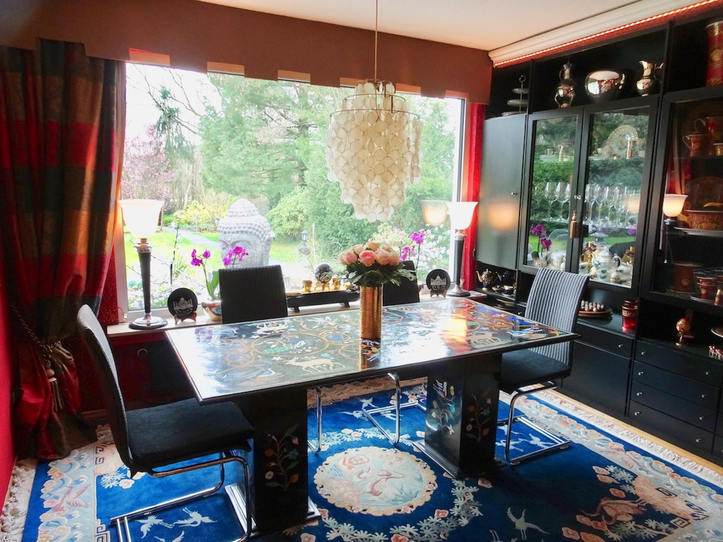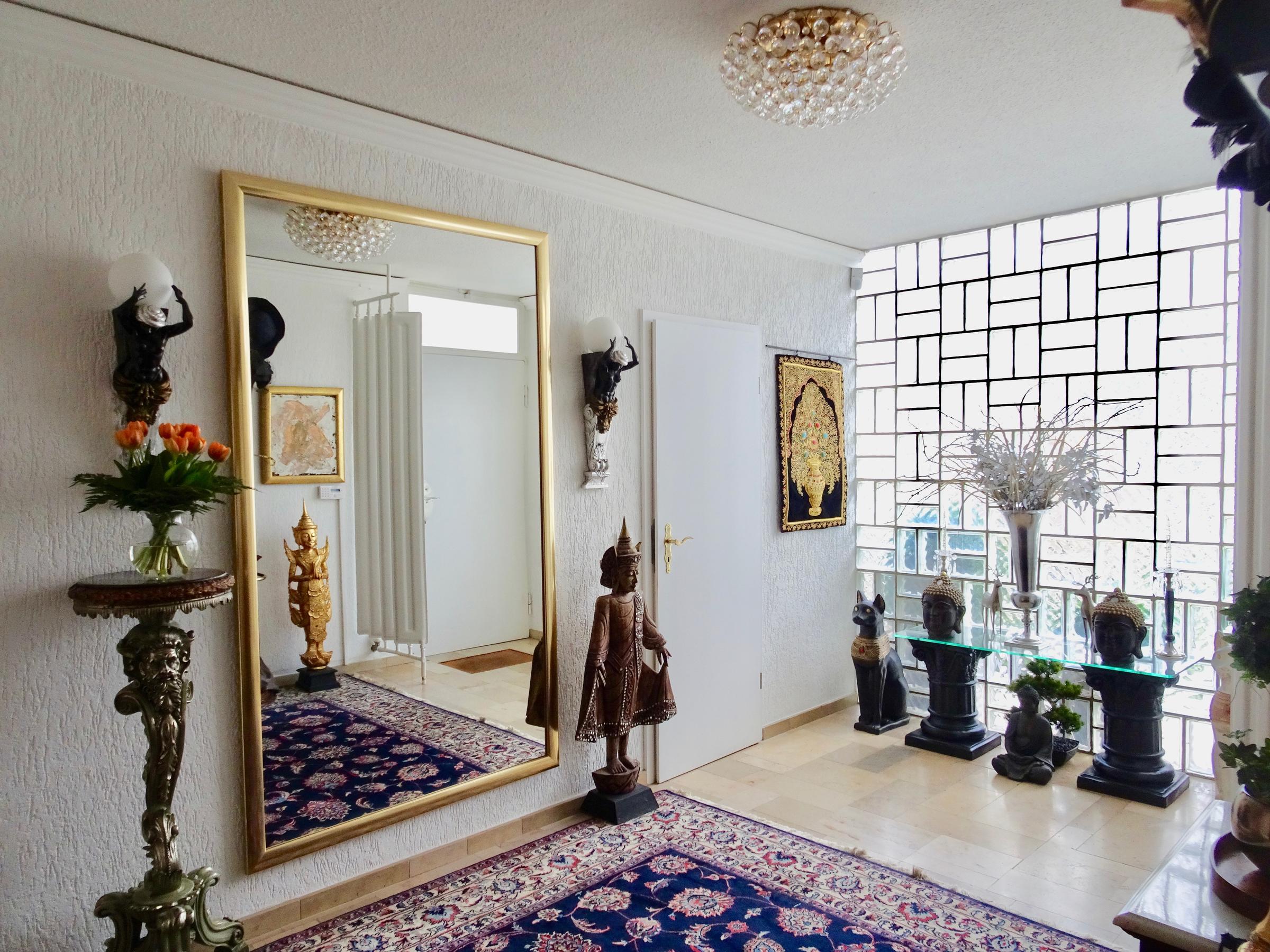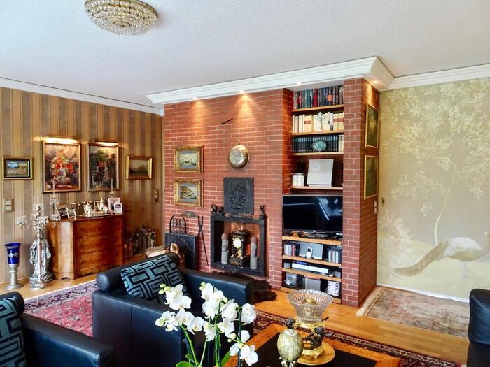 Das freistehende Haus in Wuppertal wurde Anfang der 60er Jahre erbaut und steht auf einem großen, parkähnlichen Grundstück von ca. 2000 m². Die Innenbereiche sind extravagant eingerichtet. Die meisten Räume können über große Schiebetüren miteinander verbunden werden. Der Eingangsbereich ist durch die typischen Glasbausteine sehr hell. Im Erdgeschoss befindet sich das große Wohnzimmer mit offenem Kamin, von hier hat man Zugang auf die Terrasse und einen schönen Blick in den Garten mit kleinem Mosaikpool (inklusive Schwalldusche und farbiger Beleuchtung). An das Wohnzimmer schließt sich das offene Esszimmer an - von hier gelangt man auch in die Küche (Durchreiche vorhanden). Ebenfalls vom Wohnzimmer aus gelangt man durch eine Tapetentür ins Schlafzimmer - ebenfalls mit Zugang zur Terrasse - und einem en suite Badezimmer aus Granit mit Dusche und Badewanne. Ein Gäste-WC ist ebenso vorhanden wie ein Ankleidezimmer. Das Haus ist voll unterkellert und bietet auch hier viel Platz. Die typische Bar darf ebenso wenig fehlen, wie der Weinkeller, ein großes Kinozimmer, Gästezimmer, mehrere Wirtschaftsräume sowie ein weiteres Granitbad mit Dusche. Der Garten ist nicht einsehbar und grenzt an ein kleines Waldgebiet. Der Vorgarten ist mit asiatischen Gewächsen ebenfalls ansprechend gestaltet. Zum Haus gehören zwei Garagen. Zudem ist genügend Parkraum vor dem Haus vorhanden.