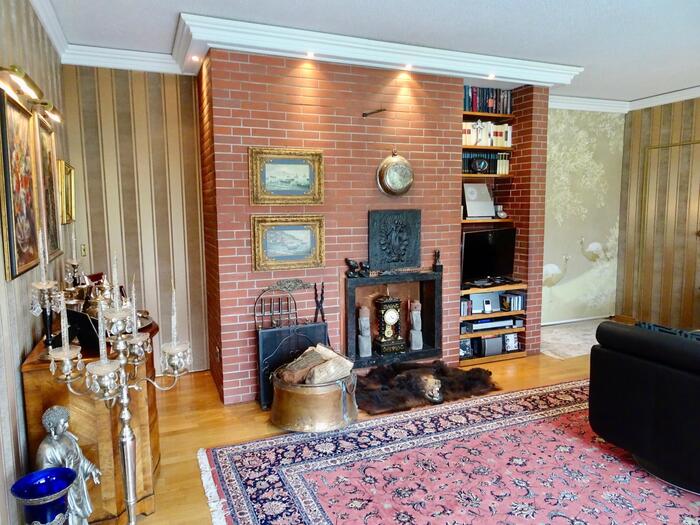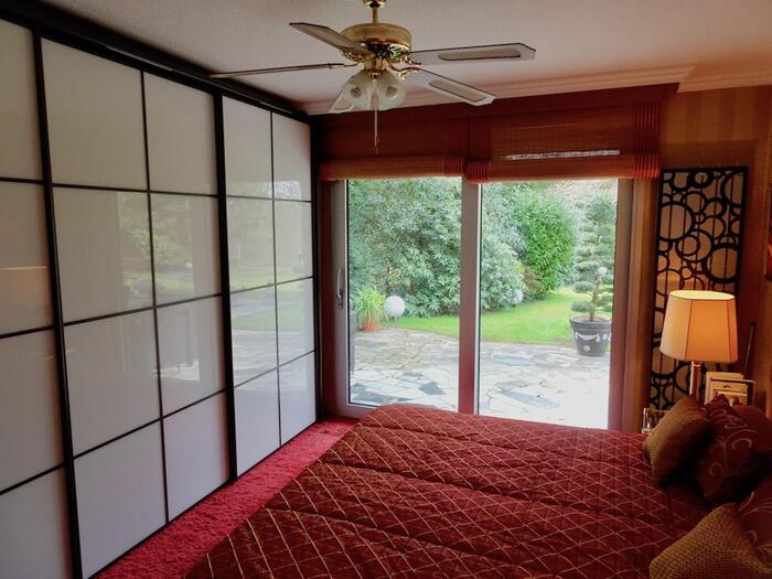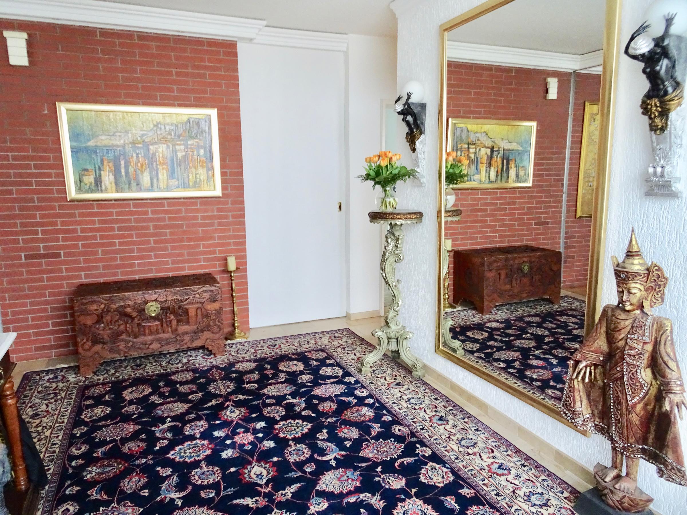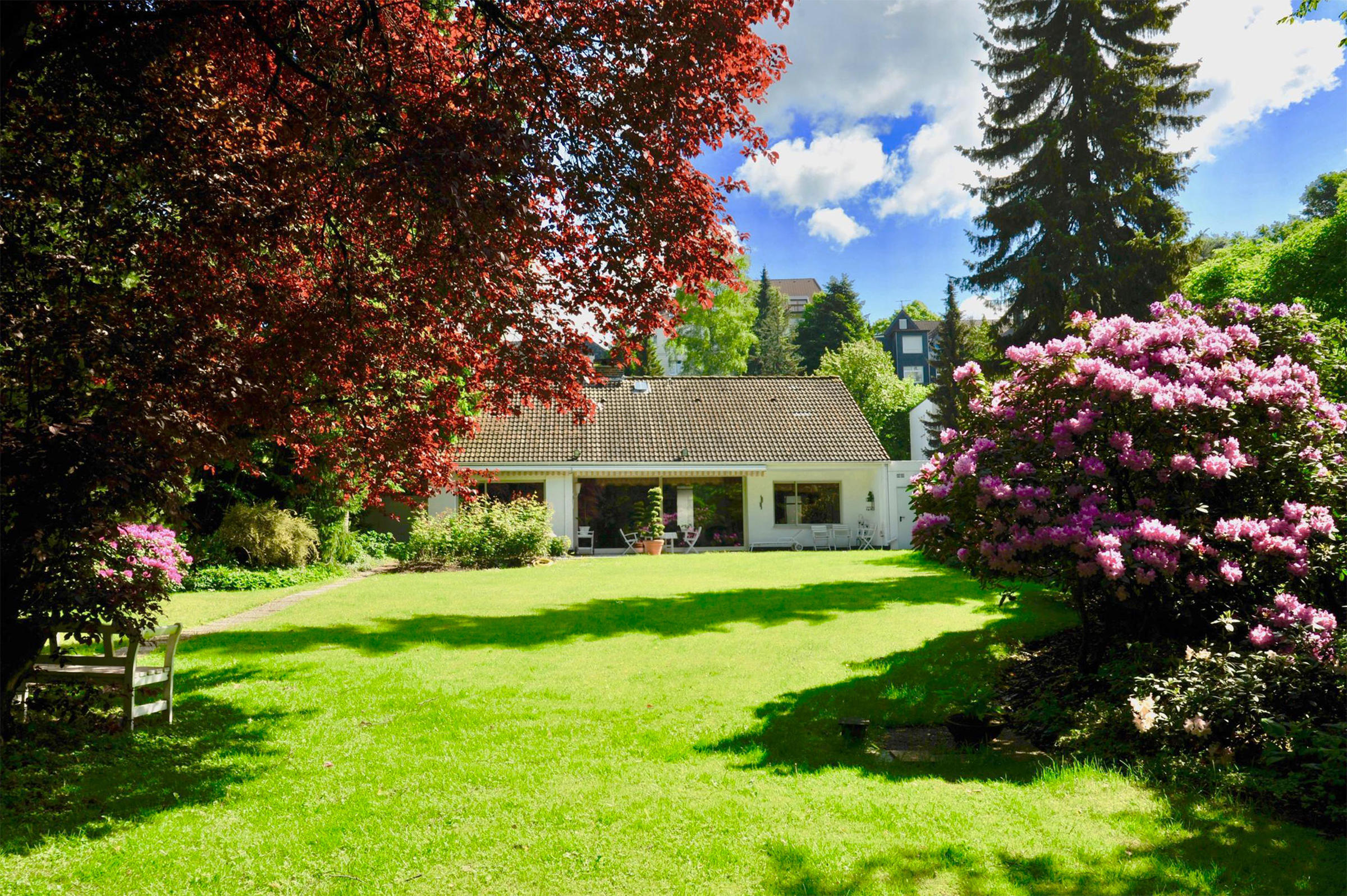 Das freistehende Haus in Wuppertal wurde Anfang der 60er Jahre erbaut und steht auf einem großen, parkähnlichen Grundstück von ca. 2000 m². Die Innenbereiche sind extravagant eingerichtet. Die meisten Räume können über große Schiebetüren miteinander verbunden werden. Der Eingangsbereich ist durch die typischen Glasbausteine sehr hell. Im Erdgeschoss befindet sich das große Wohnzimmer mit offenem Kamin, von hier hat man Zugang auf die Terrasse und einen schönen Blick in den Garten mit kleinem Mosaikpool (inklusive Schwalldusche und farbiger Beleuchtung). An das Wohnzimmer schließt sich das offene Esszimmer an - von hier gelangt man auch in die Küche (Durchreiche vorhanden). Ebenfalls vom Wohnzimmer aus gelangt man durch eine Tapetentür ins Schlafzimmer - ebenfalls mit Zugang zur Terrasse - und einem en suite Badezimmer aus Granit mit Dusche und Badewanne. Ein Gäste-WC ist ebenso vorhanden wie ein Ankleidezimmer. Das Haus ist voll unterkellert und bietet auch hier viel Platz. Die typische Bar darf ebenso wenig fehlen, wie der Weinkeller, ein großes Kinozimmer, Gästezimmer, mehrere Wirtschaftsräume sowie ein weiteres Granitbad mit Dusche. Der Garten ist nicht einsehbar und grenzt an ein kleines Waldgebiet. Der Vorgarten ist mit asiatischen Gewächsen ebenfalls ansprechend gestaltet. Zum Haus gehören zwei Garagen. Zudem ist genügend Parkraum vor dem Haus vorhanden.