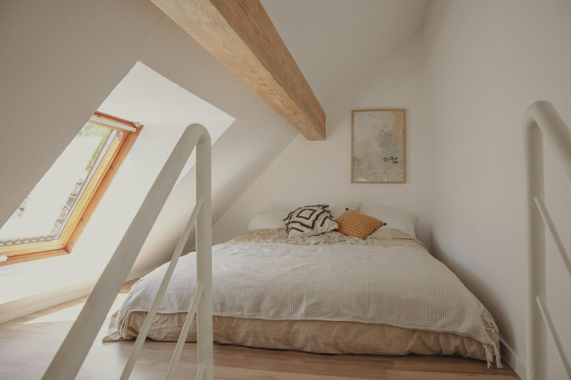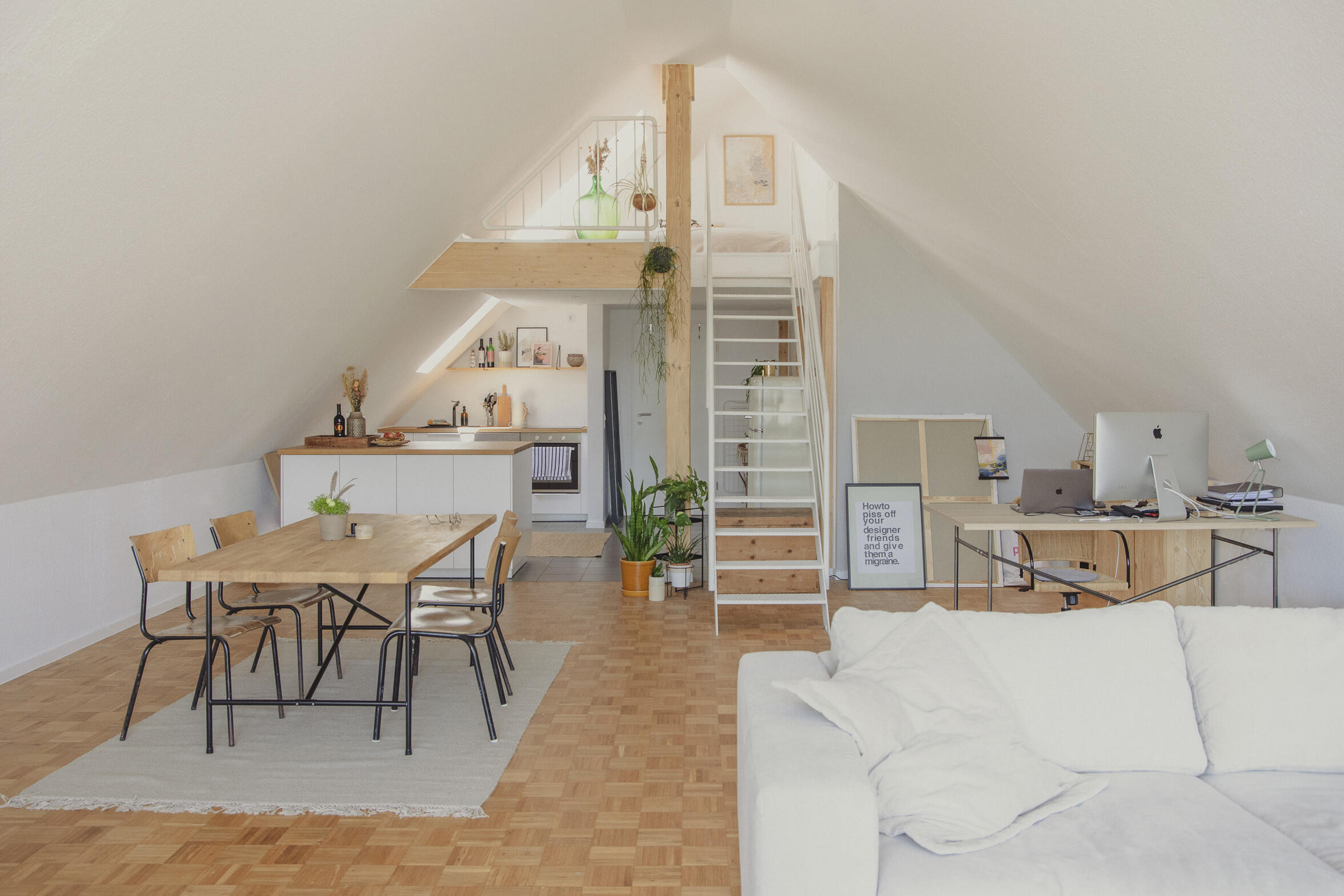 Offene, helle Wohnung mit hohen Decken, einer riesigen Fensterfront mit Blick auf das Tal, gemütlichen Schlafecke auf zweiter Ebene und einer modernen Küche.
