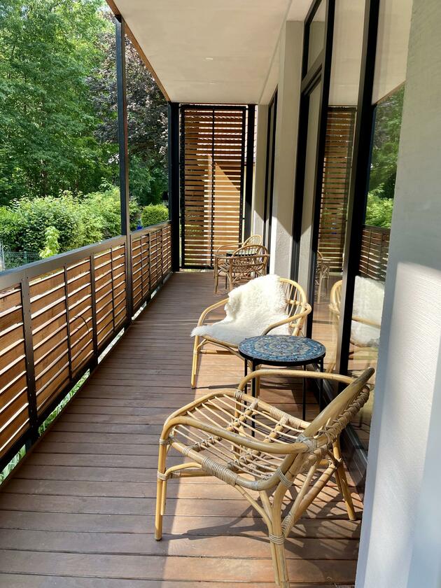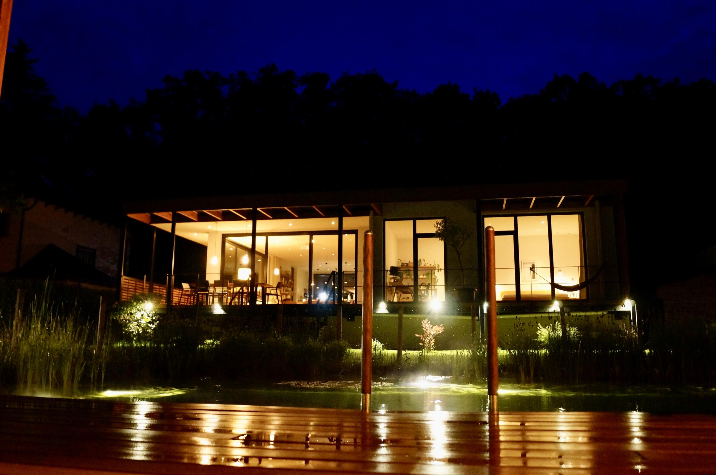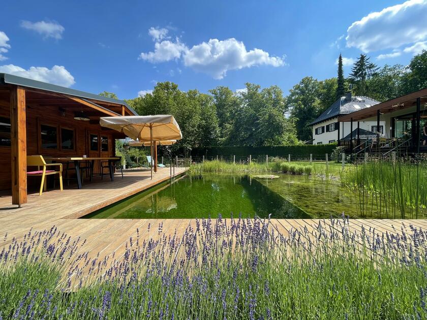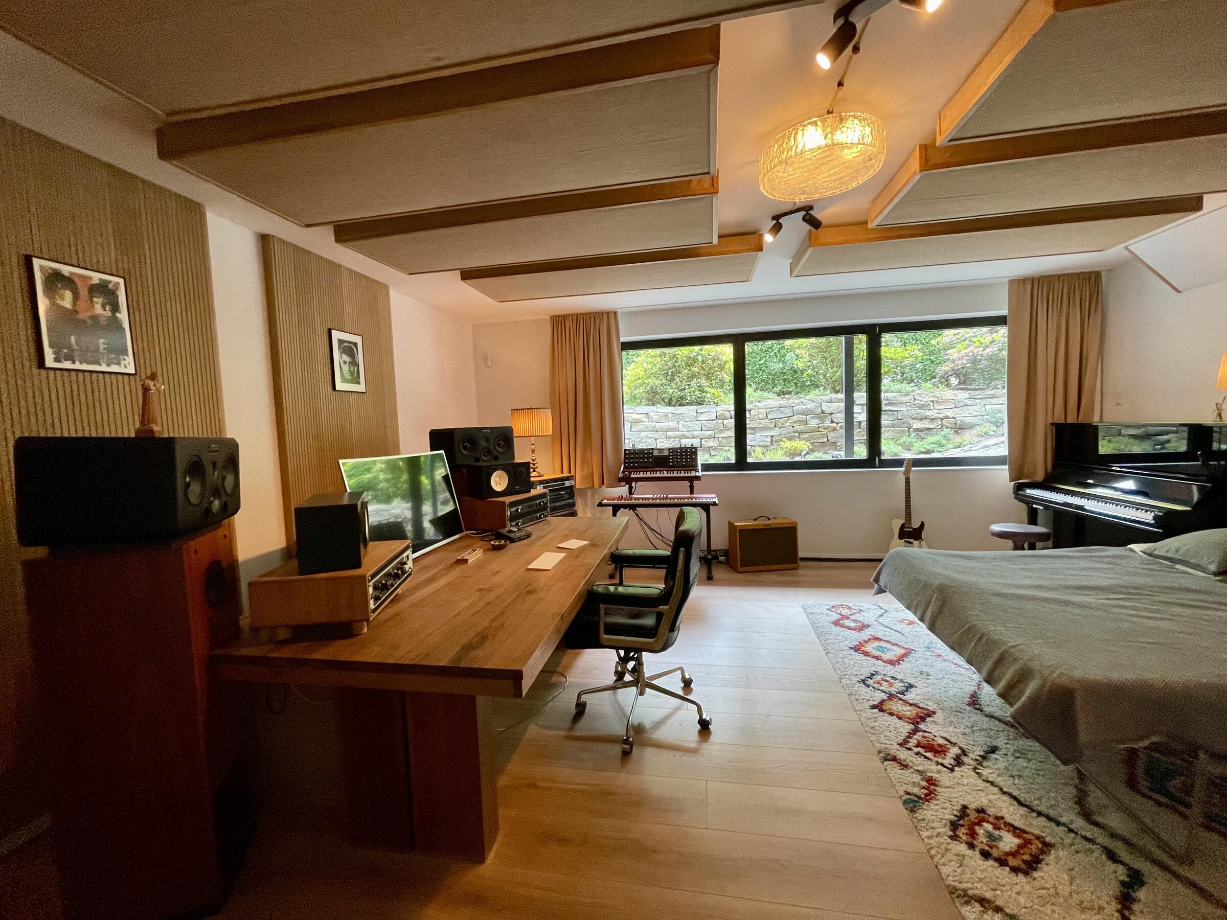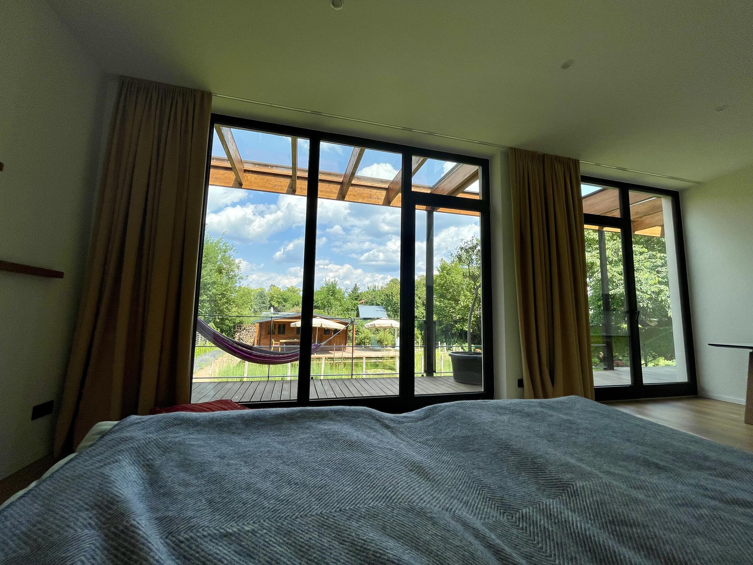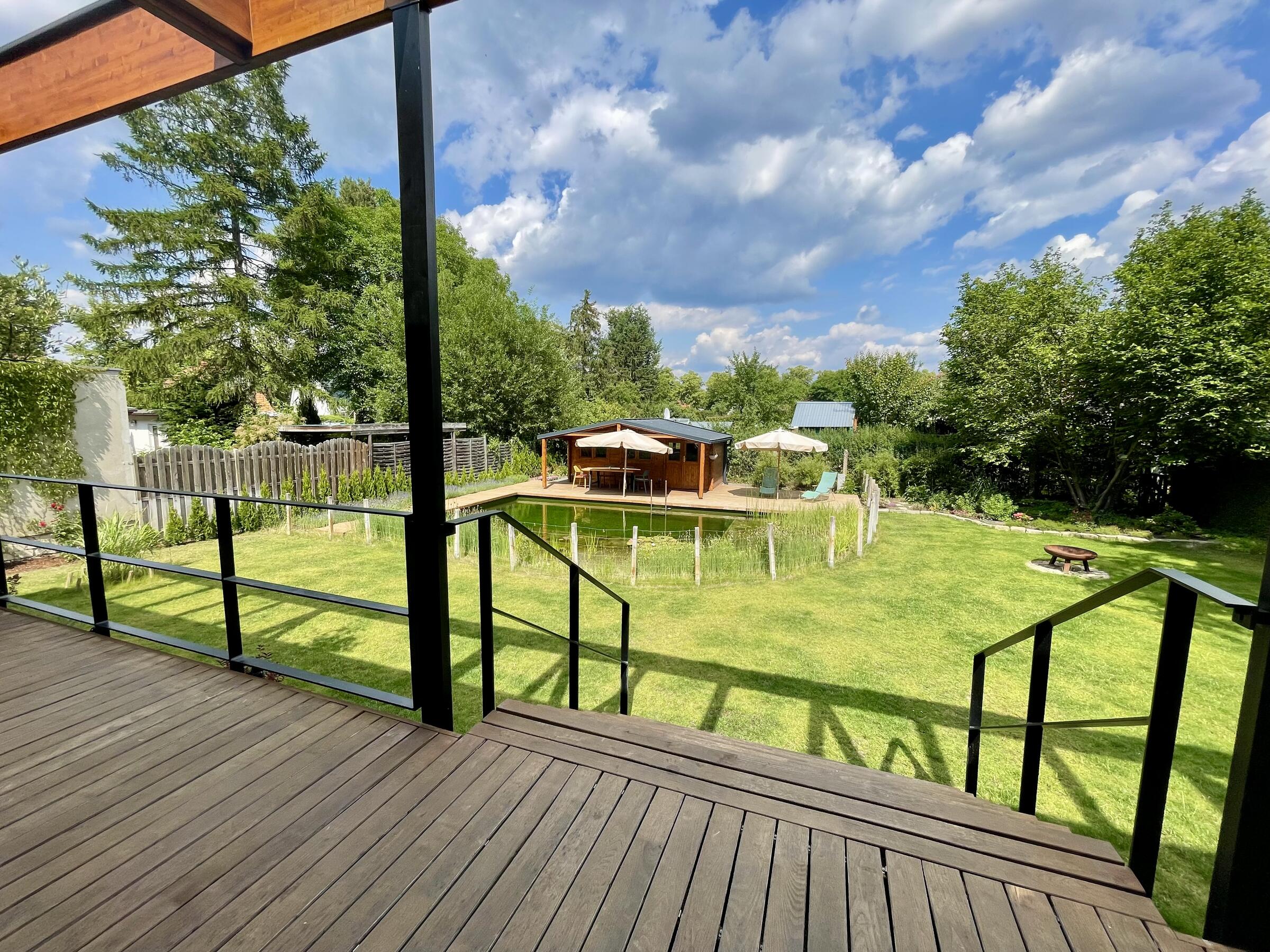 Das im Jahr 2019 im Bauhausstil errichtete Haus befindet sich in einer ruhigen Wohngegend. Der große Wohn- und Essbereich ist offen gestaltet und geht direkt in die modern ausgestattete Küche über. Durch die bodentiefen Fenster fällt viel Tageslicht in die Wohnräume. Die Fenster der Gästezimmer, des Schlafzimmers und des Musikstudios sind mit Blackout-Vorhängen ausgestattet. Die Fenster im Wohnbereich haben lichtdurchlässige Vorhänge. Die Möbel der Räume, außer des Musikstudios, dürfen ausgeräumt bzw. ausgetauscht werden. Im Außenbereich des Hauses gibt es einen Schwimmteich, einen Naturgarten, ein Saunahaus und eine umlaufende Terrasse, die alle Räume im Erdgeschoss miteinander verbindet. Auf dem Grundstück stehen 2 Pkw-Parkplätze zur Verfügung. Weitere Parkplätze gibt es auf der Straße vor dem Grundstück.