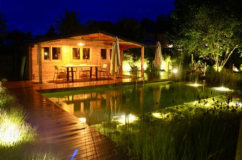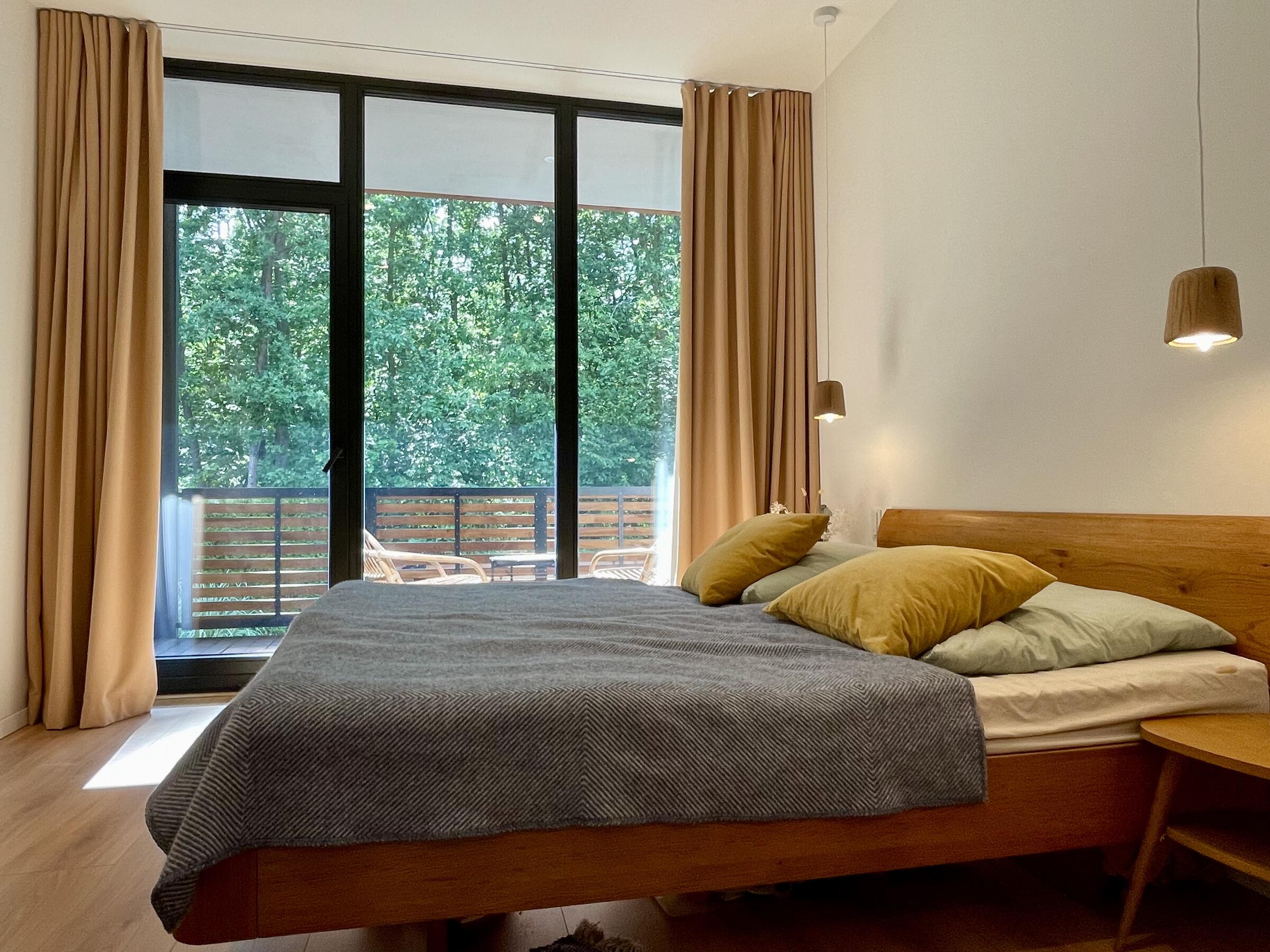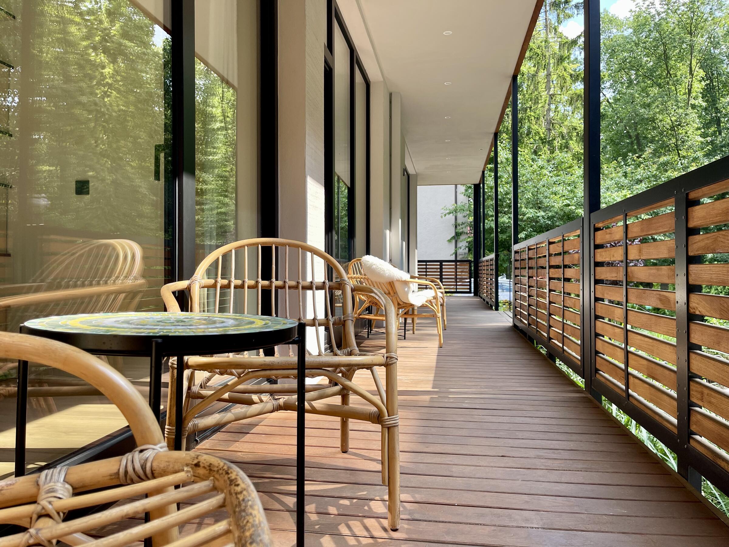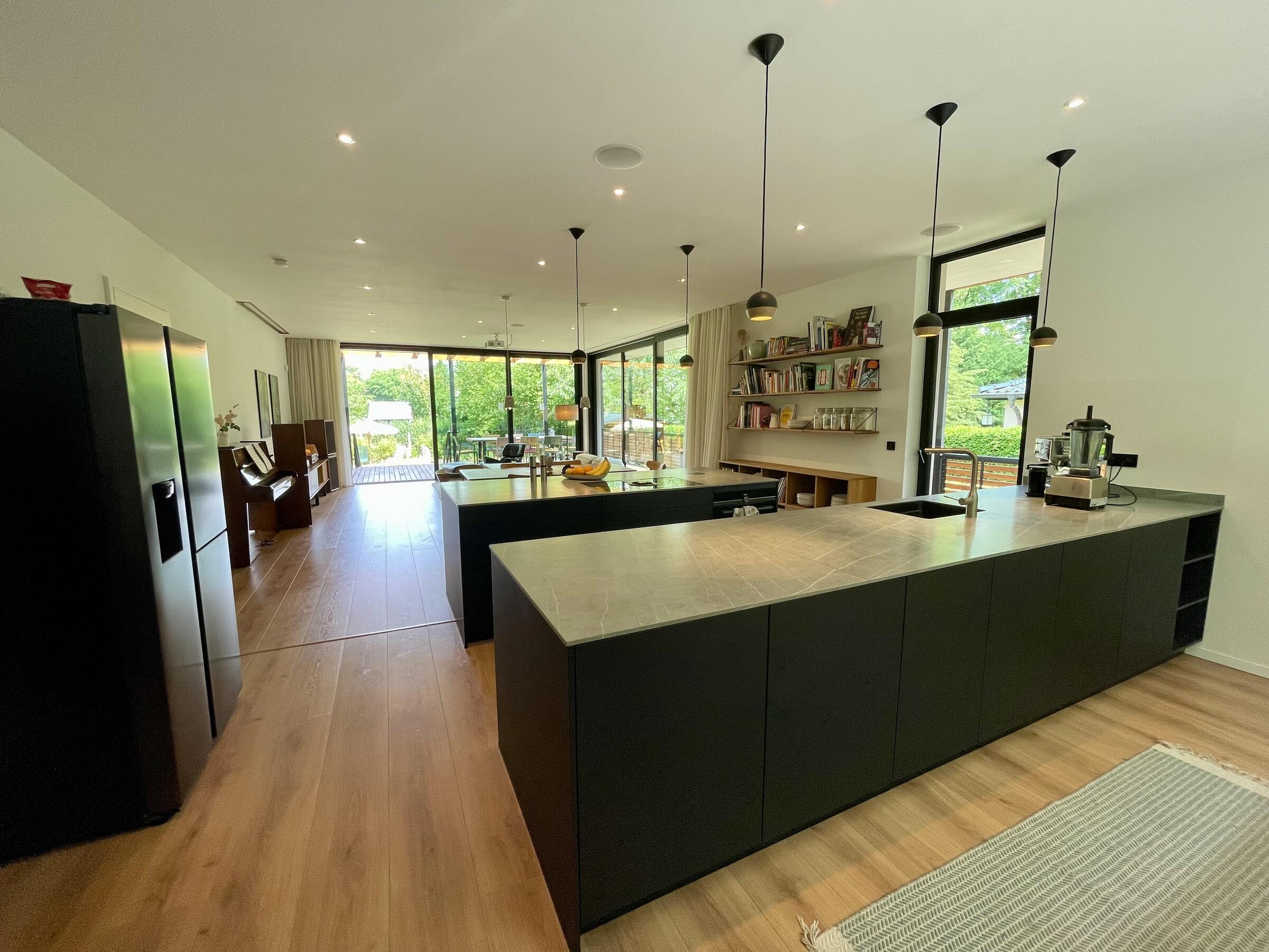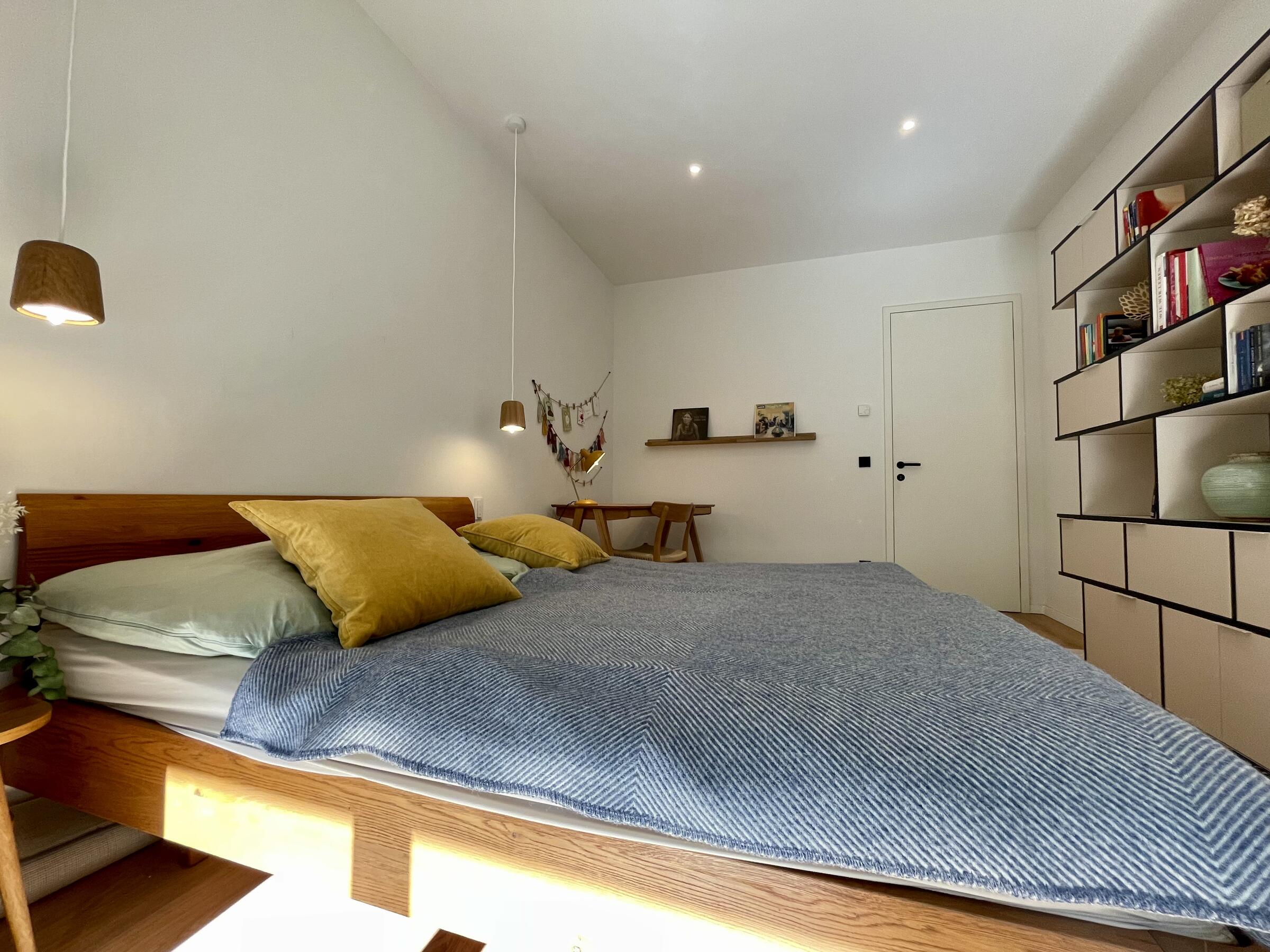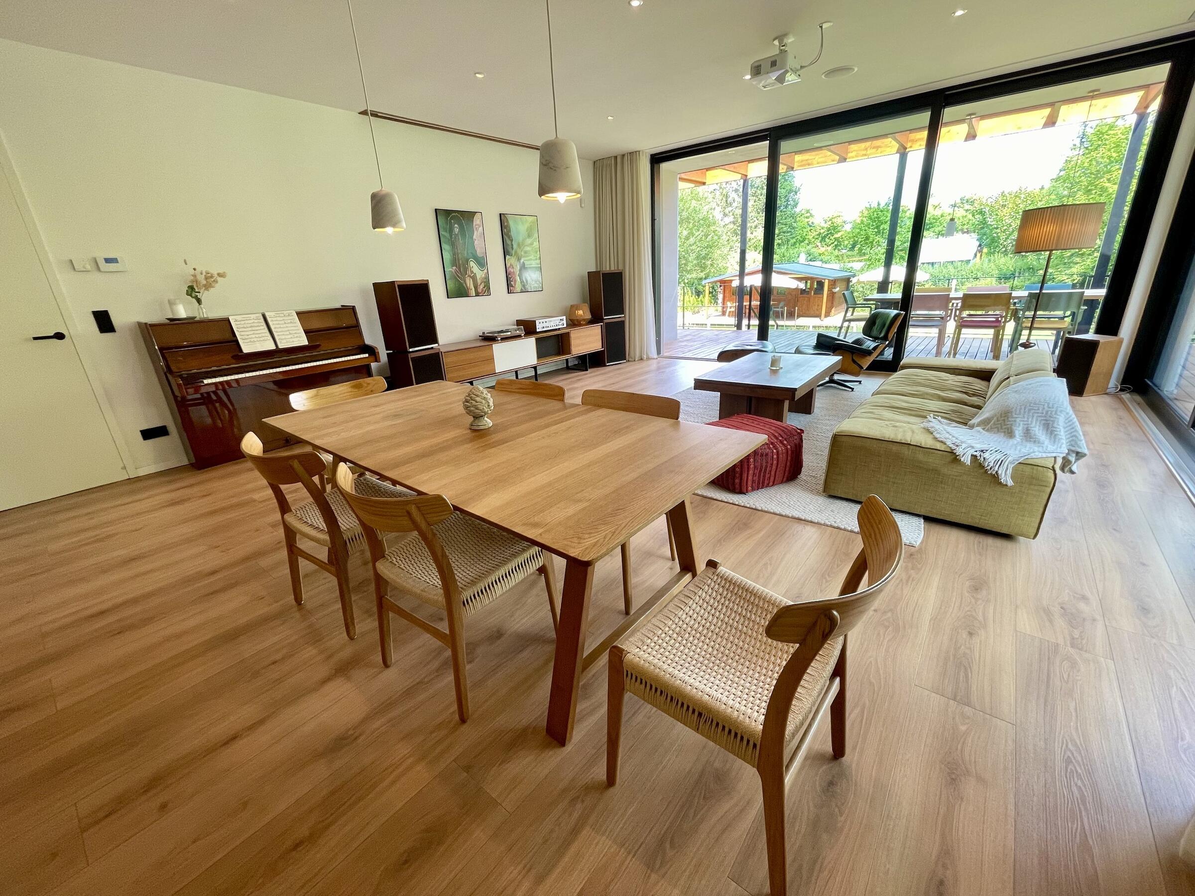 Das im Jahr 2019 im Bauhausstil errichtete Haus befindet sich in einer ruhigen Wohngegend. Der große Wohn- und Essbereich ist offen gestaltet und geht direkt in die modern ausgestattete Küche über. Durch die bodentiefen Fenster fällt viel Tageslicht in die Wohnräume. Die Fenster der Gästezimmer, des Schlafzimmers und des Musikstudios sind mit Blackout-Vorhängen ausgestattet. Die Fenster im Wohnbereich haben lichtdurchlässige Vorhänge. Die Möbel der Räume, außer des Musikstudios, dürfen ausgeräumt bzw. ausgetauscht werden. Im Außenbereich des Hauses gibt es einen Schwimmteich, einen Naturgarten, ein Saunahaus und eine umlaufende Terrasse, die alle Räume im Erdgeschoss miteinander verbindet. Auf dem Grundstück stehen 2 Pkw-Parkplätze zur Verfügung. Weitere Parkplätze gibt es auf der Straße vor dem Grundstück.