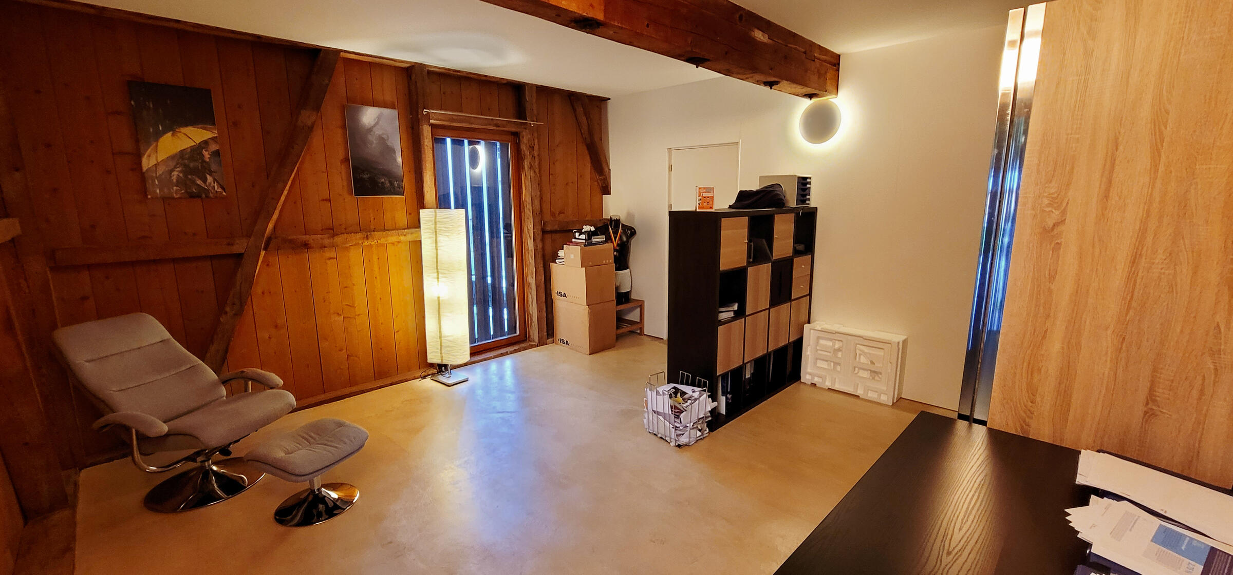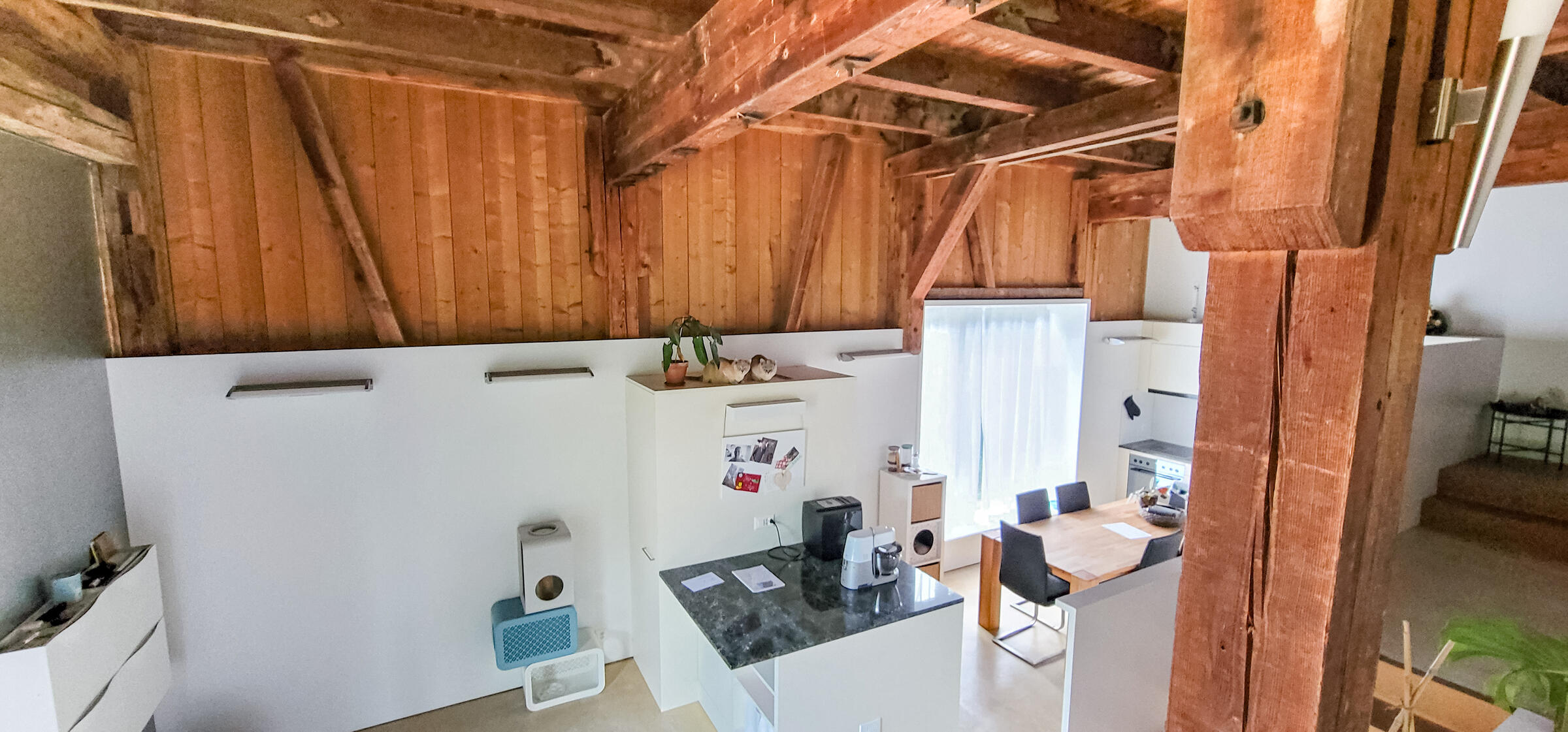 Meine Wohnung verteilt sich auf Erdgeschoss und 1. Obergeschoss. Im Erdgeschoss befinden sich ein grosszügiger Eingangsbereich, an welchem direkt die offene Küche anschliesst. Auf einer Zwischentage befinden sich zwei separate Zimmer. Von einem der Zimmer aus, kann direkt das Badezimmer mit WC und Dusche erreicht werden. Eine Holztreppe führt die zweite Etage, auf der sich ein zweites Bad mit Badewanne und ein grosszügiges Wohnzimmer befinden. Alle Räume verfügen über einen steinölversiegelten Anhydritboden und grosse bodentiefe Fenster (mit Ausnahme des Bades im 1. Stock, welches über ein Dachfenster verfügt) und damit über Tageslicht. Die Wohnung war ursprünglich Teil einer Brennerei, welche im Jahre 2004 umgebaut wurde. Die gesamte Balkenlage von damals wurde erhalten und gibt der Wohnung ihren Charme. Direkt vor dem Hauseingang befindet sich Platz für drei Parkplätze.