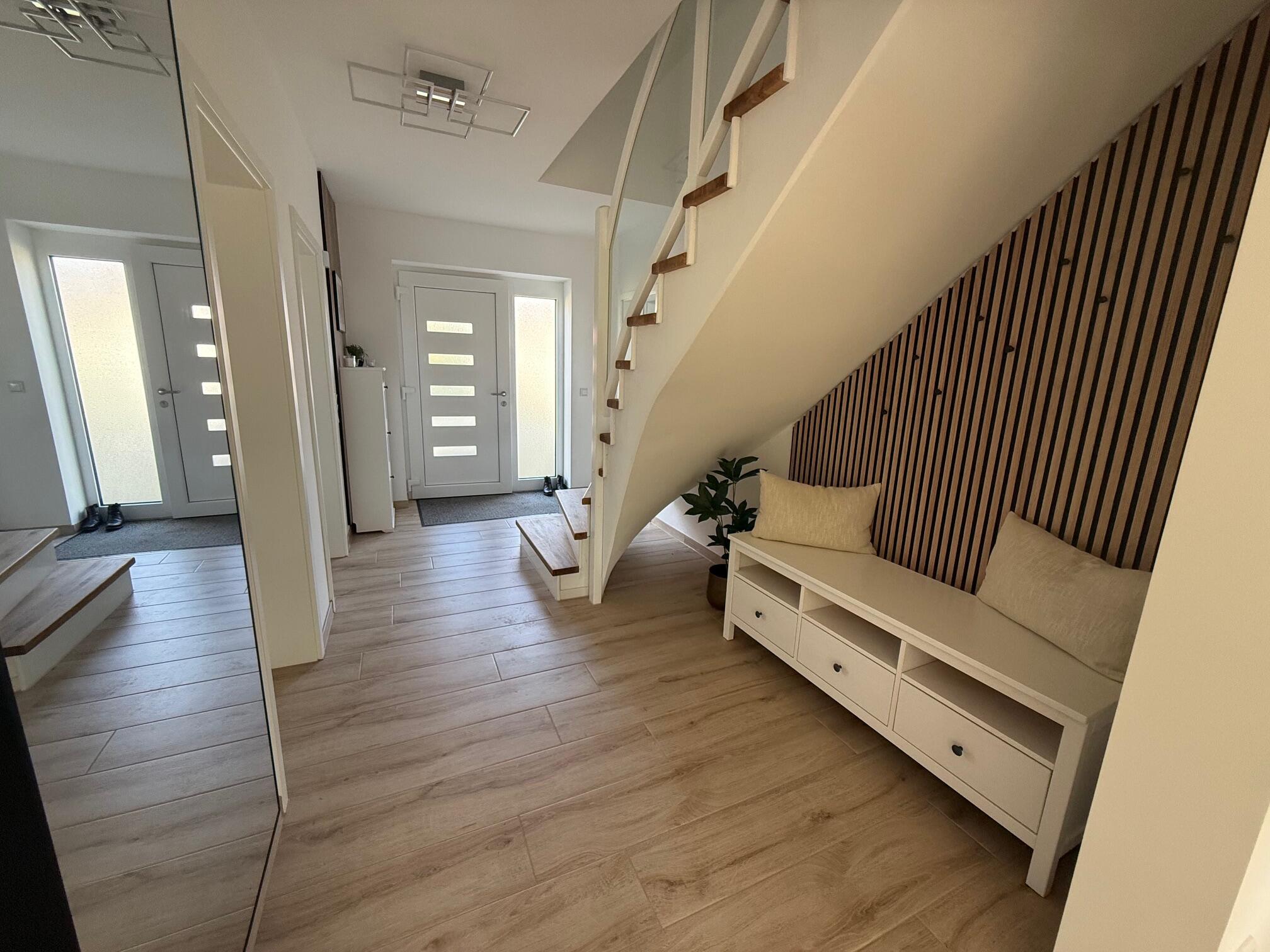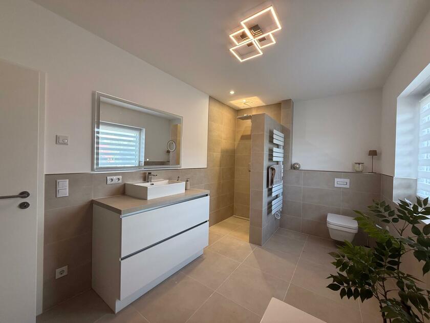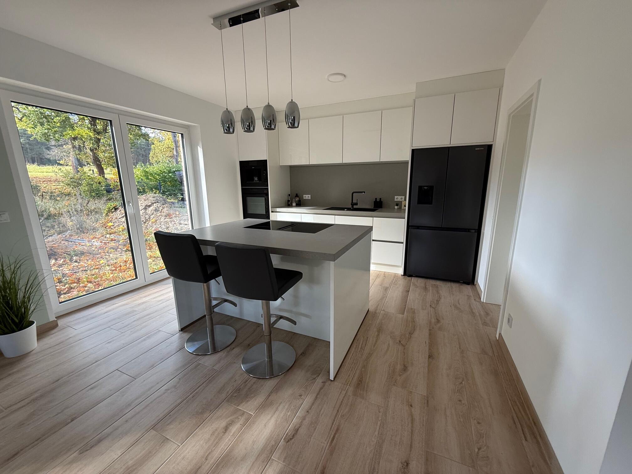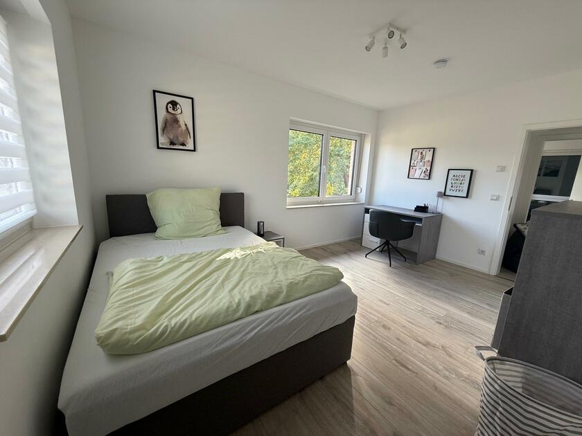 Unser Einfamilienhaus, ein moderner Neubau aus dem Jahr 2025, besticht durch seine helle und freundliche Atmosphäre. Große Fensterflächen sorgen ganztägig für eine angenehme natürliche Belichtung und lassen viel Sonnenlicht in die großzügige Küchen-, Ess- und Wohnlandschaft strömen. Die Räume sind offen gestaltet und bieten viel Platz für gemeinsame Aufenthalte oder kreative Arbeitsphasen. Das Haus ist mit hochwertigen Materialien ausgestattet: helle Böden, moderne Einbauten in der Küche und eine stilvolle, klare Linie prägen das Gesamtbild. Alle Fenster sind mit Jalousien ausgestattet, sodass die Räume bei Bedarf abgedunkelt werden können. Neben dem großen Wohnbereich stehen weitere Zimmer zur Verfügung, darunter ein Arbeitszimmer im Obergeschoss, das aktuell nicht möbliert ist und gern als Abstell- oder Vorbereitungsraum genutzt werden darf. Insgesamt bietet das Haus ein modernes, lichtdurchflutetes und komfortables Umfeld, das vielseitig genutzt werden kann.