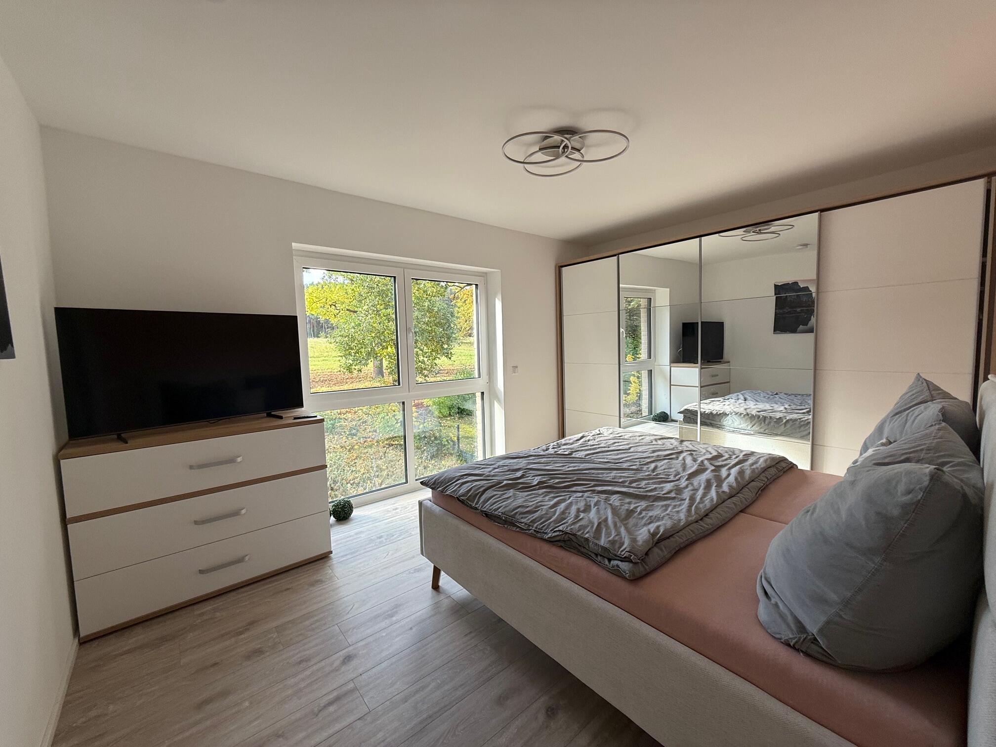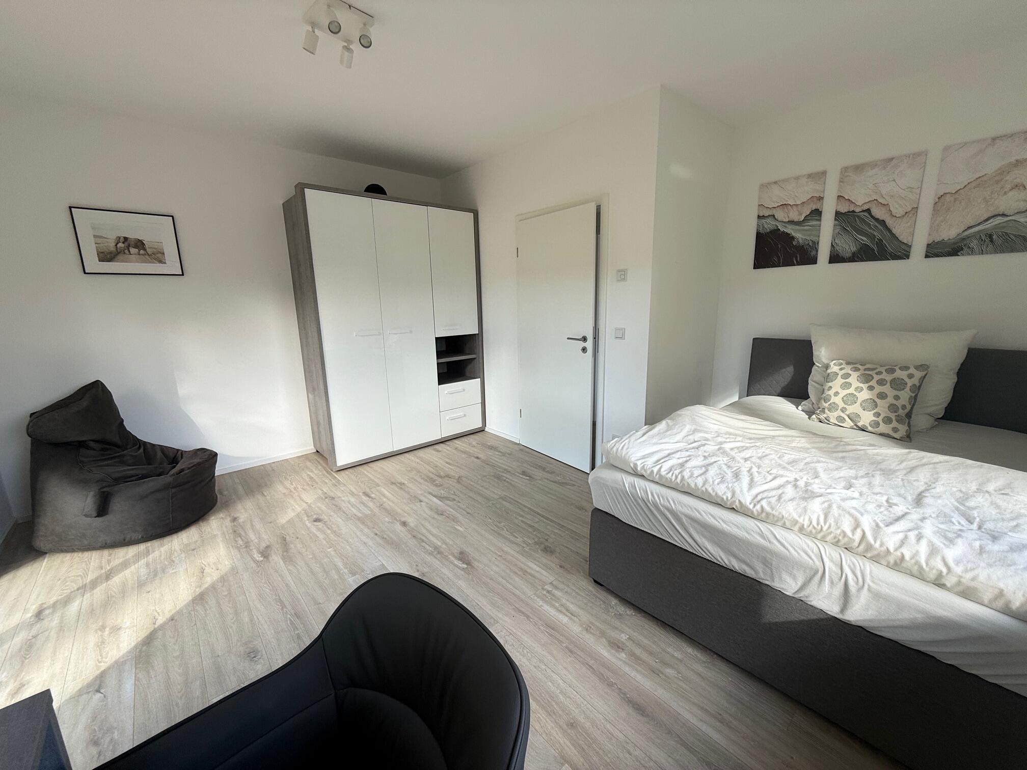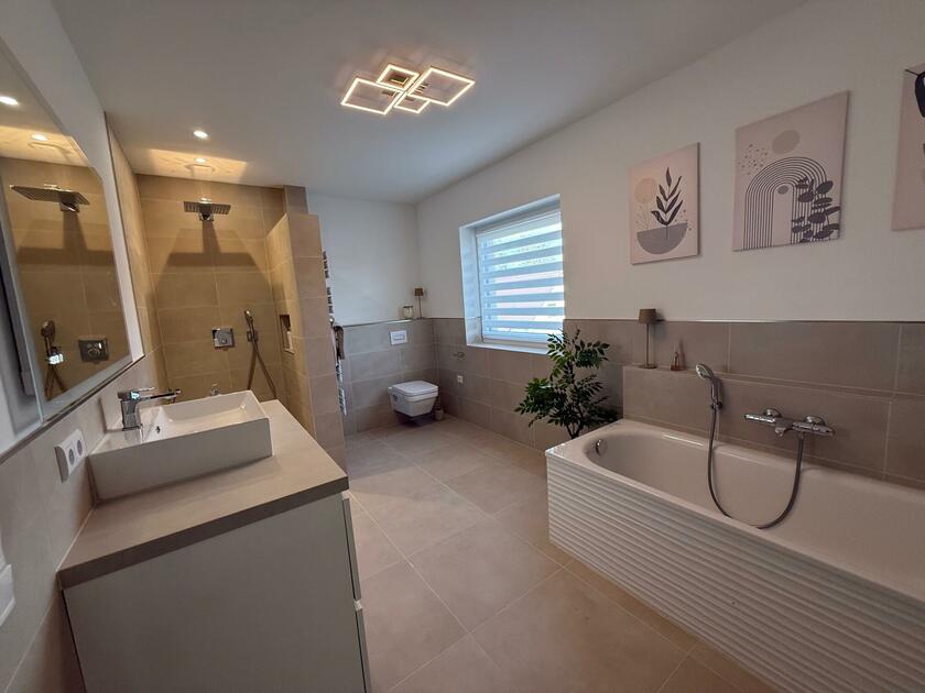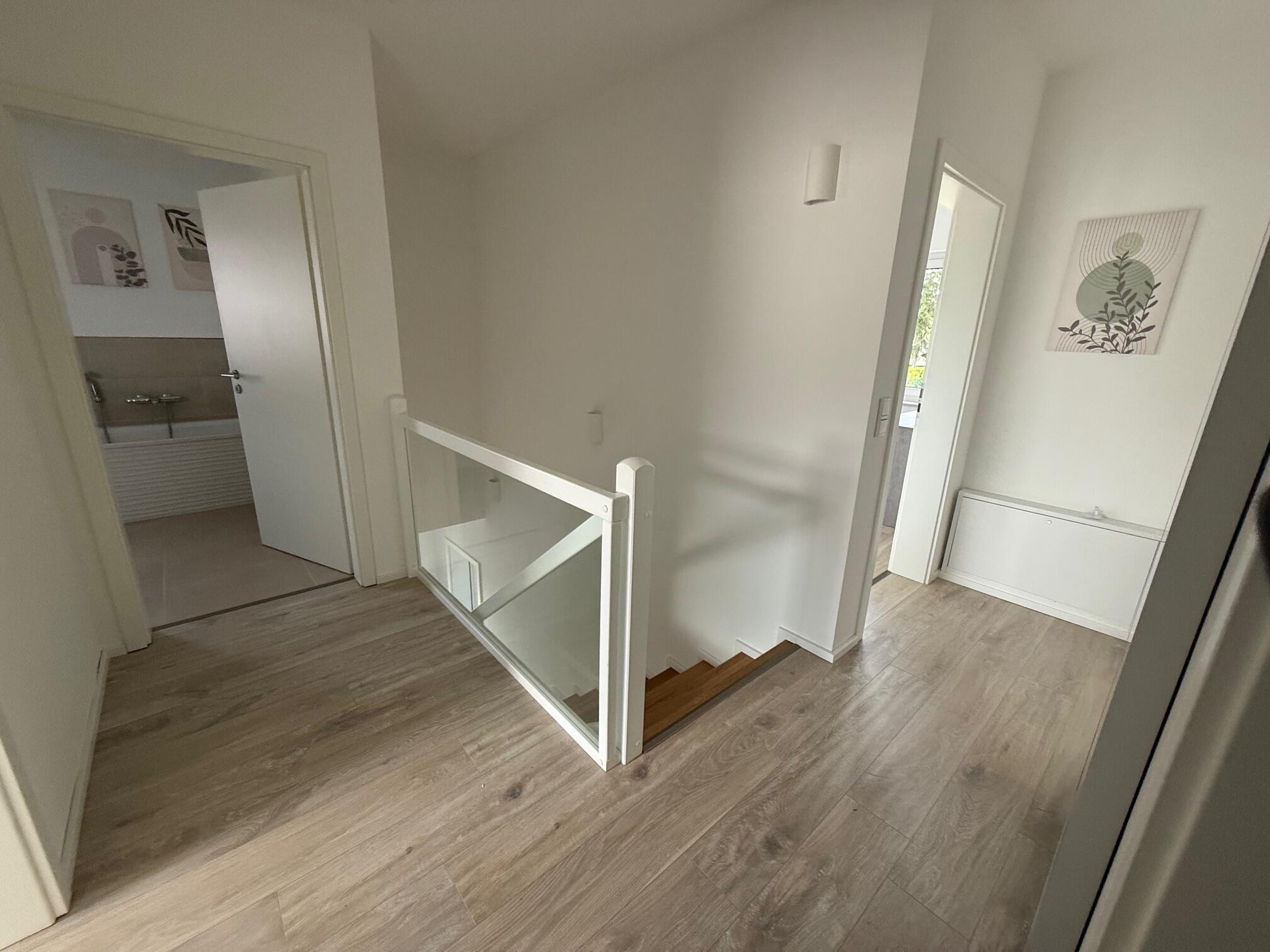 Unser Einfamilienhaus, ein moderner Neubau aus dem Jahr 2025, besticht durch seine helle und freundliche Atmosphäre. Große Fensterflächen sorgen ganztägig für eine angenehme natürliche Belichtung und lassen viel Sonnenlicht in die großzügige Küchen-, Ess- und Wohnlandschaft strömen. Die Räume sind offen gestaltet und bieten viel Platz für gemeinsame Aufenthalte oder kreative Arbeitsphasen. Das Haus ist mit hochwertigen Materialien ausgestattet: helle Böden, moderne Einbauten in der Küche und eine stilvolle, klare Linie prägen das Gesamtbild. Alle Fenster sind mit Jalousien ausgestattet, sodass die Räume bei Bedarf abgedunkelt werden können. Neben dem großen Wohnbereich stehen weitere Zimmer zur Verfügung, darunter ein Arbeitszimmer im Obergeschoss, das aktuell nicht möbliert ist und gern als Abstell- oder Vorbereitungsraum genutzt werden darf. Insgesamt bietet das Haus ein modernes, lichtdurchflutetes und komfortables Umfeld, das vielseitig genutzt werden kann.